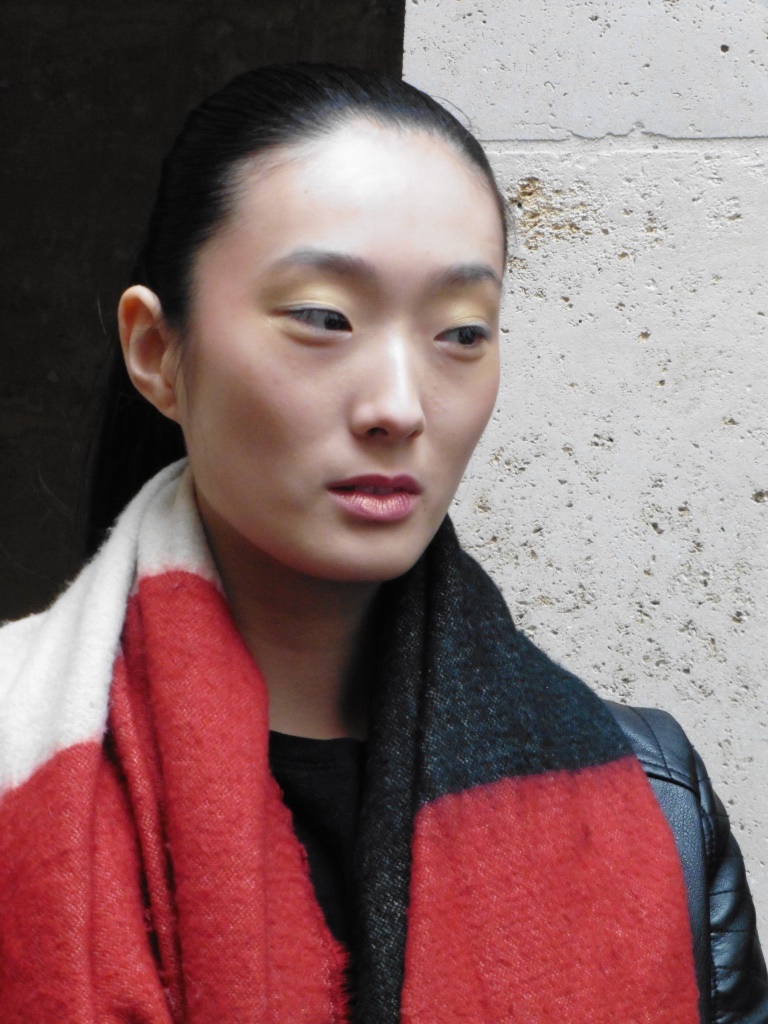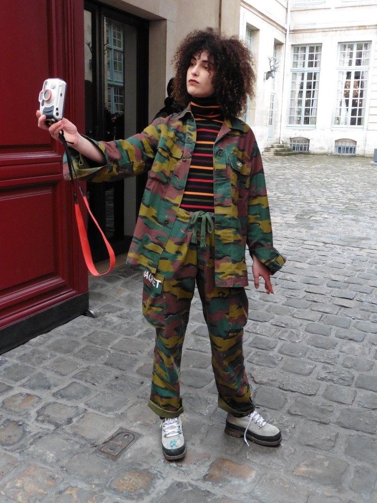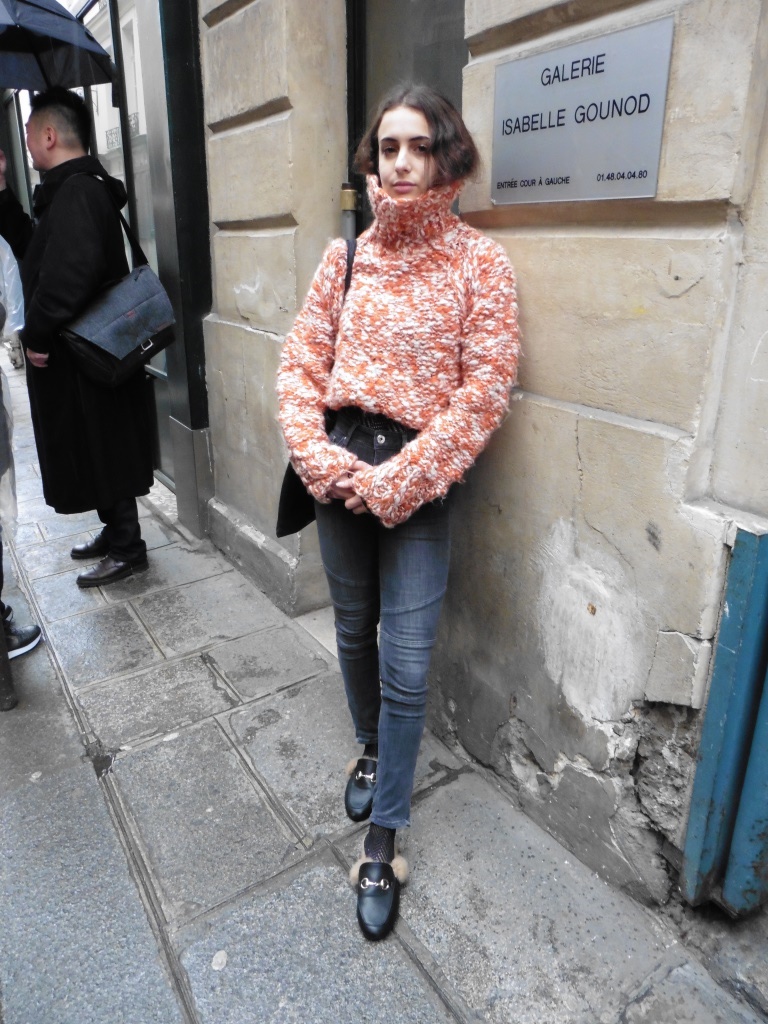 DEFILE LISELORE FROWIJN A LA GALERIE PAPILLON: la jeune créatrice néerlandaise a présenté une nouvelle collection sophistiquée et très colorée, d’inspiration cosmique et futuriste. Des vêtements à la construction complexe directement issus de l’imaginaire de la créatrice, non sans une certaine poésie. Pantalons extra-larges et écharpe en cachemire autour du corps, mais aussi leggings assortis avec des tenues aux manches amples. Poncho et capes en laine, vestes et manteaux matelassés en soie avec des imprimés stellaires, portés tout à la fois sur des leggings et sur des vêtements fluides. Gants dorés. Subtiles combinaisons de couleurs au sein desquelles le duo gris souris/rouge fonctionne à merveille, et où dégradés et rayures se marient avec délectation. Une grande impression de liberté se dégage de l’ensemble.