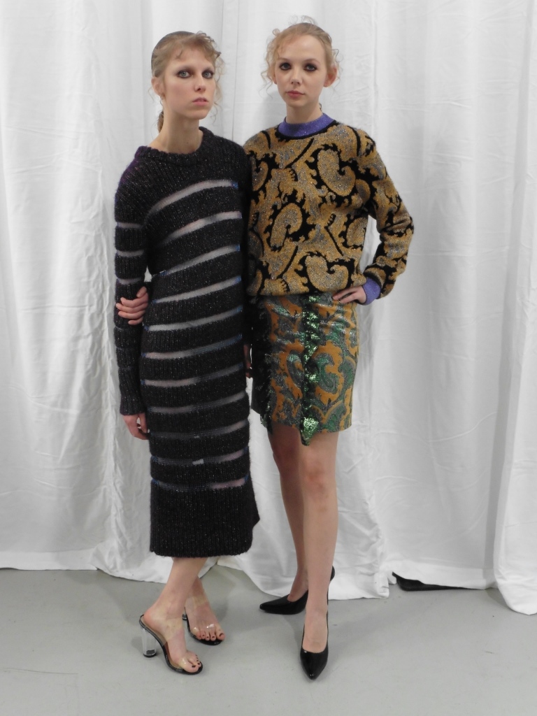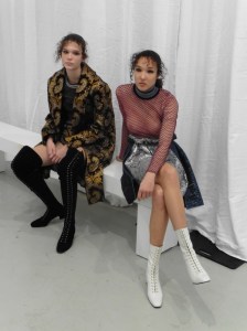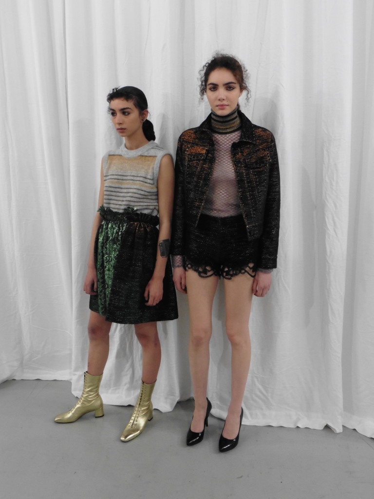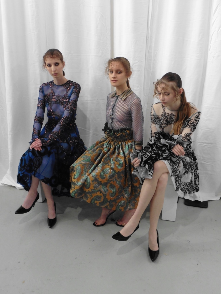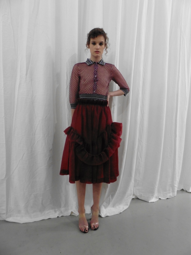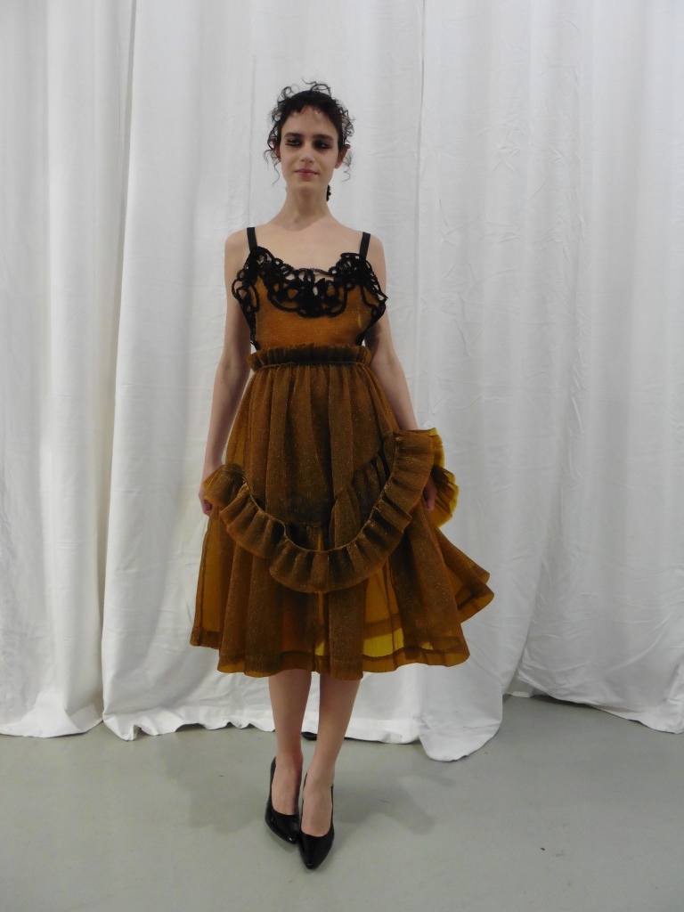 PRESENTATION JOURDEN AU PALAIS DE TOKYO: La marque Jourden, fondée en 2012 par la créatrice Anaïs Mak, originaire de Honk Kong, revisite les classiques féminins avec une certaine subtilité, en jouant sur les décalages. Cette nouvelle collection explore l’idée d’un baroque moderne, à base de silhouettes couture et de broderies précieuses. Les robent se parent de jupons et froufrous délicats. Mélanges de matières exubérants. Volumes ondulant autour de grands volants. Asymétries, motifs dentelle, rayures graphiques, effets de transparence. Les smocks, très présents chez la marque, structurent les jupes longues et les robes à volants. Un effet de collant résille est développé sur les modèles de chaussures créés pour la présentation. Il se dégage de l’ensemble un charme indéniable, empreint de romantisme.