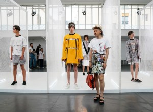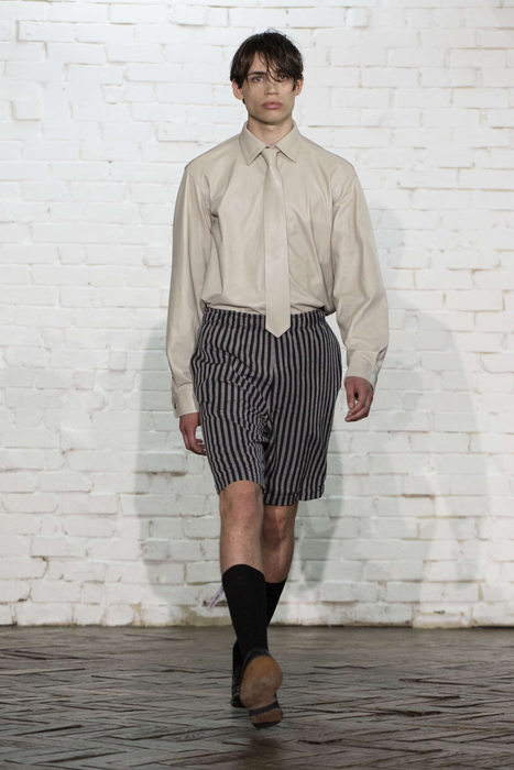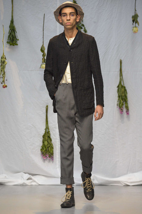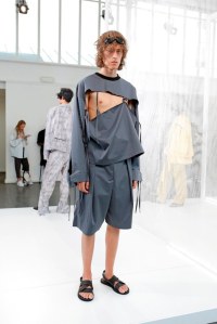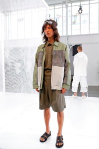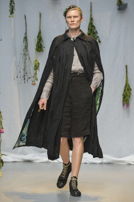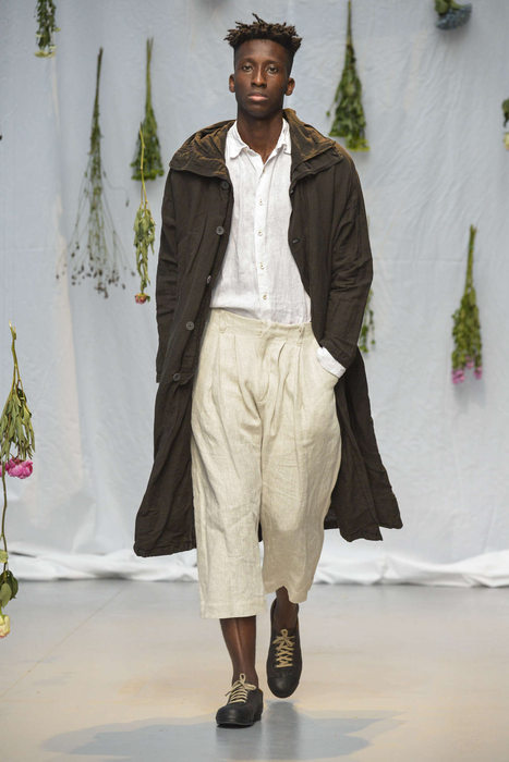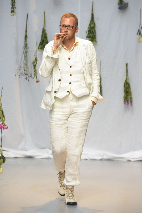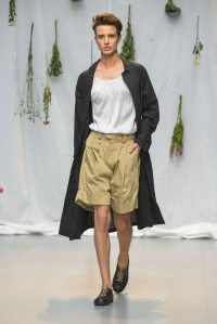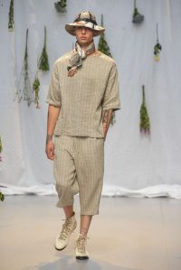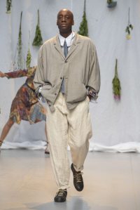 DEFILE GEOFFREY B.SMALL A L’ESPACE SAINT MARTIN: Pour fêter son centième défilé, et par voie de conséquence ses 25 ans de présentations à Paris, le designer américain installé en Italie a imaginé une collection très complète aux allures champêtres. Dans un décor de grands draps blancs ornés de fleurs suspendues, et accompagnés d’un violon et d’une danseuse, les mannequins ont dévoilé un ensemble de looks très variés dans des matières légères (lin, coton) pour les différents moments de la journée. Coupes amples ou plus resserrées tant pour les pantalons que pour les vestes. Les bermudas s’arrêtent au genou ou légèrement au-dessus. Les manteaux longs et capes paraissent très légers et fluides. Les couleurs sont sobres mais diverses (noir, beige, crème, gris clair ou foncé, bleu clair). Des rayures style banquier et quelques motifs floraux sur les chemises et foulards viennent égayer l’ensemble. Sur la tête: bobs, casquettes, chapeaux à larges bords apportent leur part de fantaisie. Une élégance toujours aussi romantique!