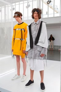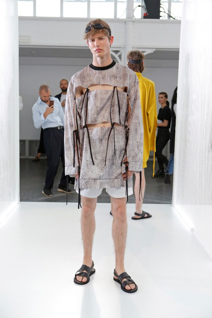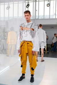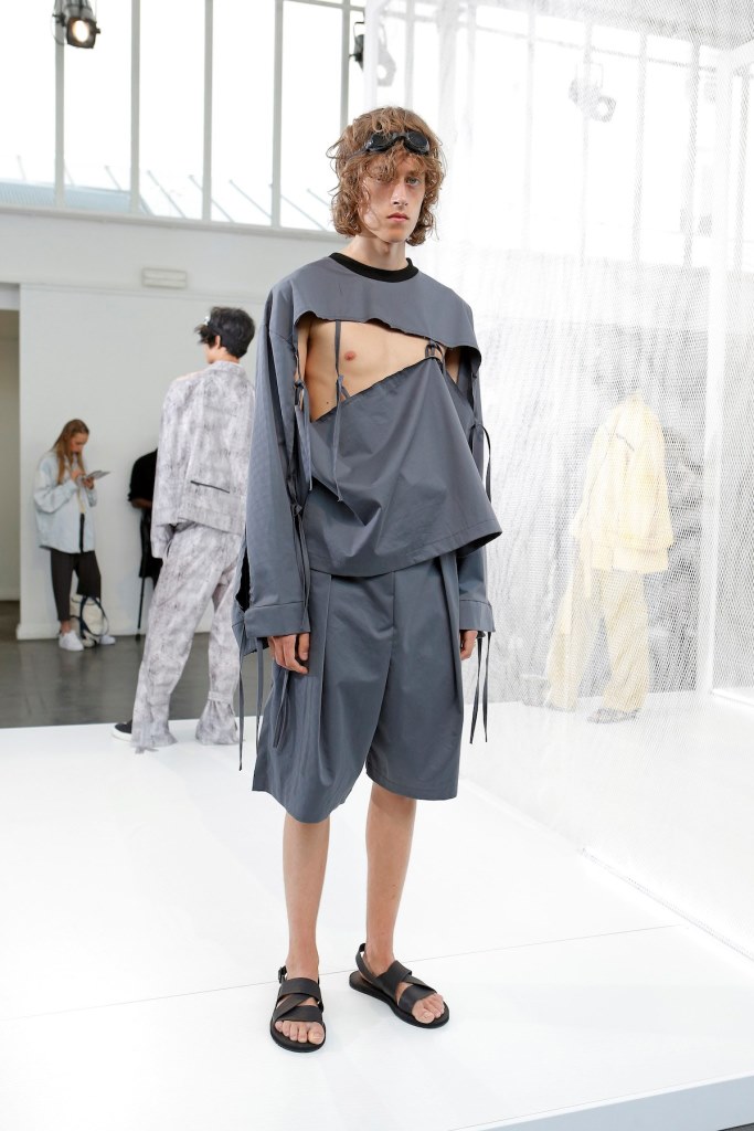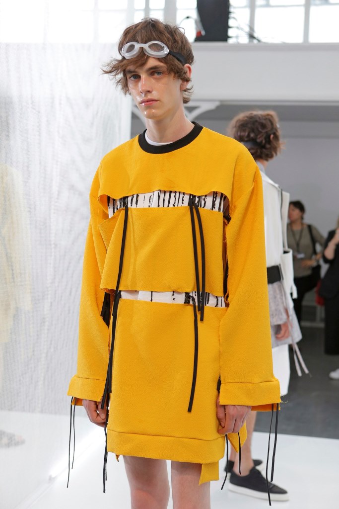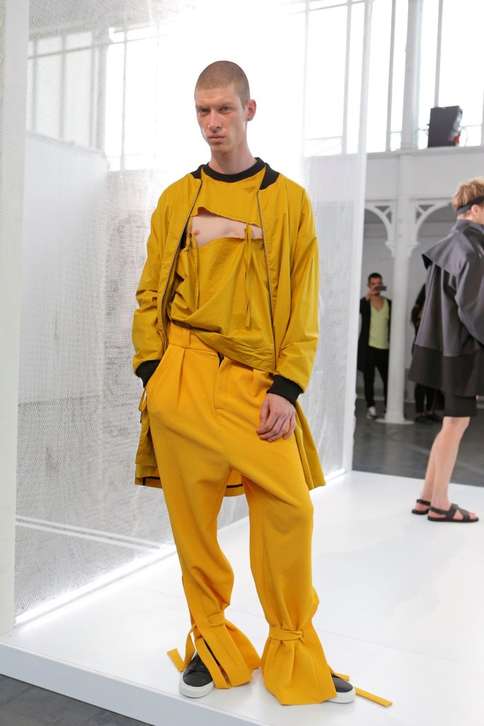 PRESENTATION HUGO COSTA A LA MAISON DES METALLOS: Pour cette nouvelle collection intitulée « Don’t Fish my Fish » le créateur portugais a trouvé son inspiration chez les « Moken », des gitans des mers vivant dans l’archipel des Mergui, un groupe de 800 îles désertiques en Asie du Sud-Est. Cette collection est ainsi une métaphore entre ces personnes libres et la société moderne peu respectueuse de certaines valeurs sociales et environnementales. Elle s’inspire de leurs tenues rafistolées et de l’univers de la mer pour présenter des looks contemporains, déstructurés et oversize, intégrant des matières très techniques. La palette de couleurs se décline autour d’une élégante combinaison de gris, blanc, noir complétée par un délicieux jaune vif. Superbe!