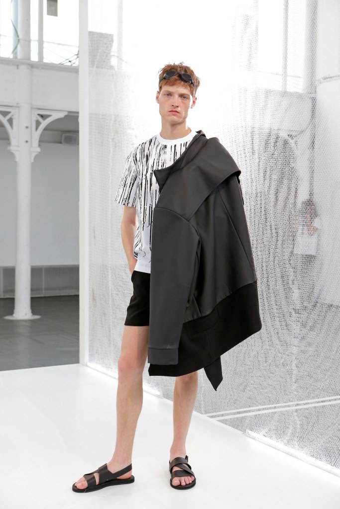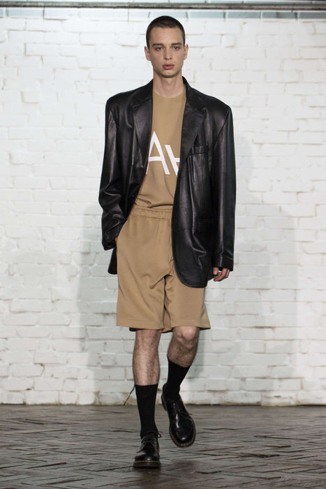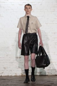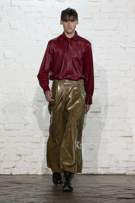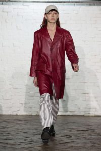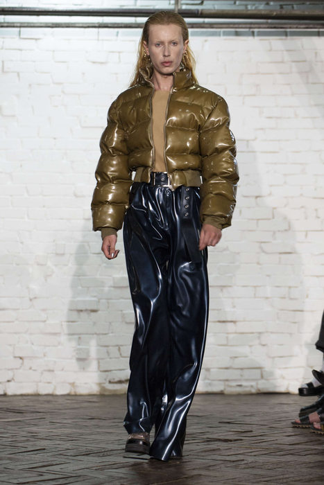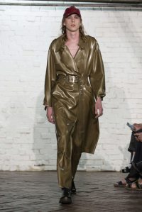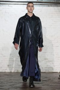 DEFILE ARTHUR AVELLANO AU GYMNASE TREVISE: Le jeune créateur français, âgé de 25 ans, a lancé sa marque en 2016 à la sortie de ses études. Pour ce premier défilé, il s’est inspiré du film culte de Joel Schumacher « Chute libre » qui raconte l’histoire d’un homme en rupture avec les faux-semblants de la société moderne. Toute cette collection est ainsi construite autour du latex dont le côté transgressif le fascine. Il le décline sur toutes sortes de pièces, allant du pantalon et du short au trench et autres bombers en passant par les vestes. En collaboration avec un laboratoire spécialisé et afin de le rendre portable et lavable en machine, il a développé sa propre matière, un latex hybride reprenant certaines caractéristiques du cuir. Au-delà de l’inspiration androgyne il cherche à habiller un homme audacieux, élégant et viril dont l’attitude et la personnalité font partie intégrante de la silhouette. La palette de couleurs est très engageante, en particulier le bleu foncé et le bordeaux très lumineux. Bravo et bonne chance l’ami!