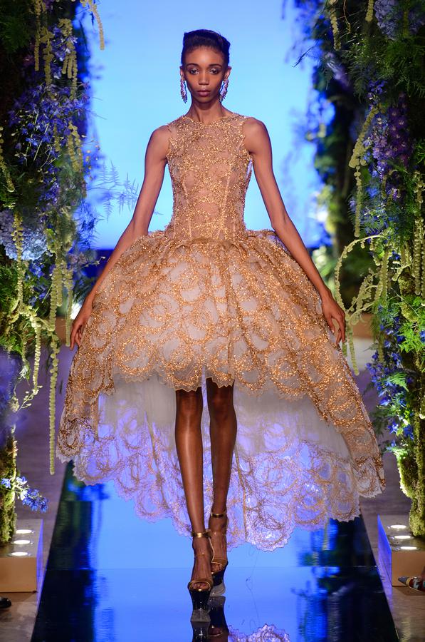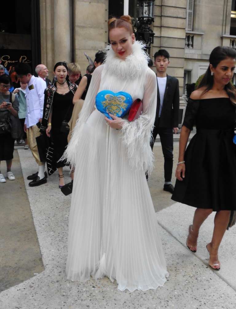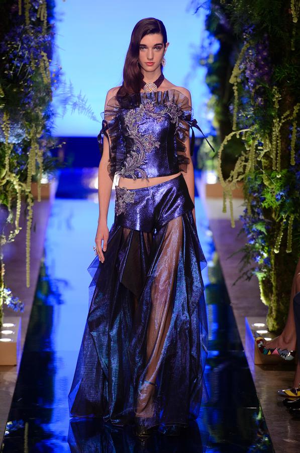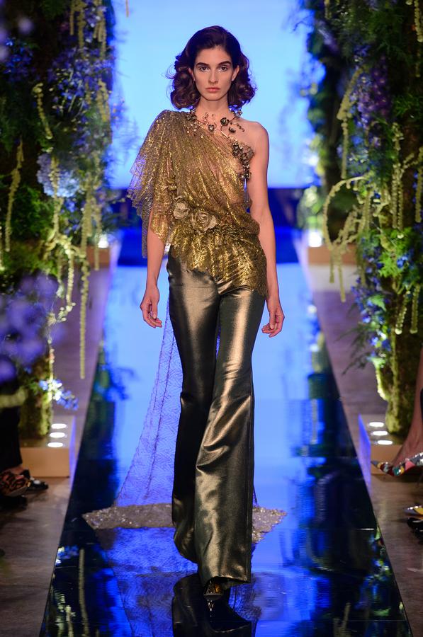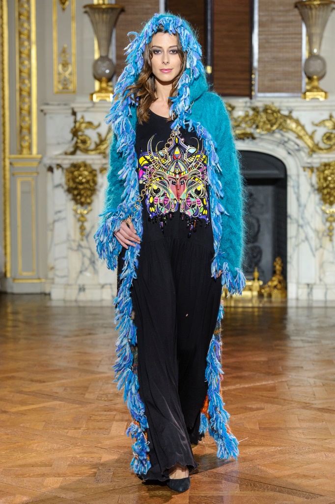 DEFILE EWA MINGE A L’HOTEL SHANGRI-LA: La créatrice polonaise a présenté une collection inspirée par les anciennes fables tziganes et leur monde enchanté, joyeux et dansant. Les silhouettes multicolores aux nombreuses superpositions, les détails et les accessoires évoquent l’univers riche et chantant de cette culture. De somptueuses robes longues, mais aussi des pantalons et des robes courtes qui apportent une touche de modernité. Un large éventail de matières: fourrure, soie, dentelle, tulle, organza, mousseline, cuir. De la transparence, des plumes et des motifs floraux pour le glamour. Les vêtements sont recouverts de broderies artisanales et de papillons, ces derniers ayant été réalisés par les « élèves » de la fondation Black Butterflies dans un cadre d’art-thérapie: sous l’oeil de la créatrice, des femmes qui se battent contre le cancer ont ainsi réalisé des « petites oeuvres d’art » à partir de perles. La créatrice a également fait défiler plusieurs mannequins « plus-size » afin de montrer que la beauté n’a pas de taille.
