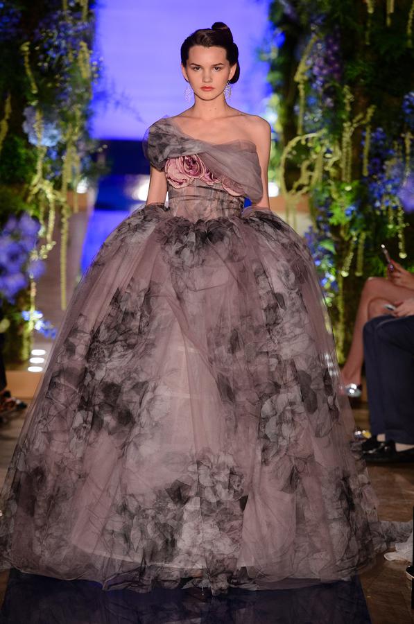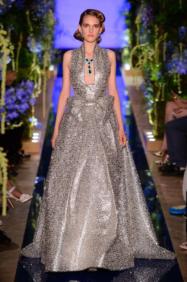 DEFILE GUO PEI A L’HOTEL SALOMON DE ROTHSCHILD: Pour cette quatrième collection présentée à Paris, la créatrice chinoise a choisi pour thème de rendre hommage à l’âge d’or de la Haute Couture, en y associant également la Haute Joaillerie grâce à une collaboration avec Caroline Scheufele, co-présidente et directrice artistique de Chopard. Dans un décor très fleuri, Guo Pei a ainsi présenté pas moins de 43 tenues somptueuses et ultra-féminines, les lignes classiques aux tissus délicats s’enrichissant de brillance métallique texturée, de couleurs moirées, de constructions et superpositions complexes donnant une impression d’illusion tout en gardant une grande fraîcheur. Broderies et perles sont toujours au rendez-vous, notamment des broderies en relief associées à de délicats ornements, qui sont sublimées par les opulentes parures de Chopard et nous offrent ainsi un mélange féérique de culture et d’esthétique chinoises et occidentales.