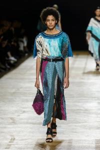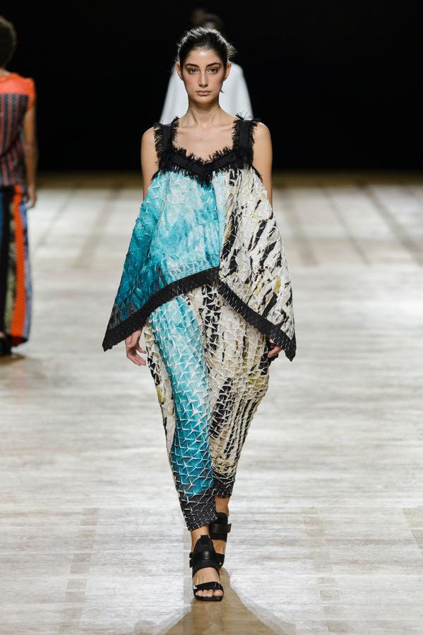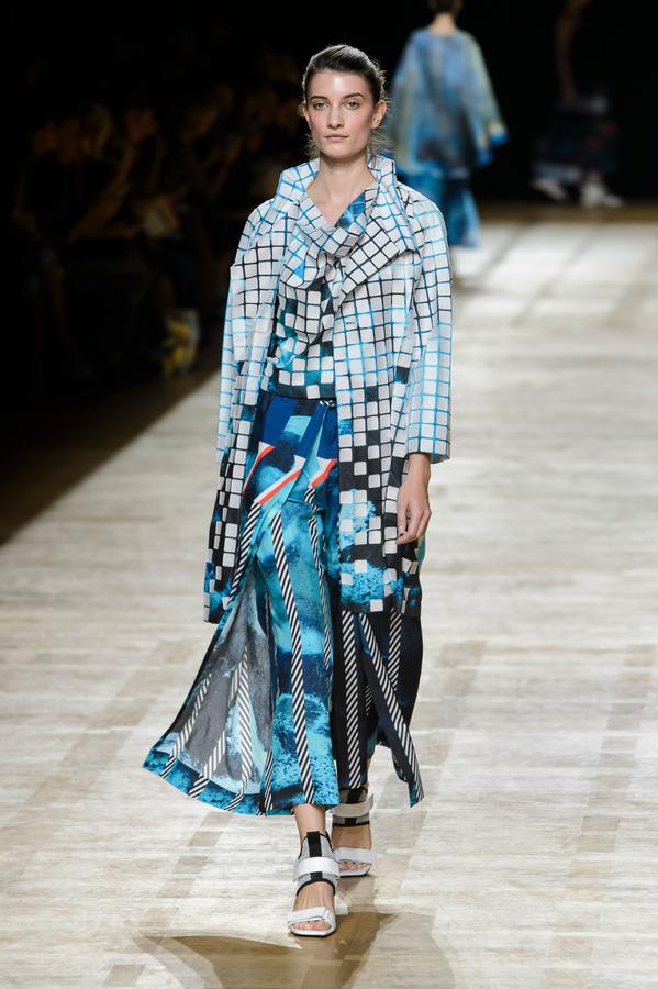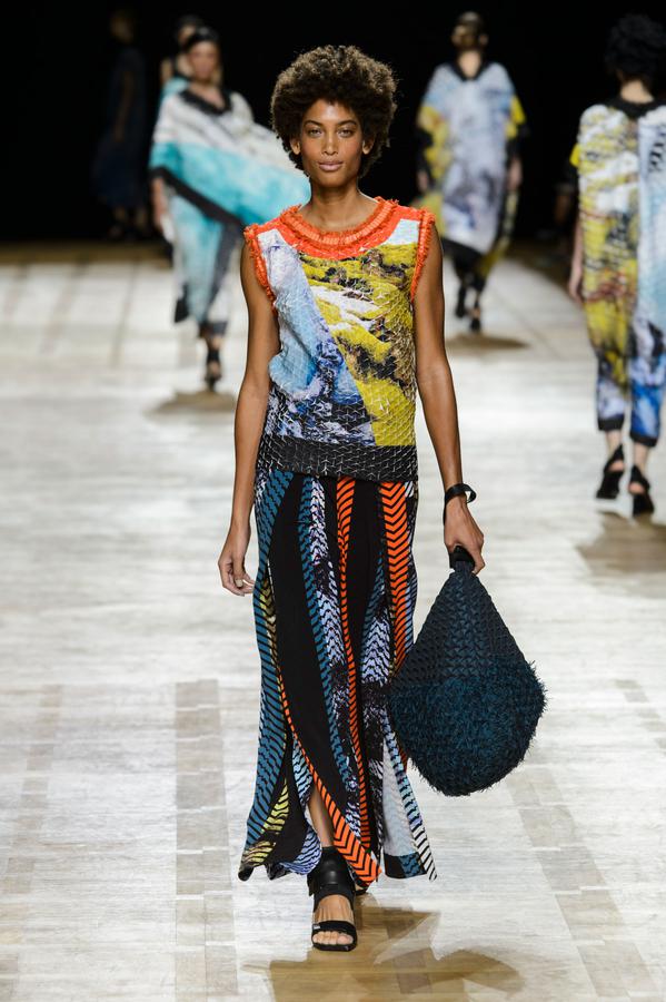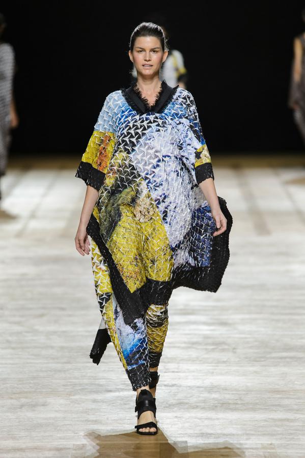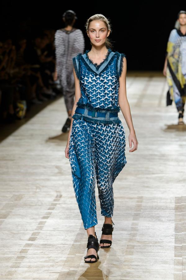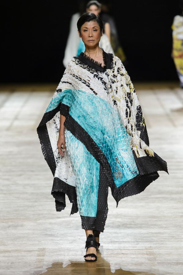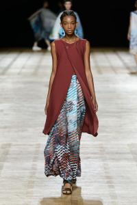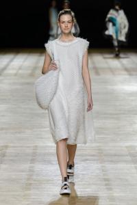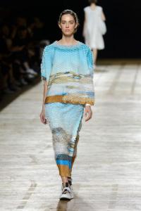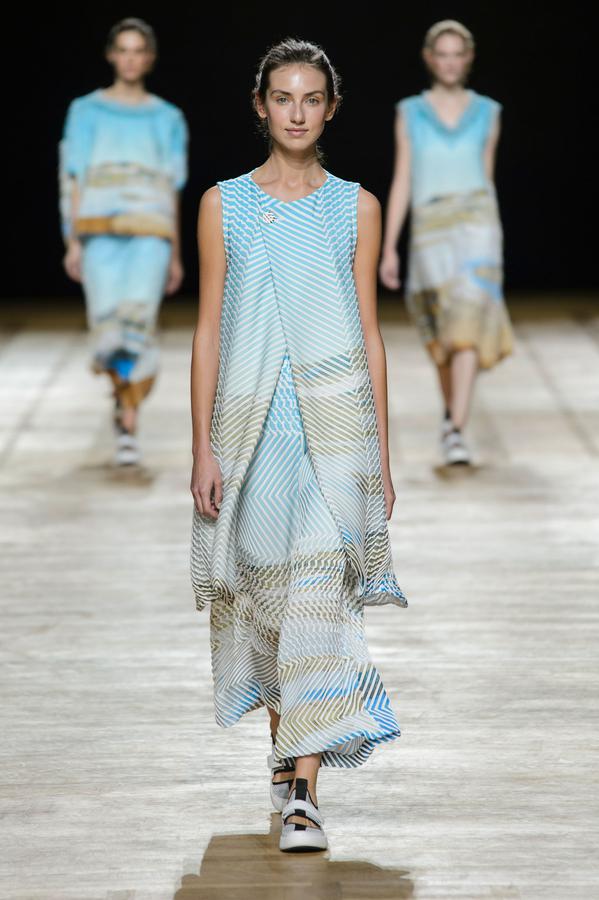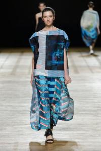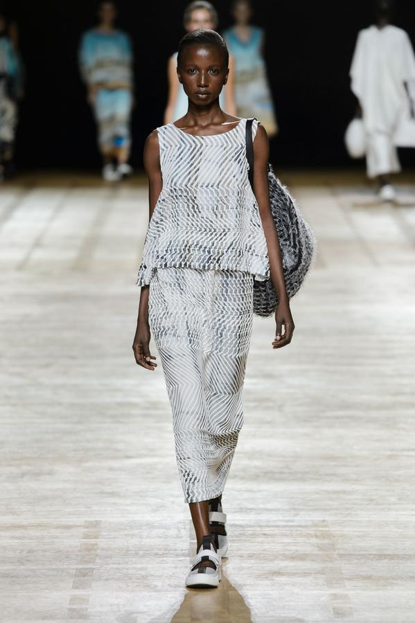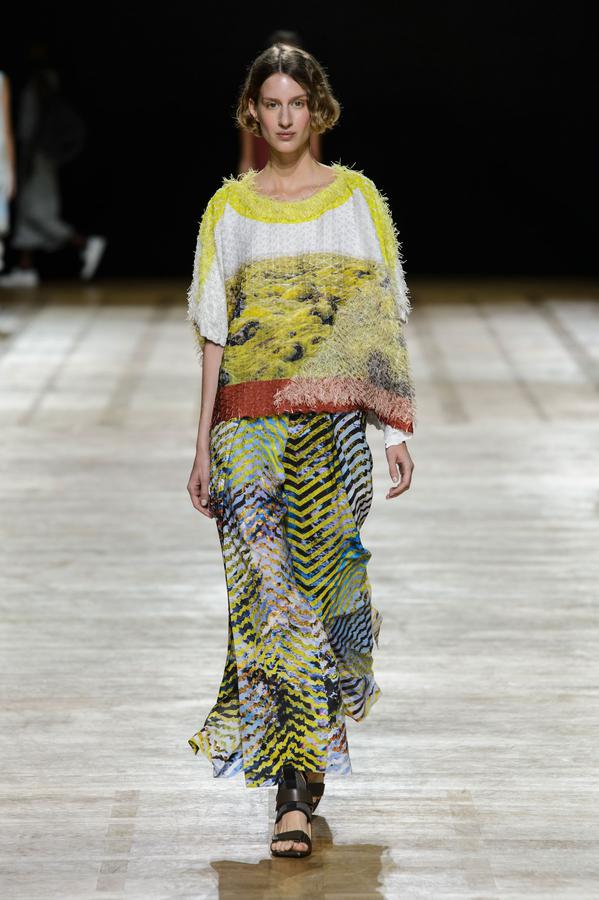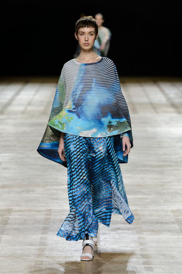 DEFILE ISSEY MIYAKE AU GRAND PALAIS: Pour cette nouvelle collection intitulée « A Piece of Memory » le designer japonais Yoshiyuki Miyamae a trouvé son inspiration dans des souvenirs de paysages d’Islande. La beauté et la magie de ces paysages sont ainsi traduits par une garde-robe tout en légèreté et fluidité, par des imprimés spectaculaires qui se laissent découvrir dans les plis irréguliers des vêtements. Sur une blouse on voit s’animer des roches volcaniques recouvertes de mousse scintillant sous les rayons du soleil. Sur une tunique on voit s’étendre à perte de vue des glaciers cristallins. La marque poursuit ses innovations technologiques. Les formes en trois dimensions obtenues grâce au Steam Stretch (technique utilisant la vapeur pour rétracter un fil élastique) sont aplaties cette saison pour apporter plus de douceur et de légèreté au tissu. La couleur marron d’une série de vêtements quadrillés est obtenue grâce à un pigment naturel extrait de la terre selon une technique traditionnelle d’une île du sud du Japon. Cette ode à la nature très émouvante célèbre dans une explosion de couleurs et de façon magistrale une certaine beauté intemporelle et universelle.