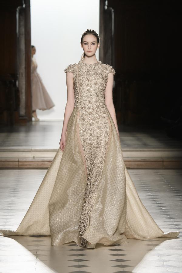 DEFILE TONY WARD A L’ORATOIRE DU LOUVRE: Inspiration « fractale » pour cette nouvelle collection, en référence à des motifs irréguliers répétés à l’infini sur des échelles différentes. Le créateur libanais reproduit ces motifs sur les robes, chaque répétition créant des contours uniques rappelant leur forme initiale, mais avec une multitude de différences infinitésimales. Les motifs sont réalisés à la main sur des robes majestueuses aux coupes et volumes variés, en dentelle, organza, tulle brodé ou satin en découpe laser. La palette de couleurs est délicate, allant du rose au crème en passant par le vert d’eau et le greige, adoucissant ainsi ainsi la force des détails des broderies.