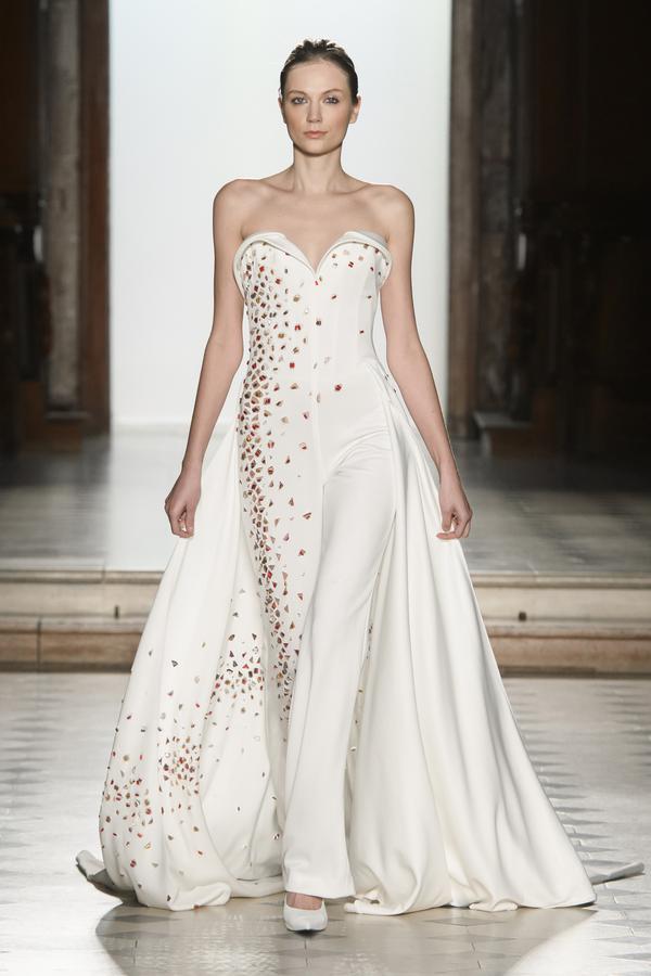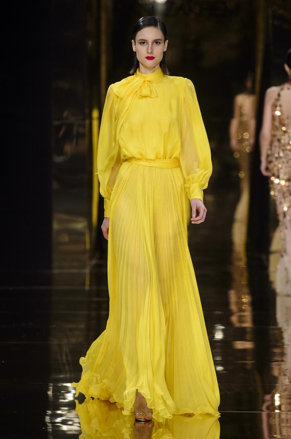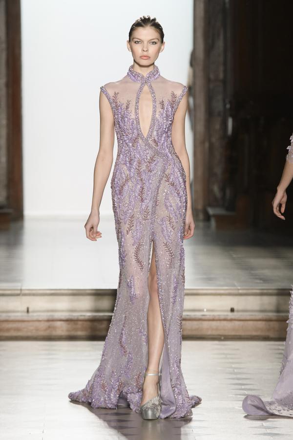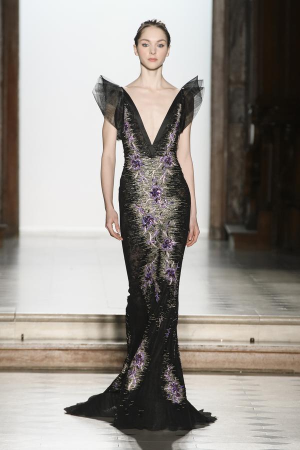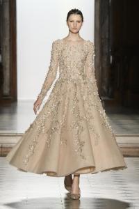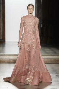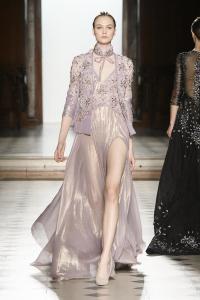 DEFILE RANI ZAKHEM A L’HOTEL WESTIN: Pour son premier défilé à Paris, le jeune créateur libanais célèbre la vie et la joie par des métaphores incandescentes: le feu est l’élément essentiel de cette collection tout à la fois somptueuse et décontractée, dédiée à une femme volcanique. Cascades d’or tracées par des broderies de cristaux arachnéennes sur un fourreau noir; robe de soie beige nacrée recouverte de gemmes rouges, orange et or; fourreau en mousseline doré à la feuille, au bustier noué en cache-coeur et au dos très décolleté. Les couleurs sont explosives. Les robes courtes alternent avec les robes longues aux drapés resplendissants. Plusieurs pièces sont des clins d’oeil aux maîtres qui ont inspiré le couturier: Guy Laroche, Jean-Louis Scherrer, Yves Saint Laurent, Balmain. Une synthèse moderniste et flamboyante des différentes cultures dans lesquelles a baigné le créateur, entre orient et occident.
