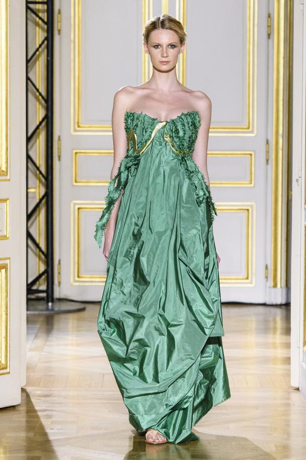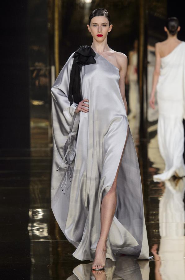 DEFILE LASKARIS A LA MAISON DES CENTRALIENS: Pour cette nouvelle collection le couturier grec a choisi comme muse la princesse Olympias, mère d’Alexandre le Grand, une femme forte et grande voyageuse. Toutes les pièces de la collection comportent une référence à la mythologie grecque et rappellent les costumes antiques des prêtresses. Plissés faits main comme des méandres, colonnes déstructurées, drapées de vraies pierres, de faisceaux de lumière, de cuir et de cuivre. Couleurs dominantes: le vert, l’ivoire, les pastels auxquels s’ajoutent quelques pointes de noir. Les sandales sont également fabriquées à la main, de façon traditionnelle, par la maison Laskaris.
