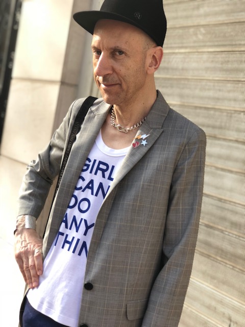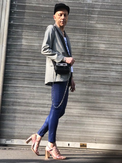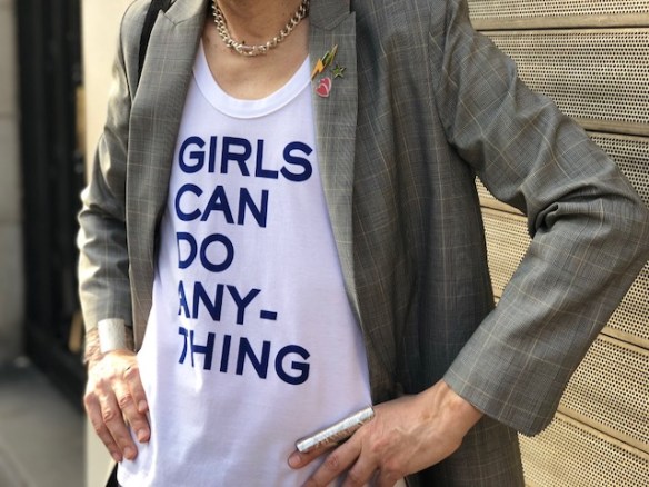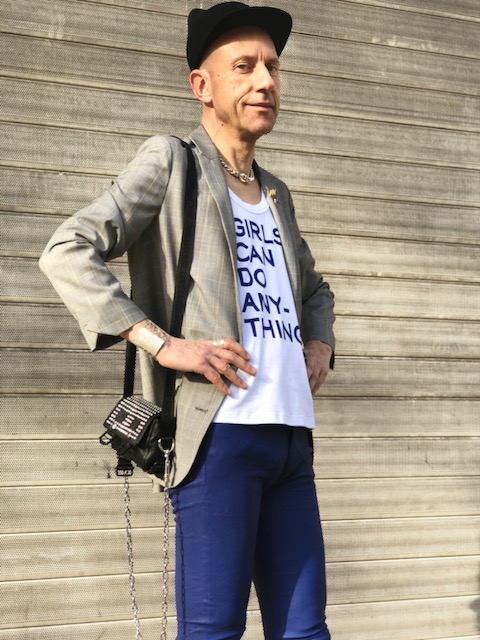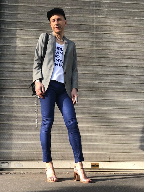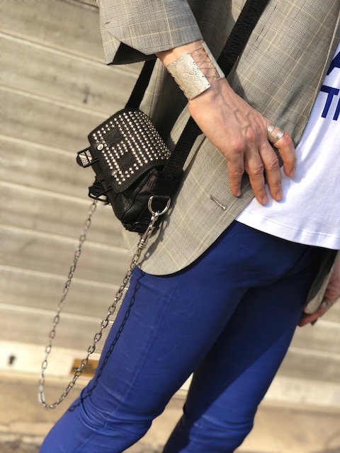 Un printemps à la météo capricieuse ne doit pas réfréner notre envie de renouveau et d’expression stylistique après un long hiver. Avec ce look composé en grande partie de pièces de la collection printemps/été 2018 de Zadig&Voltaire on joue sur une combinaison subtile de matières et couleurs raffinées. Pantalon en cuir stretch coloris bleu klein, veste longue style androgyne/boyish en laine prince de galles et au col agrémenté de pin’s colorés, débardeur en coton avec un slogan qui est tout un programme « Girls can do anything », petit sac/besace en cuir avec bandoulière en tissu et chaîne argentée, chaussures à talons dorés et lanières en cuir rose avec clous (dorés), le tout Zadig&Voltaire. Casquette Maison Michel. Collier en argent Clio Blue. Manchette et bagues argentées Clara Jasmine.