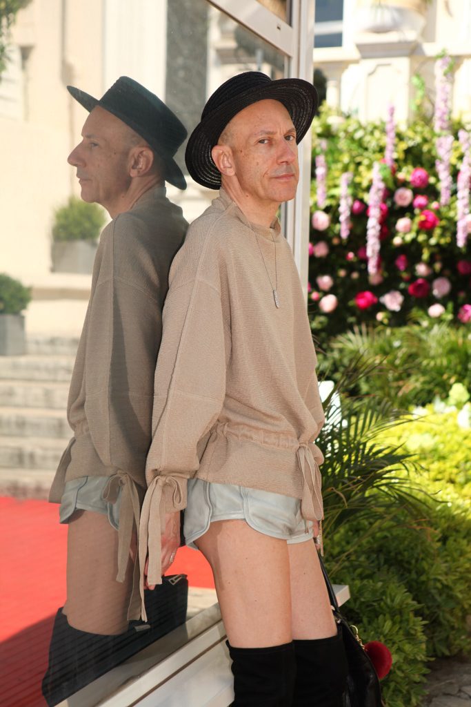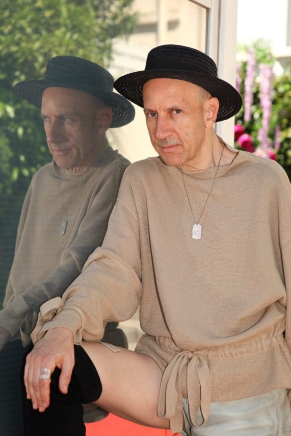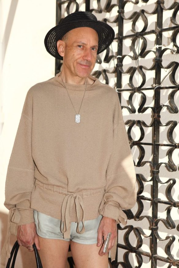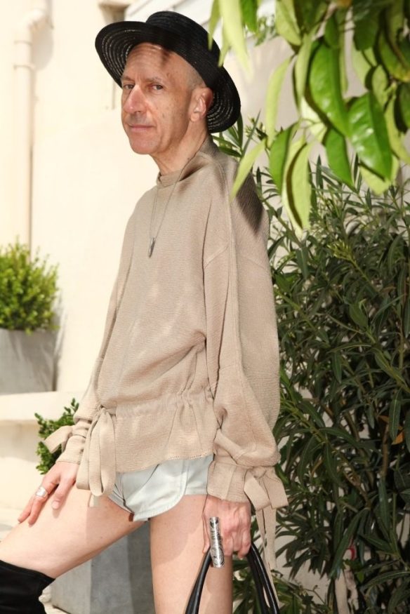 Pour ce look on reste dans un assortiment de couleurs délicates donnant une allure très chic à l’ensemble. La pièce de base est ce magnifique pull en coton lurex beige, lacé à la taille et aux poignets, avec col montant et manches amples très agréable à porter (pull « Pearl », Zadig&Voltaire collection printemps/été 2018). Egalement de cette collection ce superbe mini-short en cuir d’un très joli gris/vert donnant une touche vintage, et ce sautoir « Military » avec une plaque ornée de coeurs strassés d’esprit rock. Pour le reste: chapeau Maison Michel, bagues argentées Clara Jasmine, sac en cuir Zadig&Voltaire (collection antérieure), baskets/cuissardes souples en suede Ash.