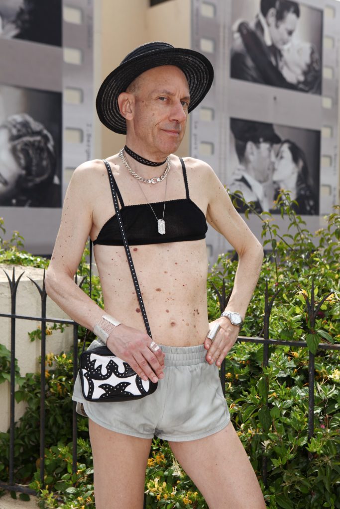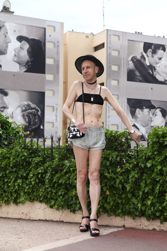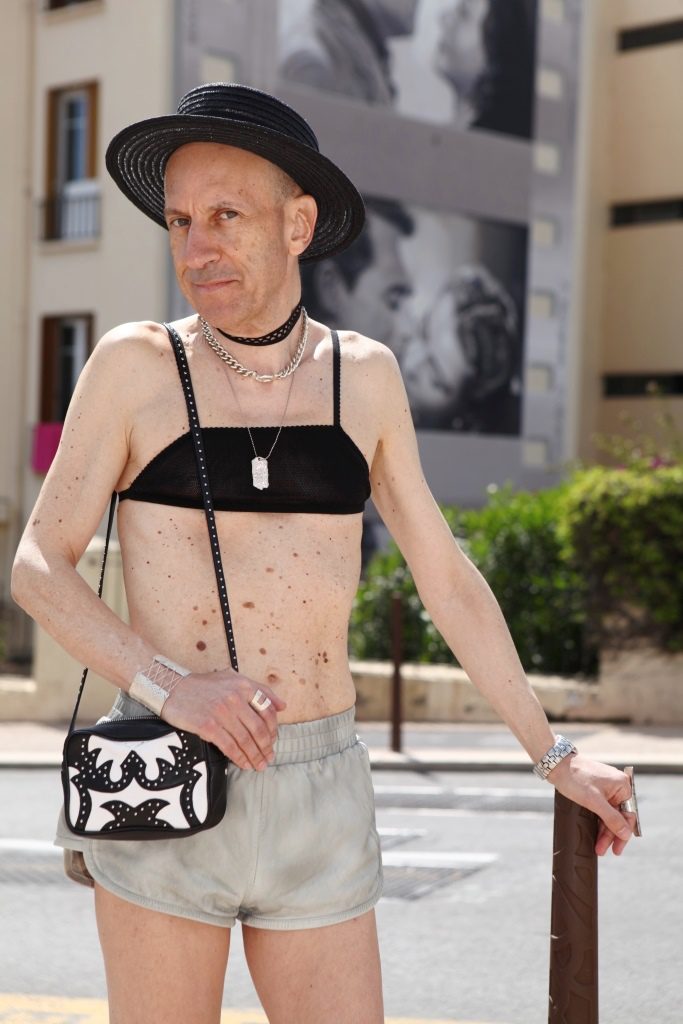 Une variante du précédent look avec encore un peu moins de tissu, mais là je pense être arrivé au minimum! L’occasion de présenter ce soutien-gorge expérimental conçu spécialement pour moi par Virginie Rouffignac, créatrice de la jeune marque de lingerie pour hommes et femmes Nonos Lingerie, qui mérite vraiment d’être découverte (www.nonoslingeries.com). Mesdames, vous pourrez assortir un joli soutien-gorge en dentelle noir avec un short en cuir ou en jean, histoire de jouer avantageusement (et délicieusement) sur l’opposition des matières. Mini-short en cuir et sautoir: Zadig&Voltaire collection printemps/été 2018. Choker: H&M. Collier ras-du-cou en argent: Clio Blue. Chapeau en paille: Maison Michel. Manchette et bagues argentées: Clara Jasmine. Mini-sac à bandoulière en cuir clouté: Zadig&Voltaire (collection antérieure). Chaussures à talons larges en cuir verni: What For.