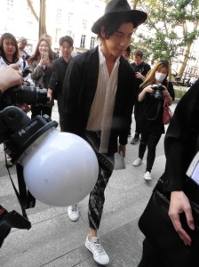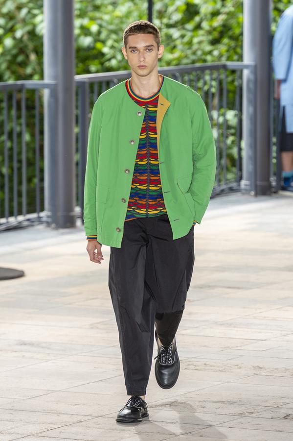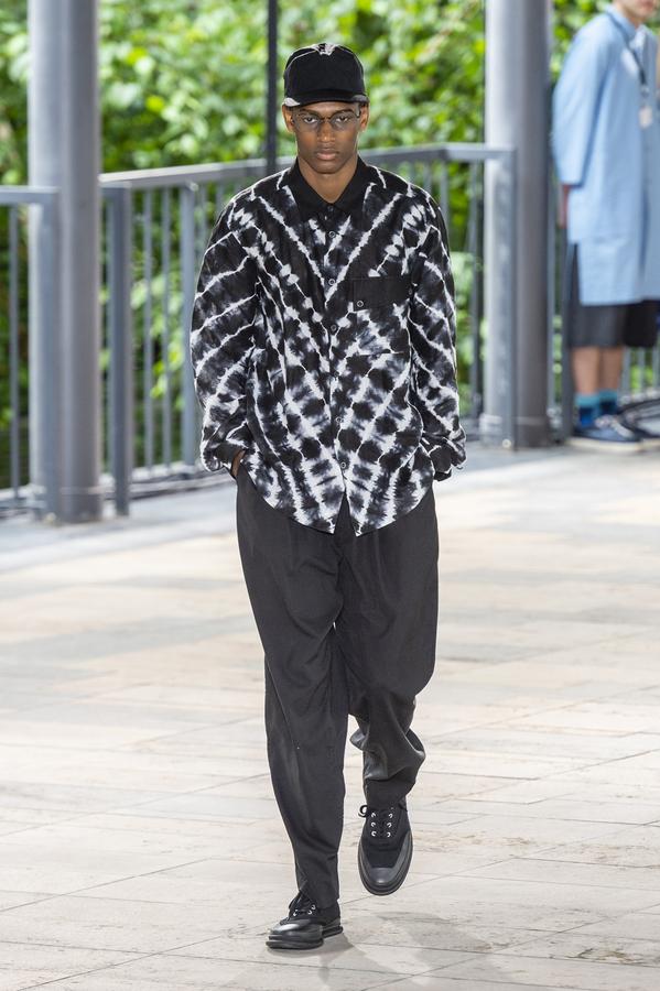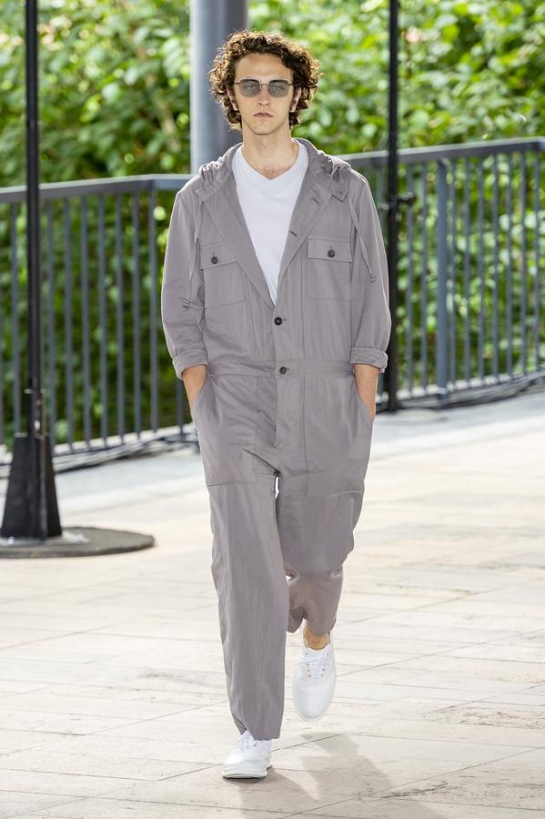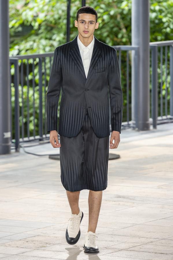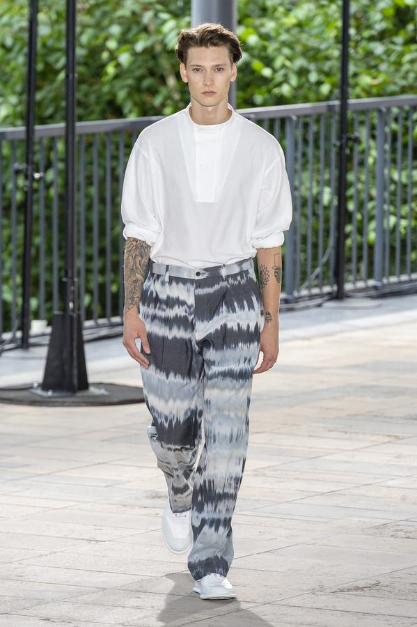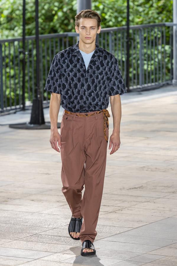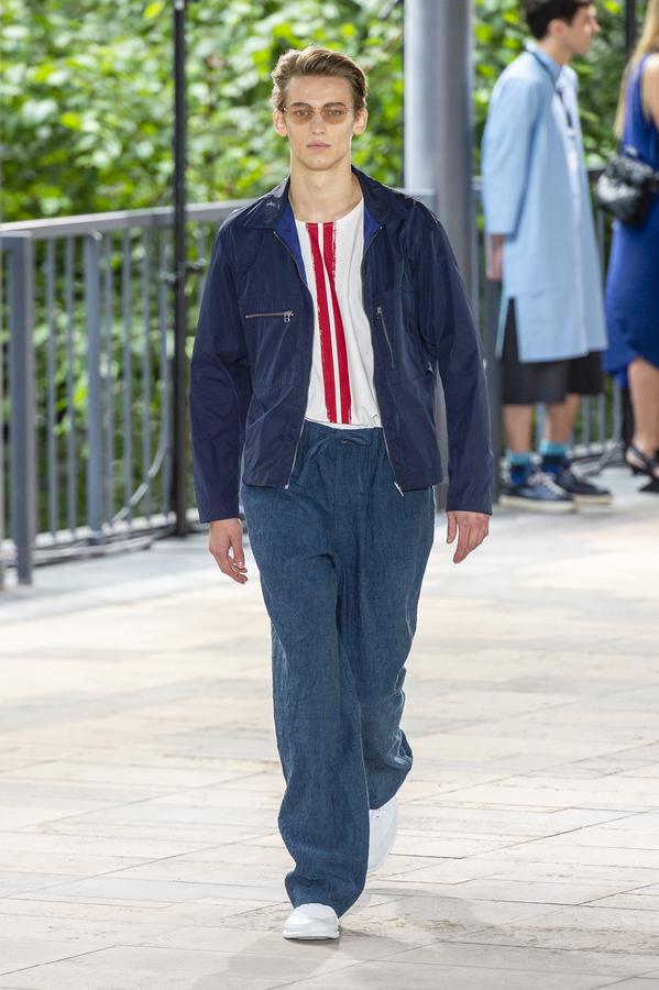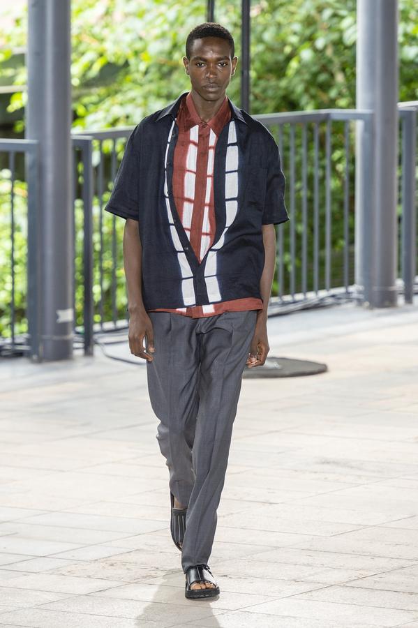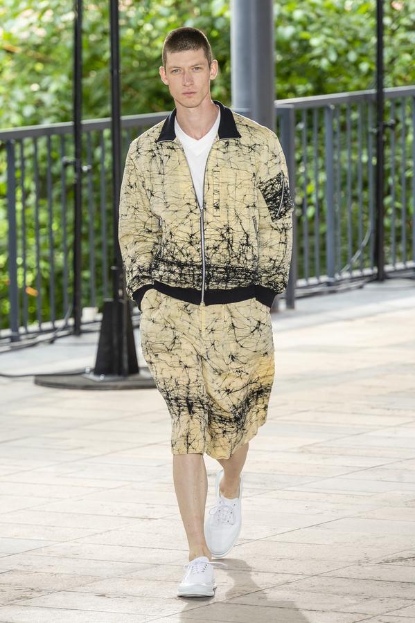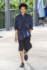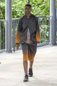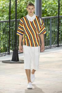 DEFILE ISSEY MIYAKE MEN A L’UNIVERSITE PIERRE ET MARIE CURIE (JUSSIEU): S’inscrivant pleinement dans une époque où les frontières entre vestiaire formel et décontracté tendent à s’estomper de plus en plus, le directeur artistique Yusuke Takahashi nous a présenté une nouvelle collection intitulée « Sun everywhere » combinant tout à la fois confort, décontraction et style. Les chemises sont remises au goût du jour et se portent blanches ou alors dans des ensembles garnis de toutes sortes de motifs graphiques et colorés, jouant sur les rayons et les ombres du soleil, dessinés pour certains par ordinateur. Pouvant tout aussi bien servir de veste, elles s’allient avec d’élégants bermudas, longs et amples, qui détrônent l’habituel pantalon, lui aussi porté large. La palette de couleurs s’avère particulièrement raffinée et conduit en fin de compte à des tenues urbaines très chic et relax, tout à fait accessibles.