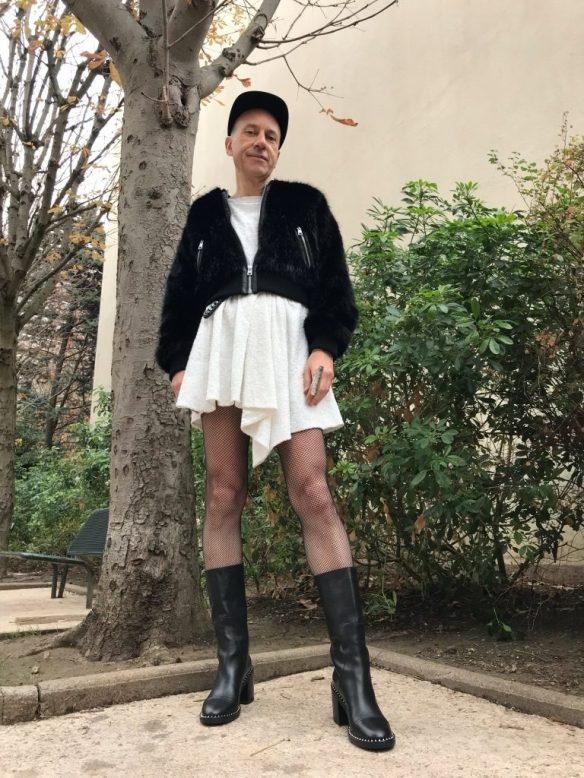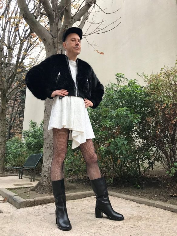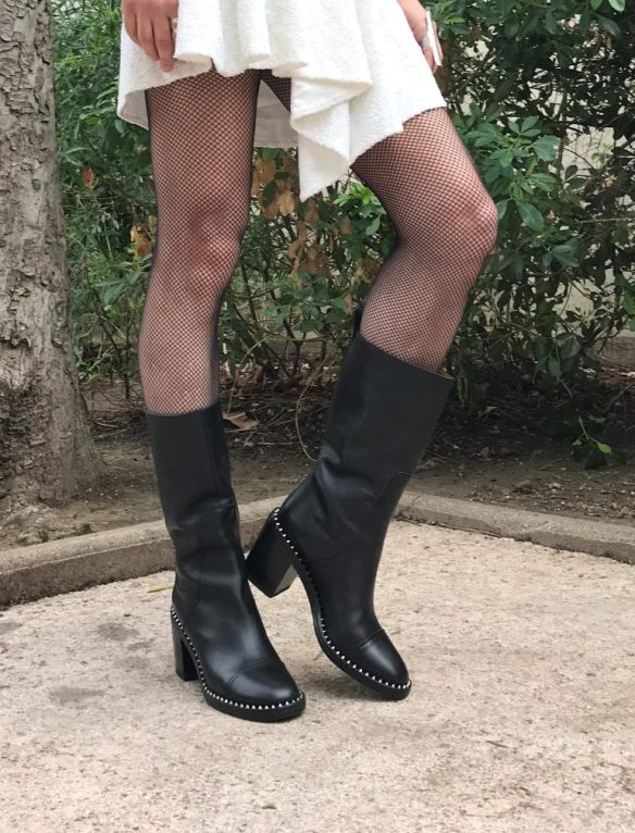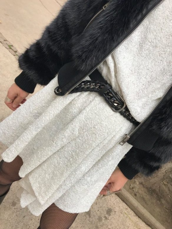 Pas de tenue de fête sans sequins! Les sequins illuminent votre silhouette, mais pas la peine d’en faire trop non plus. Voici donc une suggestion de look chic, sexy, et malgré tout d’allure plutôt sobre. Ces très jolies pièces proviennent de la collection hiver 2018/2019 de Zadig & Voltaire. Robe blanche courte et asymétrique, entièrement recouverte de sequins (robe « Rolee Sequins »). Pour bien marquer la taille je la porte avec une ceinture: ceinture tressée, en cuir et métal « Epy ». Manteau noir court en fausse fourrure, avec maille cote en bas et au bout des manches (manteau « Felix »). Pour une touche rock j’ai assorti la tenue avec des bottes mi-hautes en cuir « Crome » avec liseré de clous argent et talons épais. J’ai finalisé le look avec ma nouvelle casquette fétiche de Maison Michel, mes bijoux préférés de Clara Jasmine (bagues et manchette en métal argenté reproduisant de la dentelle) et des collants résille…so sexy!