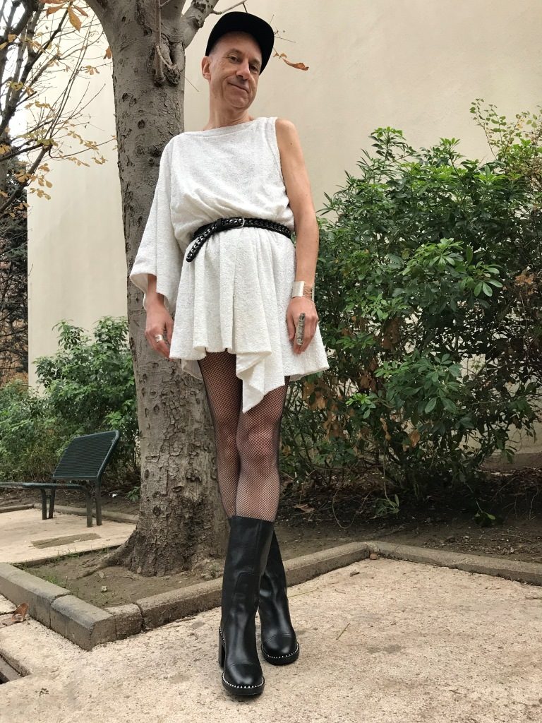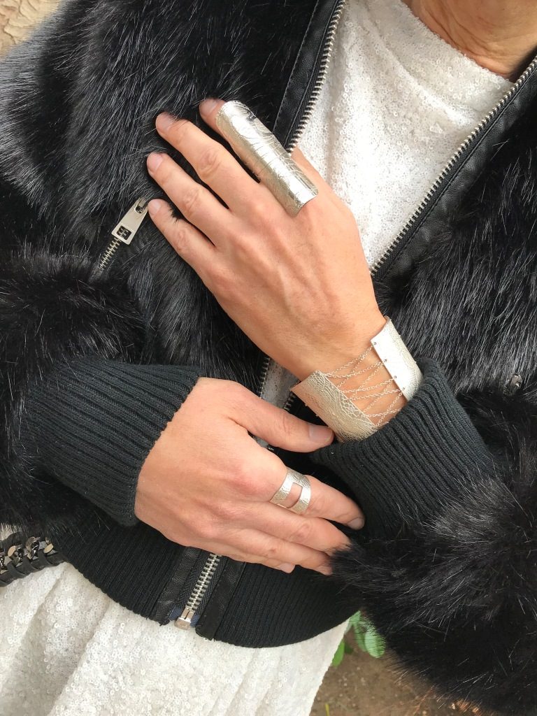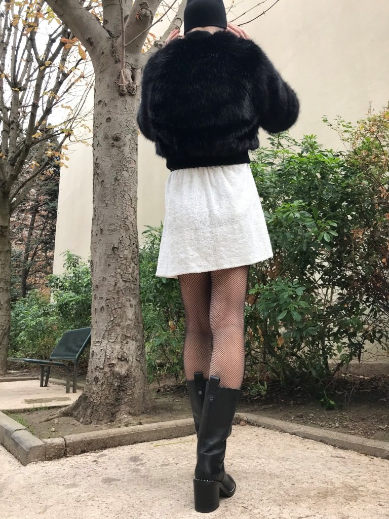 Pas de tenue de fête sans sequins! Les sequins illuminent votre silhouette, mais pas la peine d’en faire trop non plus. Voici donc une suggestion de look chic, sexy, et malgré tout d’allure plutôt sobre. Ces très jolies pièces proviennent de la collection hiver 2018/2019 de Zadig & Voltaire. Robe blanche courte et asymétrique, entièrement recouverte de sequins (robe « Rolee Sequins »). Pour bien marquer la taille je la porte avec une ceinture: ceinture tressée, en cuir et métal « Epy ». Manteau noir court en fausse fourrure, avec maille cote en bas et au bout des manches (manteau « Felix »). Pour une touche rock j’ai assorti la tenue avec des bottes mi-hautes en cuir « Crome » avec liseré de clous argent et talons épais. J’ai finalisé le look avec ma nouvelle casquette fétiche de Maison Michel, mes bijoux préférés de Clara Jasmine (bagues et manchette en métal argenté reproduisant de la dentelle) et des collants résille…so sexy!