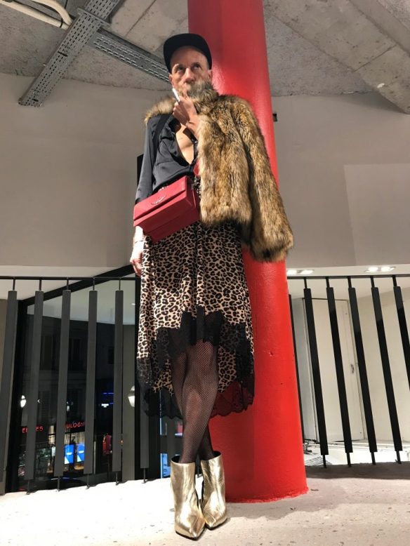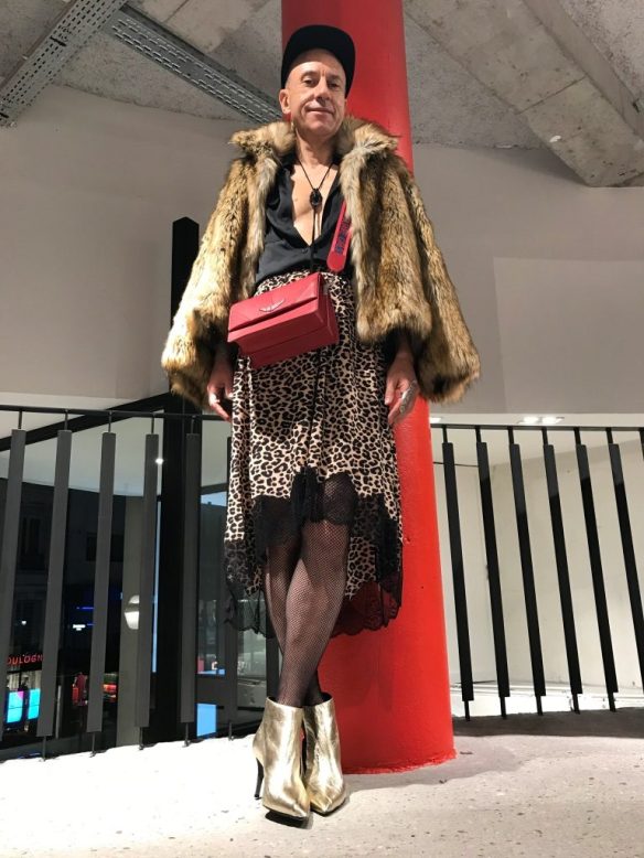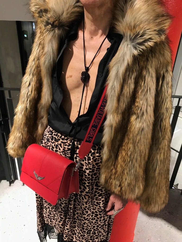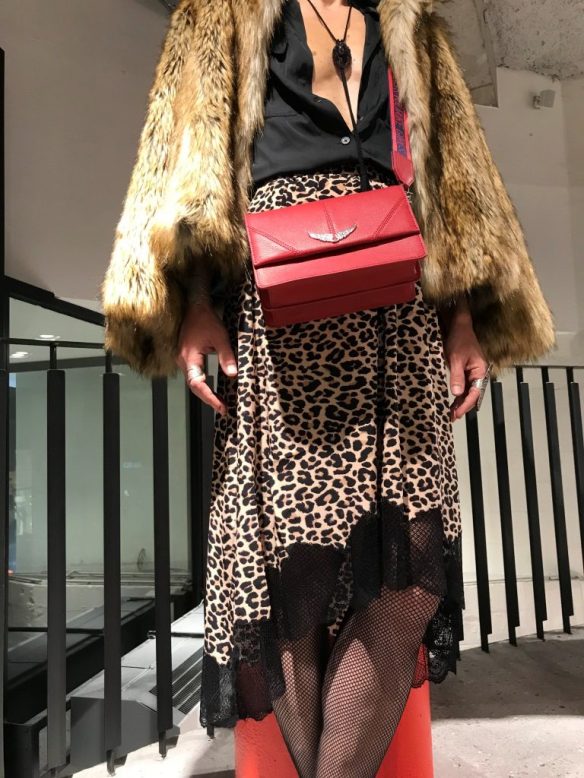 Les fêtes sont terminées, mais on essaie de prolonger encore un petit peu l’ambiance de fête, pourquoi pas lors de soirées entre amis ou pour faire les soldes, pré-soldes et autres ventes privées! Voici donc un nouveau look avec la superbe jupe du look précédent (n°2) que je vais avoir du mal à ranger: jupe satinée imprimé léopard, agrémentée de dentelle, mi-longue et asymétrique Zadig&Voltaire collection croisière 2019 (« Joslin Leo »). Cette fois je l’ai assortie avec une chemise noire en satin également, style militaire (chemise « Toast Satin » Zadig&Voltaire collection croisière 2019), un petit sac cartable rouge en cuir qui booste le look et qui peut être porté en bandoulière ou à la main (sac « Lolita », même collection), un manteau court en fausse fourrure dans les mêmes tons que la jupe, qui a la particularité d’être doté de bretelles permettant de le porter sur les épaules (manteau « Furys », Zadig&Voltaire collection hiver 2018/2019). Pour finaliser le look j’ai conservé les accessoires du look précédent: casquette Maison Michel, pendentif Baron Y, bagues Clara Jasmine, collants résille, bottines en cuir doré (Zadig&Voltaire « Virgo Gold » hiver 2018/2019). Et bien sûr je n’oublie pas de vous souhaiter plein de bonnes choses pour cette nouvelle année, en vous remerciant de votre fidélité et en espérant que ce blog continuera à vous apporter de l’inspiration, du plaisir, de la bonne humeur et de la confiance en soi!