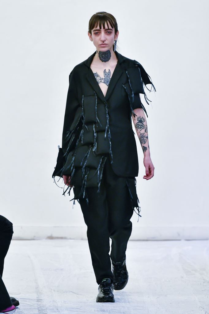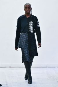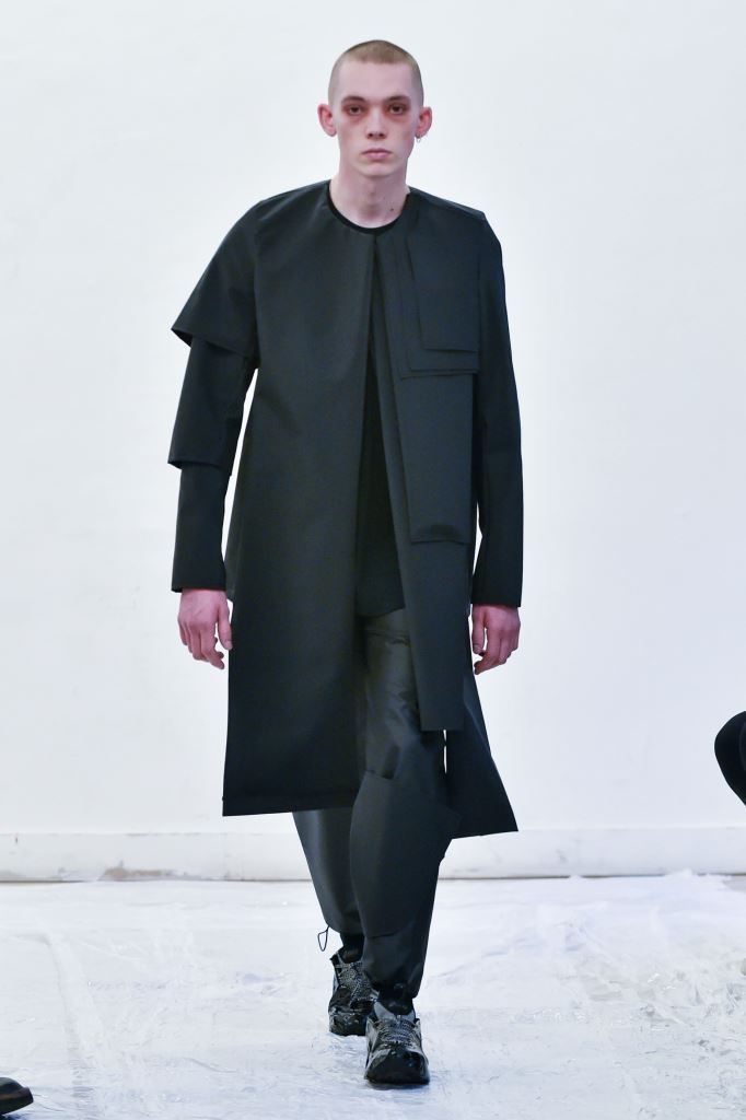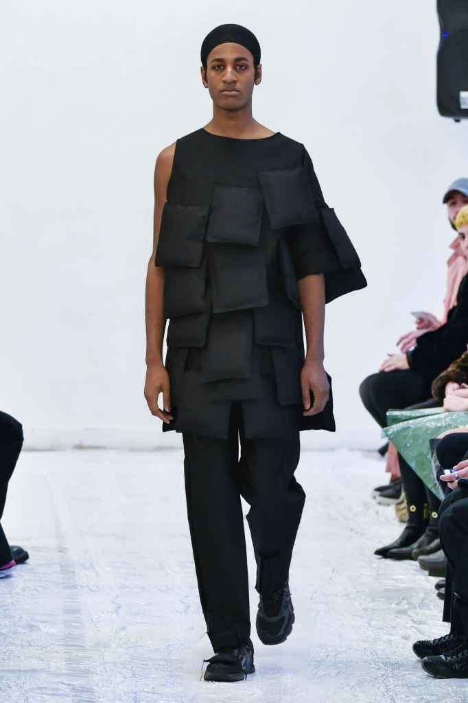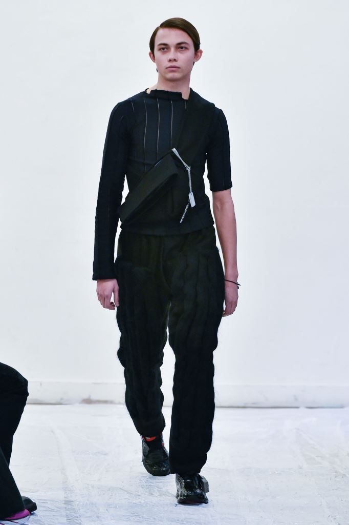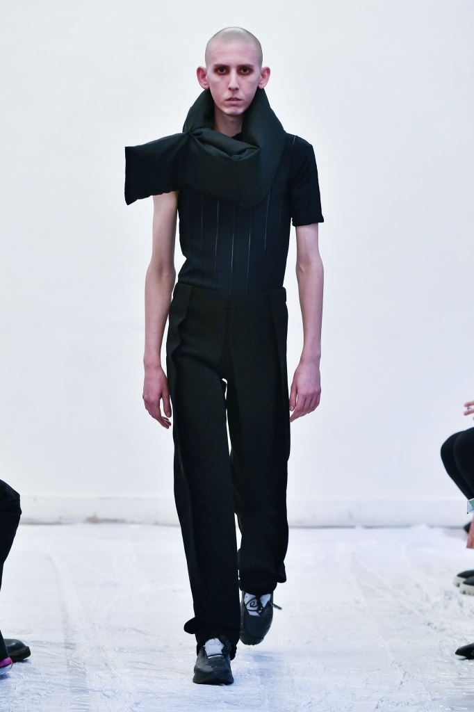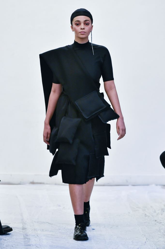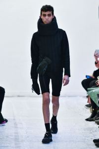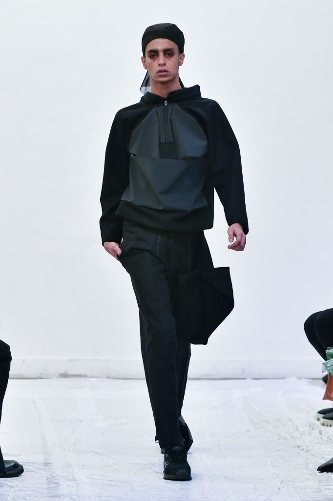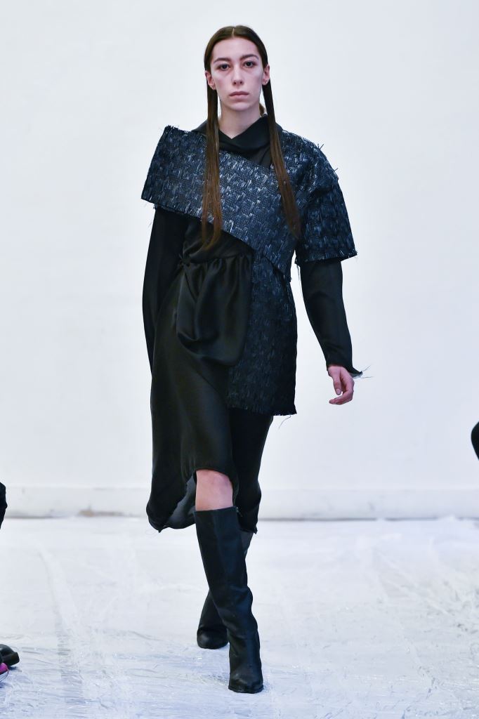DEFILE ENAMI DANS UN SHOWROOM DU 11EME ARRONDISSEMENT: Fondée par la jeune créatrice Imane Medjahed en 2017, ENAMI (anagramme de son prénom) est une marque néo-minimaliste basée à Paris, qui se veut libre et spontanée. En perpétuelle expérimentation autour des corps, des formes géométriques et des volumes, elle puise son inspiration dans l’architecture brute et la déconstruction. L’utilisation quasi-unique du noir est pour elle un défi créatif qui la conduit à se concentrer sur les textures et les proportions des vêtements. Le thème de cette nouvelle collection unisexe est l’oppression générée par le monde actuel, tant dans les relations sociales que par les flux permanents d’information. Ceci se traduit par des formes rigides, volumineuses et asymétriques, des contrastes entre lainages épais, matières techniques et raphia. Les silhouettes sont customisées avec un sac iPhone case en béton et des bijoux en tôle d’acier, transformés à partir de carrosseries de voiture par Thismx Jewelry.