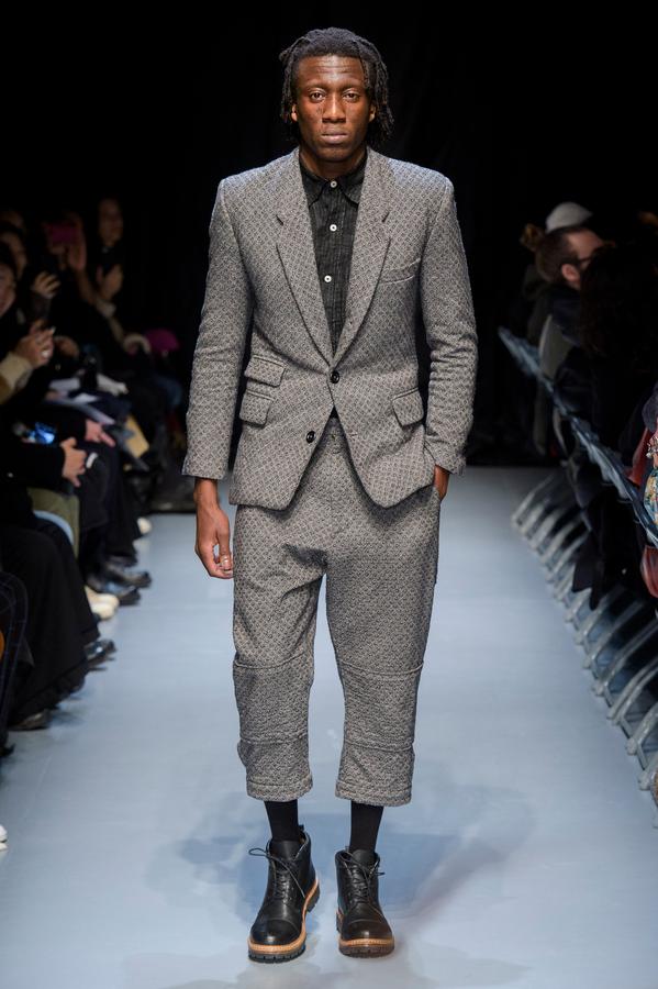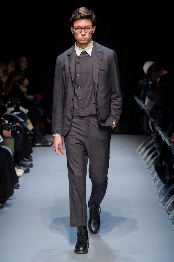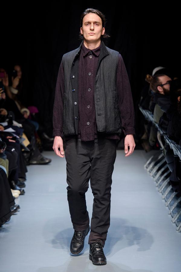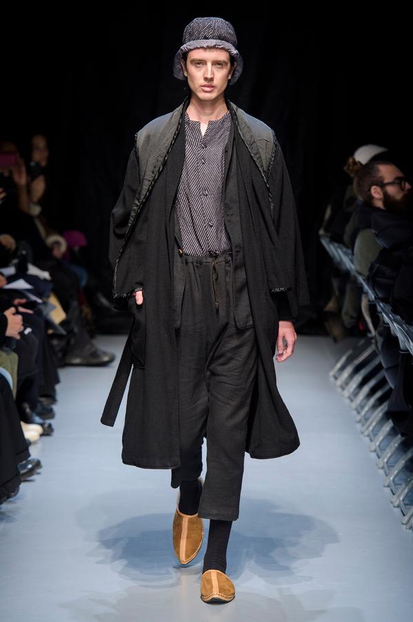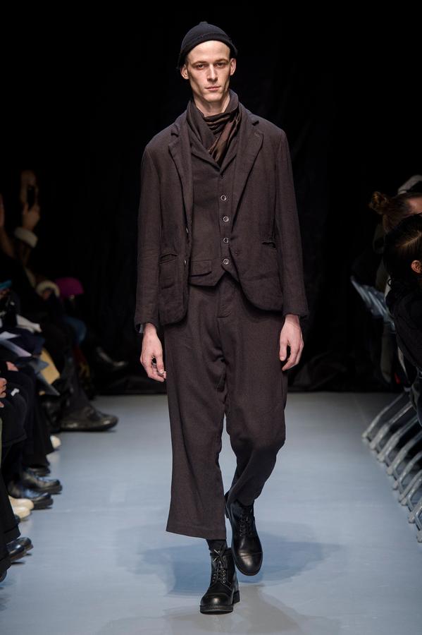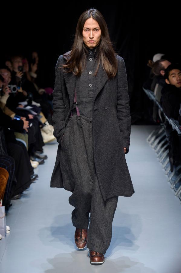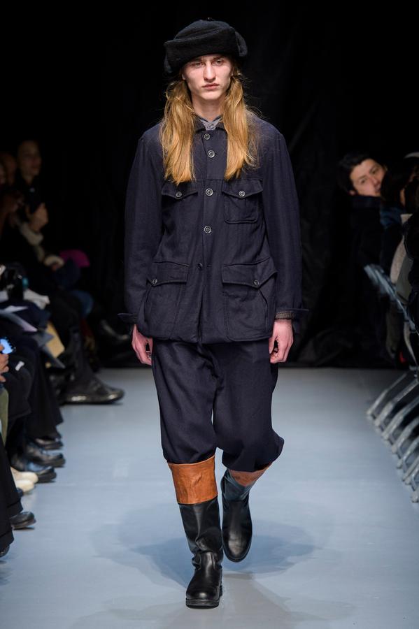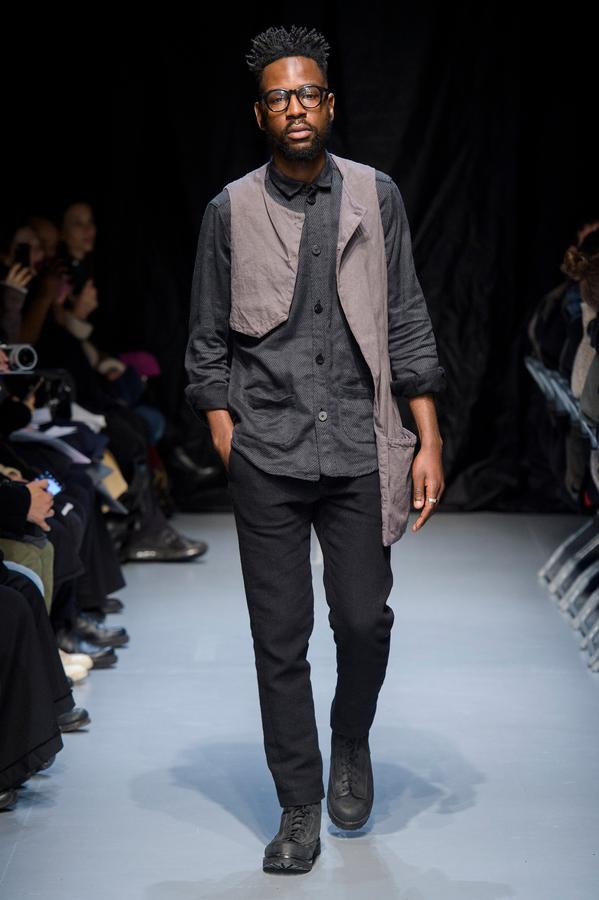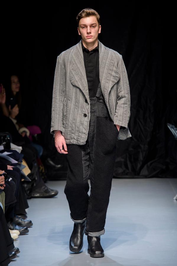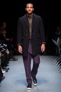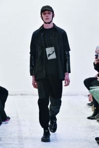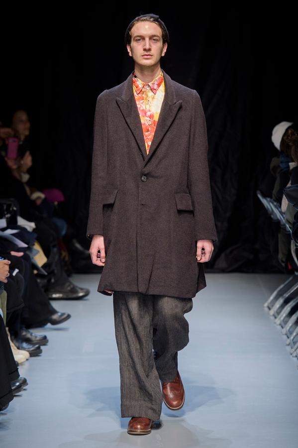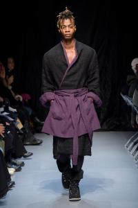 DEFILE GEOFFREY B SMALL A L’ESPACE SAINT-MARTIN: Une nouvelle fois le designer américain installé en Italie a choisi de présenter sa collection dans le cadre d’une représentation théâtrale, toujours dans l’optique de rechercher une convergence entre mode et art. Nous avons ainsi assisté à une mise en scène inédite du chapitre intitulé « L’Oignon » du célèbre roman de Dostoïevski « Les Frères Karamazov »: fidèle à son engagement pour une mode écologiquement et socialement responsable, et appelant à davantage de solidarité humaine, le créateur y a vu une métaphore sur les puissants qui entraînent le monde à sa perte tout en pensant pouvoir y échapper eux-même. Cette inspiration russe se traduit par une grande variété de propositions: vêtements chauds ou bien très légers aux coupes diverses, nombreuses pièces réversibles (anoraks, costumes, robe de chambre,…). Un nouveau type de vêtement apparaît avec une surchemise en cachemire avec poches qui est un intermédiaire entre chemise et veste. L’ensemble est toujours fabriqué à la main dans les ateliers du créateur à Venise, avec les meilleurs tissus: laine (notamment laine super 120 très chaude), cachemire, lin, soie, satin de soie. A partir d’un même tissu des rendus différents sont obtenus en jouant sur la teinture. Une teinture naturelle à base d’écorces de bois donne un joli teint violacé. Quelques pièces sont agrémentées d’imprimés de montages photos ou de motifs floraux, parfois sur la doublure. On retrouve les épaulettes vues sur les dernières collections. Toujours une élégance intemporelle alliant modernité et éco-responsabilité!