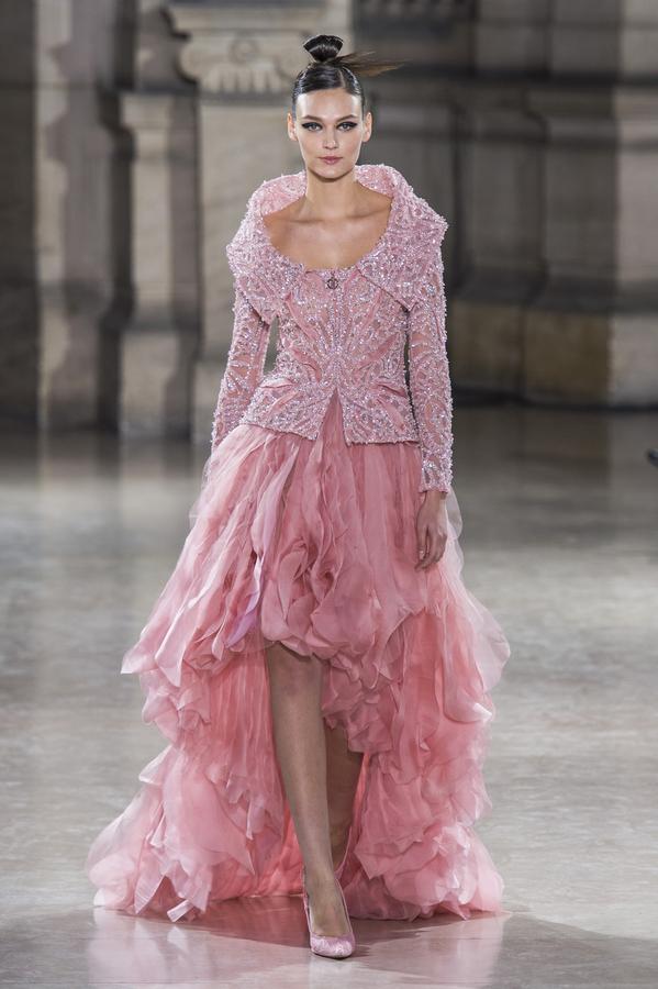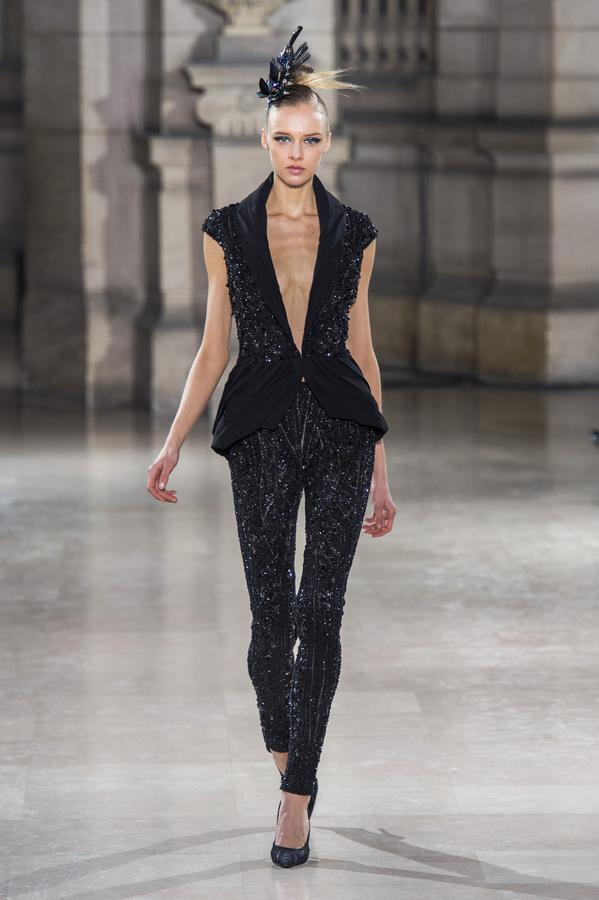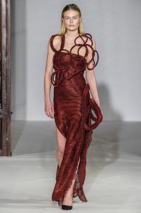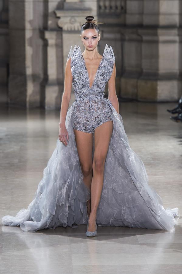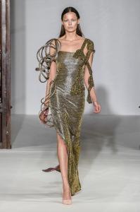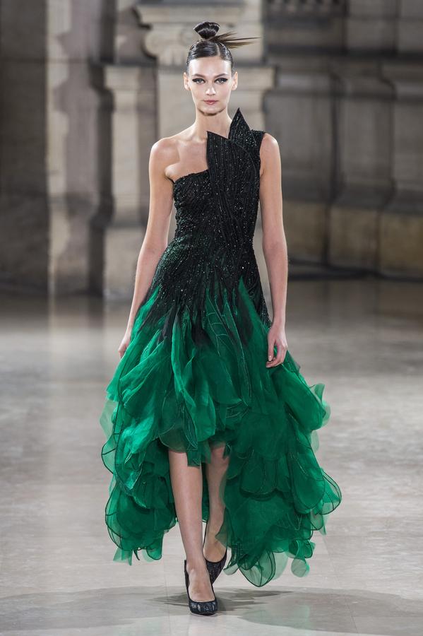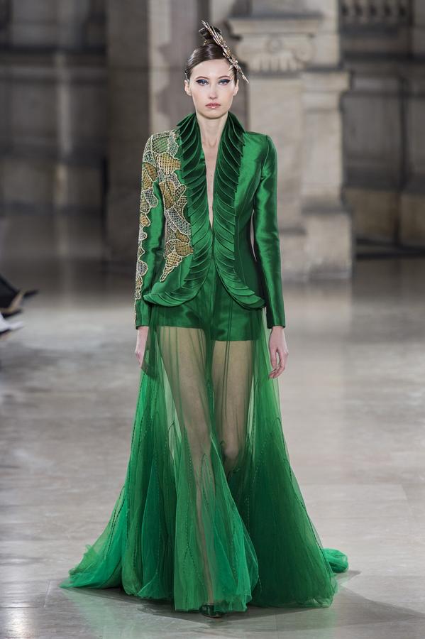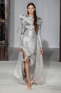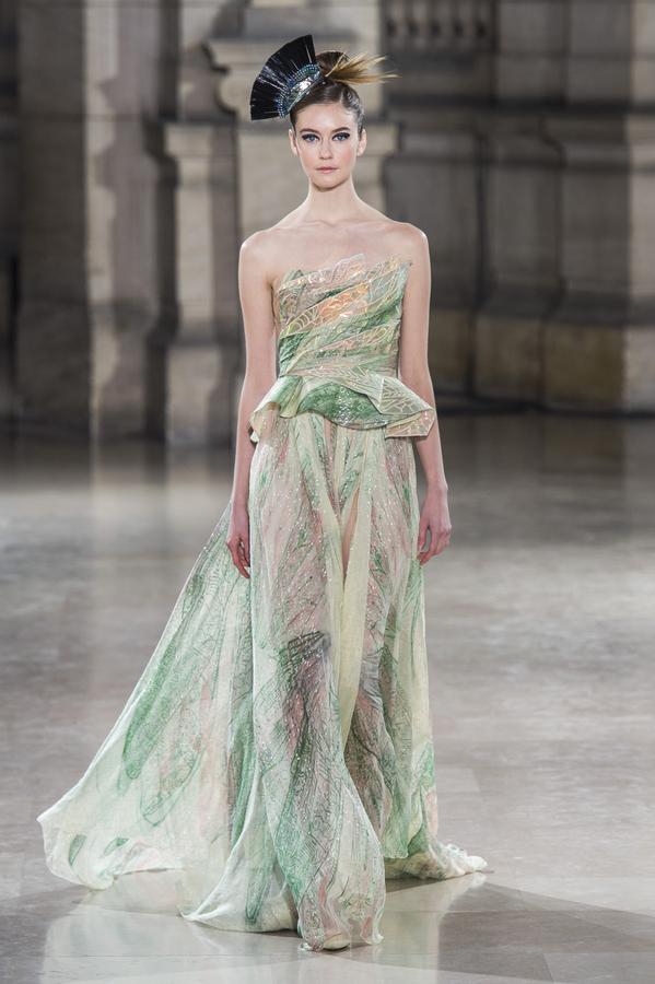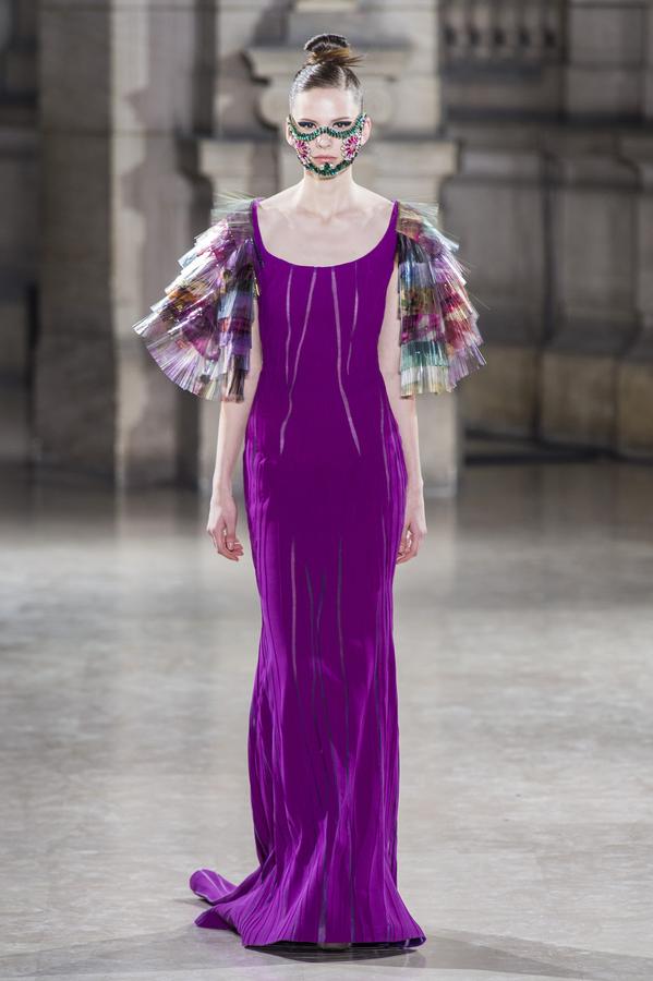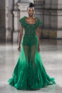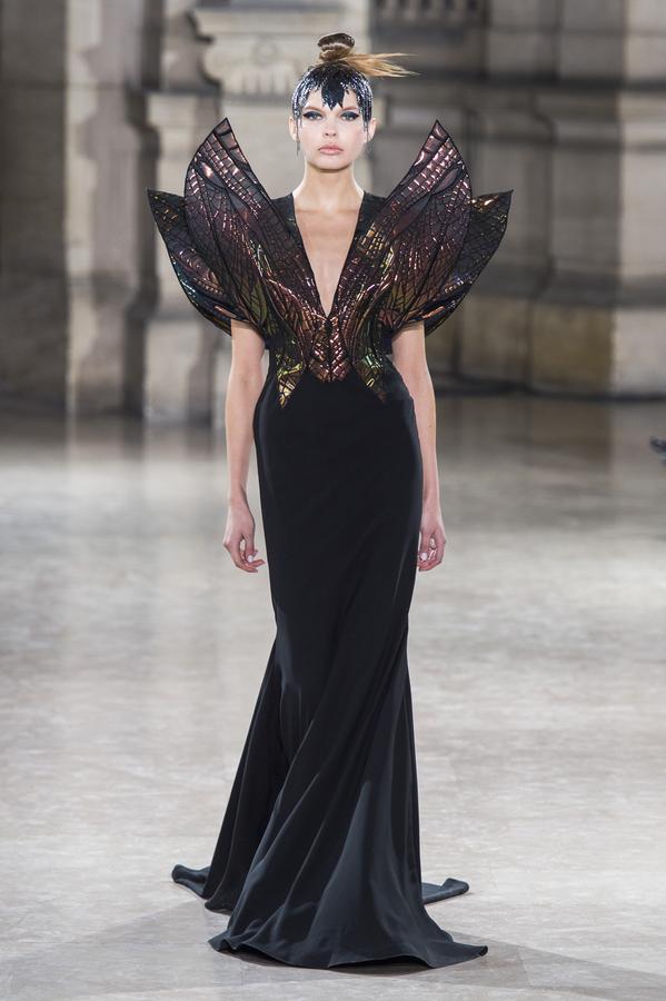 DEFILE TONY WARD A L’ECOLE DE MEDECINE: Pour cette nouvelle collection intitulée « Anatomy of a Wing » le créateur libanais a trouvé son inspiration dans l’anatomie de la libellule et son aspect si majestueux. Les silhouettes sont ainsi directement inspirées de la finesse et de la délicatesse de la structure de leurs ailes traduisant une grande fragilité. Leurs lignes se retrouvent dans les détails des broderies, dans des formes géométriques, sur des ailes reconstituées ou bien encore dans de magnifiques accessoires de cheveux conçus par Yana Markova. Les matériaux nobles jouent avec la transparence et la légèreté des volumes. Les battements rapides des mouvements de la libellule sont traduits par une structure aux formes voluptueuses qui met les pièces en mouvement à chaque pas. L’ensemble est sublimé par une palette de couleurs holographiques allant du violet intense au vert émeraude, en passant par des tons pastels rappelant le corps et les ailes irisées de la libellule.