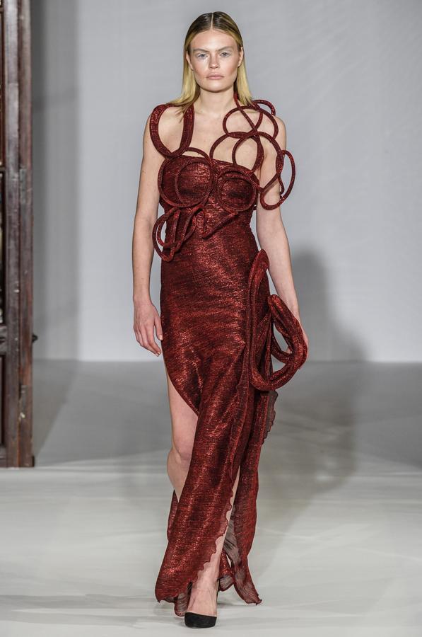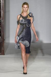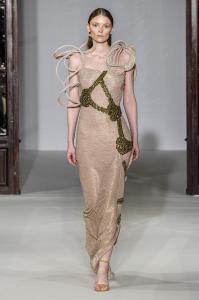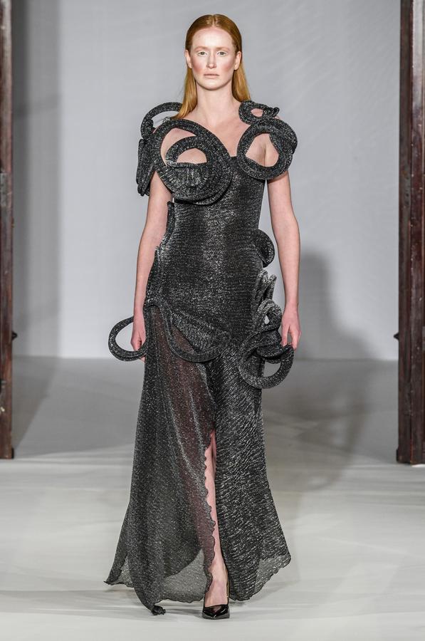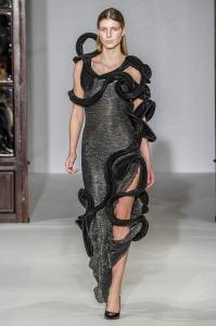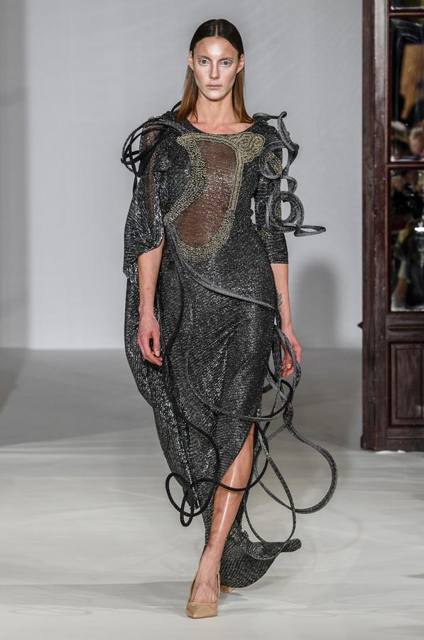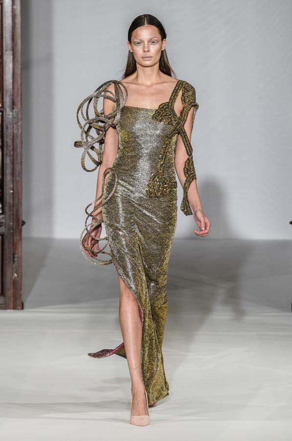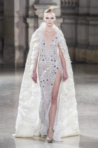 DEFILE PATUNA A L’HOTEL INTERCONTINENTAL PARIS-LE GRAND: La créatrice américano-géorgienne a dévoilé sa nouvelle collection intitulée « Obsession éthérique » faisant référence à une citation d’Einstein selon lequel « sans l’éther, non seulement la lumière ne se propagerait pas, mais les normes de l’espace et du temps ne pourraient absolument pas exister ». Toujours fascinée par la lumière, la créatrice en a conçu une collection extravagante aux envolées de matières-satellites autour d’un corps de femme astrale, fatale et battante, dans laquelle les robes épousent et magnifient les courbes du corps féminin. L’idée de l’éther protégeant le corps comme un écrin est symbolisée par des arabesques de tissus qui se meuvent au rythme de la démarche et accompagnent chacun des mouvements du corps et du vêtement. Les tissus irisés captent la lumière éblouissante des défilés, toutes ces volutes matérialisant cet éther remplissant l’espace vide qui propagerait les ondes lumineuses aux parties nues du corps laissées visibles avec sensualité. Cette sensualité s’exprime également sur le visage des mannequins aux pommettes accentuées et aux yeux maquillés de blanc que la lumière rend surnaturels.
