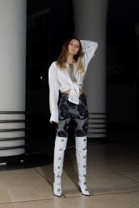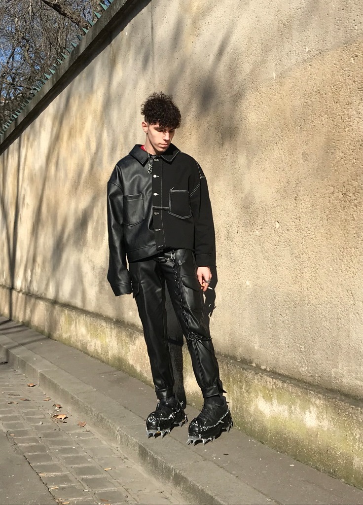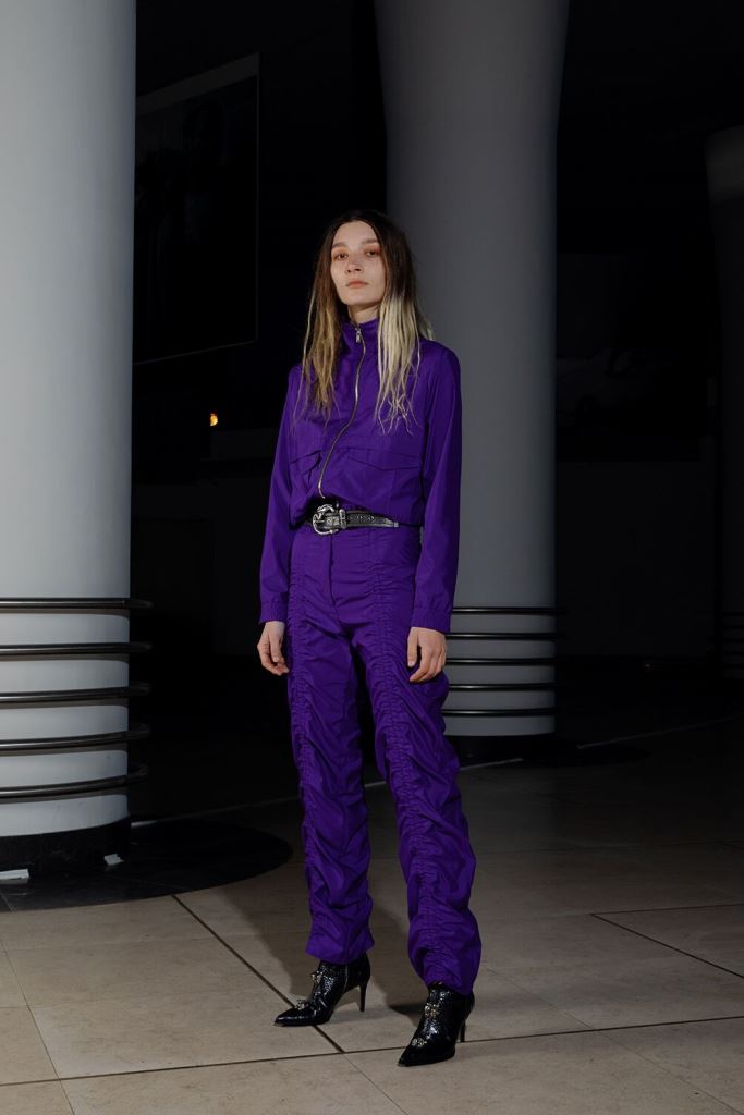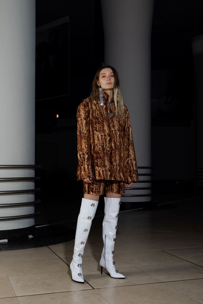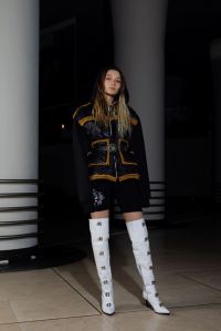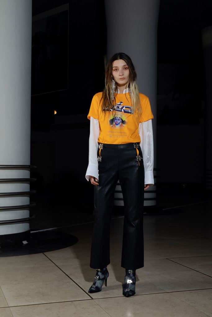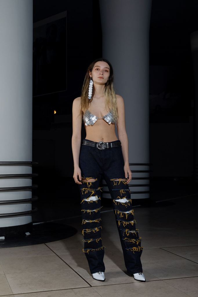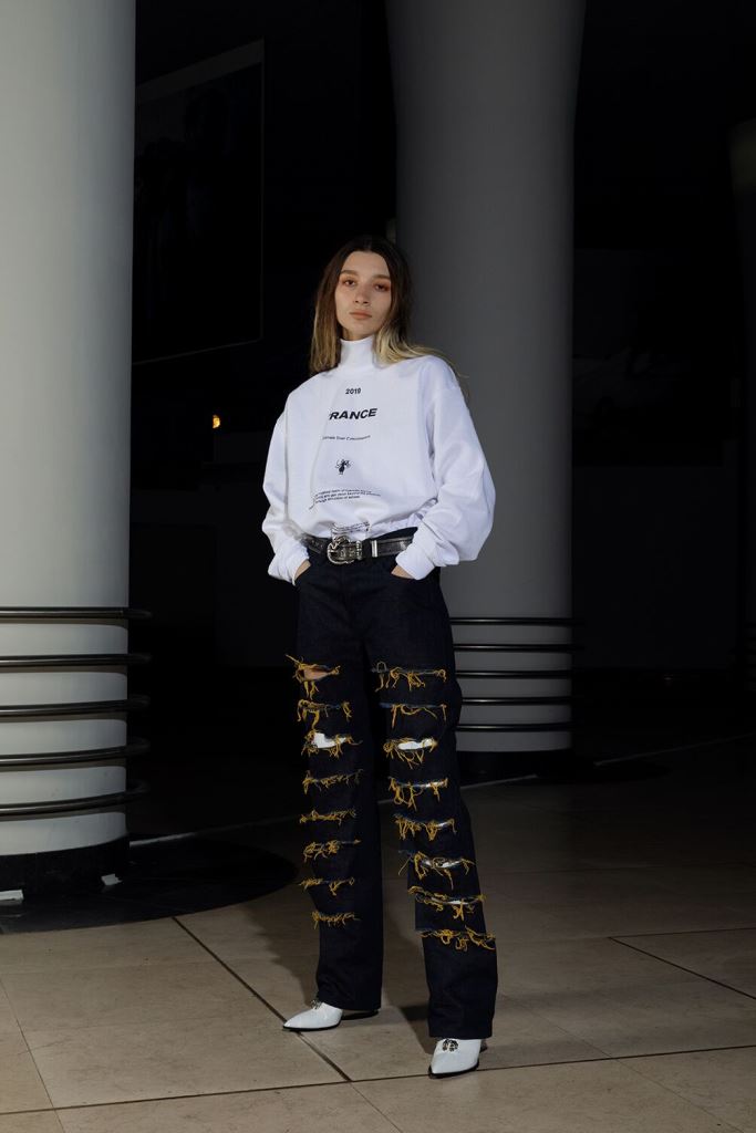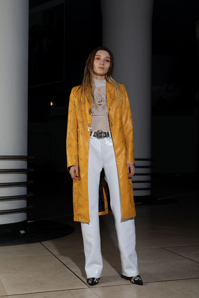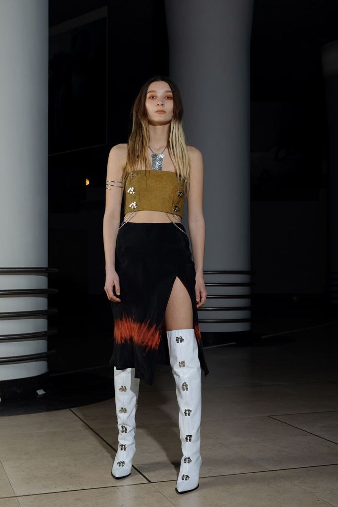 PRESENTATION LEO DANS LE NOUVEAU CONCEPT STORE-CLUB « JEAN LOUIS LA NUIT »: La jeune marque bruxelloise fondée en 2016 et animée par la créatrice Leonneke Derksen a présenté sa nouvelle collection intitulée « Trance » dans laquelle elle poursuit ses expérimentations entre trash et sophistication, dans un monde résolument contemporain mais qui puise ses références dans la nostalgie des grands rassemblements de Goa des années 1980/1990 et dans les préceptes du yoga, répondant à l’envie de spiritualité de la génération Millenials. Elle déclare s’inspirer autant des esthétiques psychédéliques et religieuses originelles que des déclinaisons mainstream actuelles de ces thématiques. Ces atmosphères sont traduites dans la collection par la combinaison d’imprimés et bijoux d’inspiration indienne avec des éléments que l’on identifie à la trance européenne comme les jeans bruts et les teintures décolorées. On retrouve également dans cette approche innovante de ces thématiques les éléments stylistiques propres à la marque: les jupes longues (ou courtes) fendues qui se dégrafent par des attaches troublantes, les grandes bottes à talons sur lesquelles on retrouve les mêmes fermoirs, les grosses ceintures, des hauts courts avec des manches très longues, les brassières, les combinaisons, le tout dans une panoplie de matières combinant jean, molleton, soie, satin, et une palette de couleurs où dominent kaki, jaune, mauve et le noir et blanc. Que la fête commence!