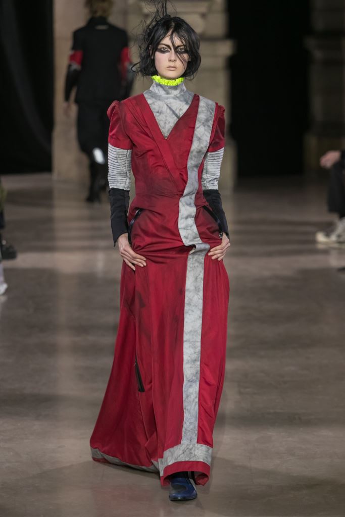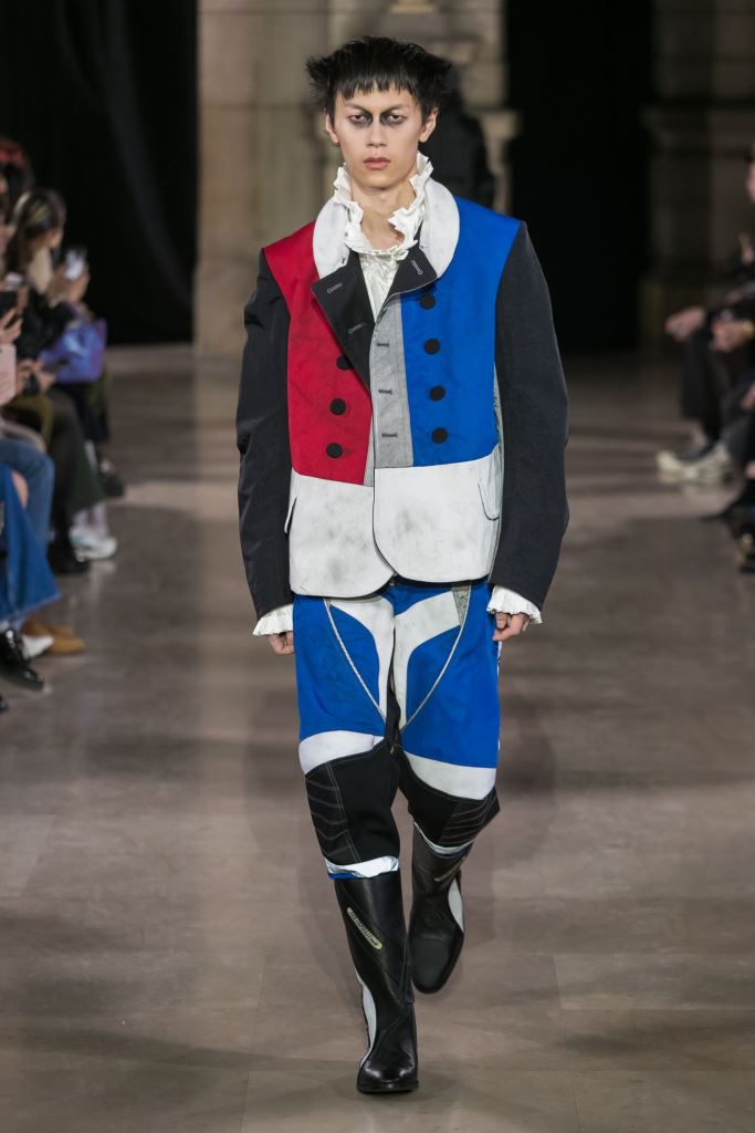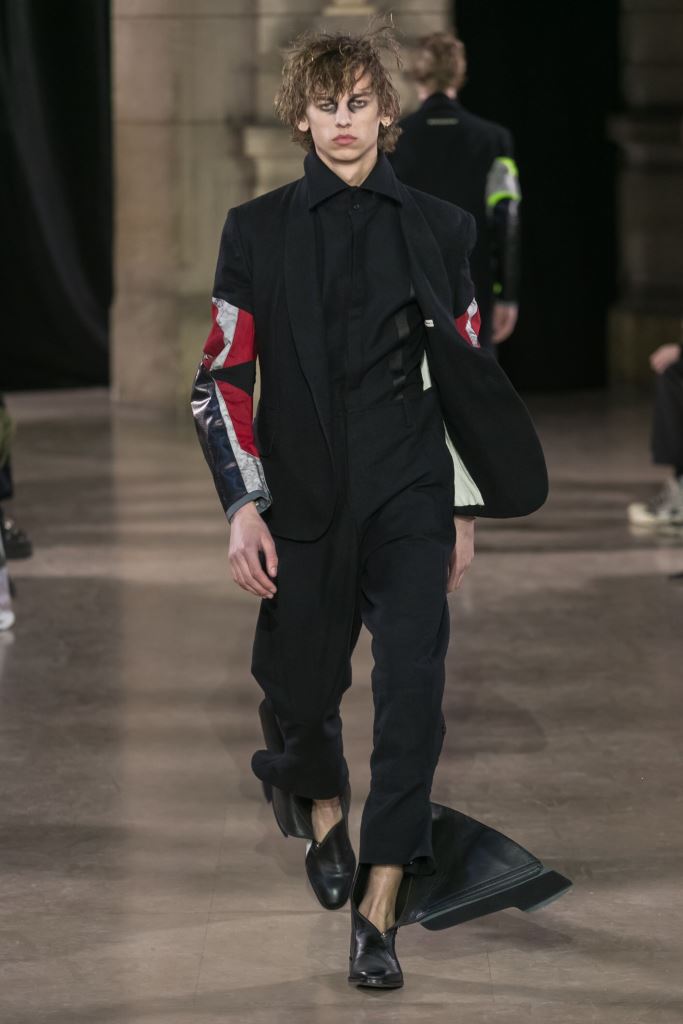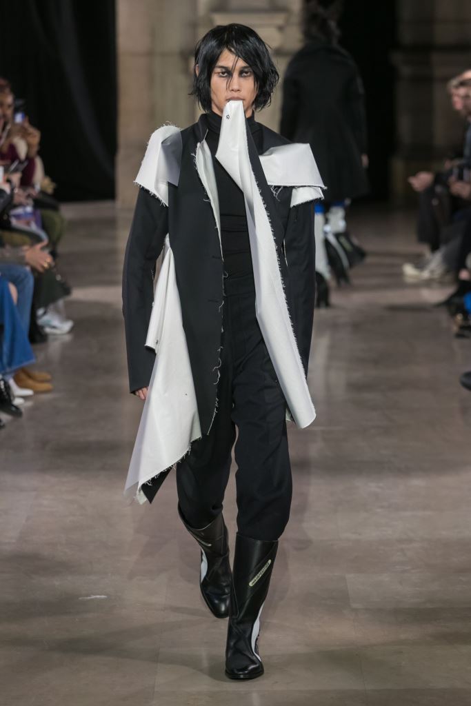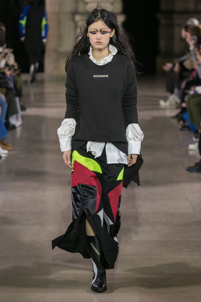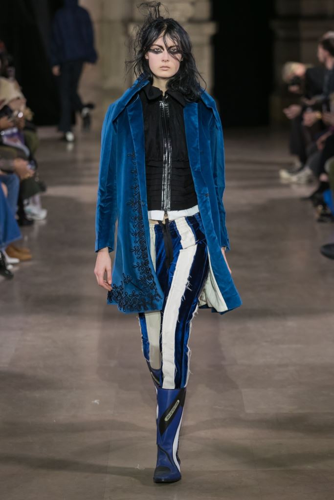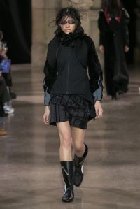 DEFILE MOOHONG A L’ECOLE DE MEDECINE: Pour cette nouvelle collection intitulée « Juxtaposition », le créateur coréen Kim Moo Hong nous invite à un voyage initiatique dans le temps et l’espace, combinant astucieusement des vêtements inspirés du 18ème siècle avec des tenues contemporaines style sportswear/tenue de motard. Les matières sont travaillées pour donner un aspect usé illustrant le passage du temps et discrètement teintées d’encre. La laine bouillie se combine au velours et aux matières synthétiques dans un patchwork de couleurs plutôt amusant et anachronique. Coupes déstructurées, épaules larges, manches ballons, bottes grandes ouvertes, collants troués: cette esthétique aux accents grunge, jouant sur les contrastes, dégage un romantisme noir qui n’est pas sans charme.