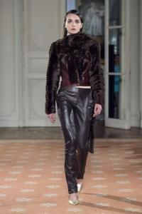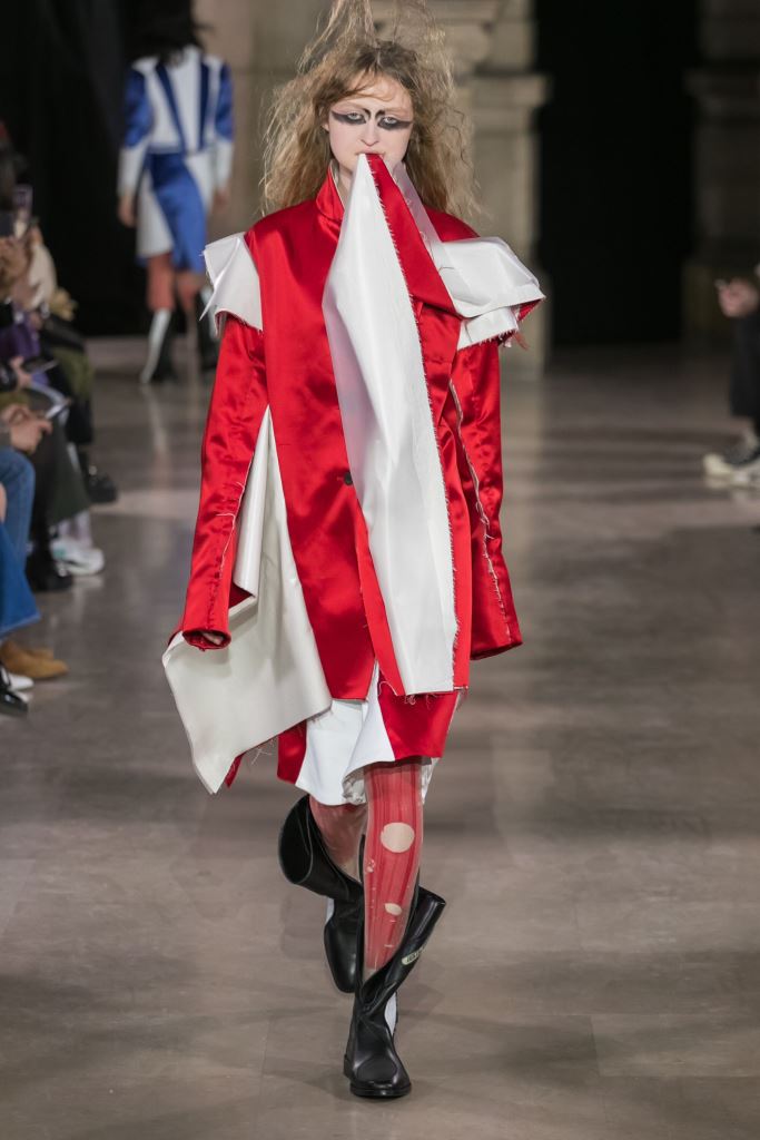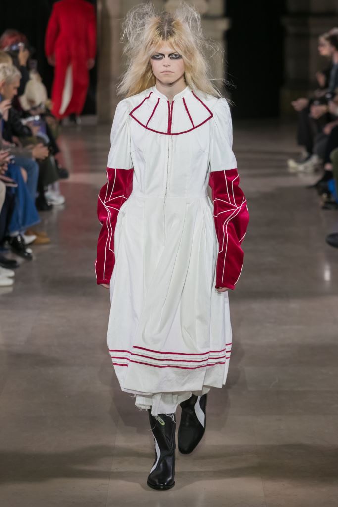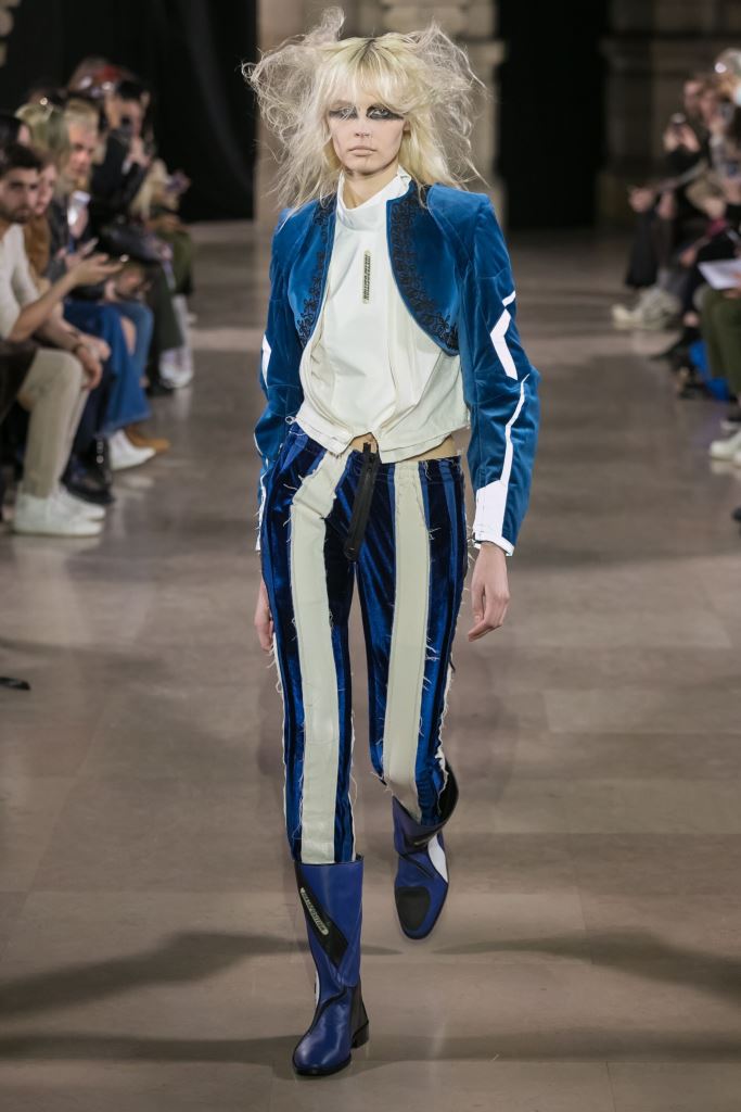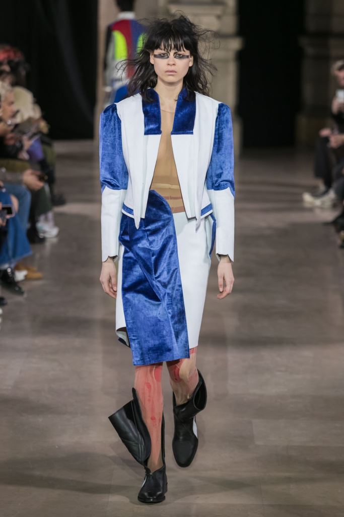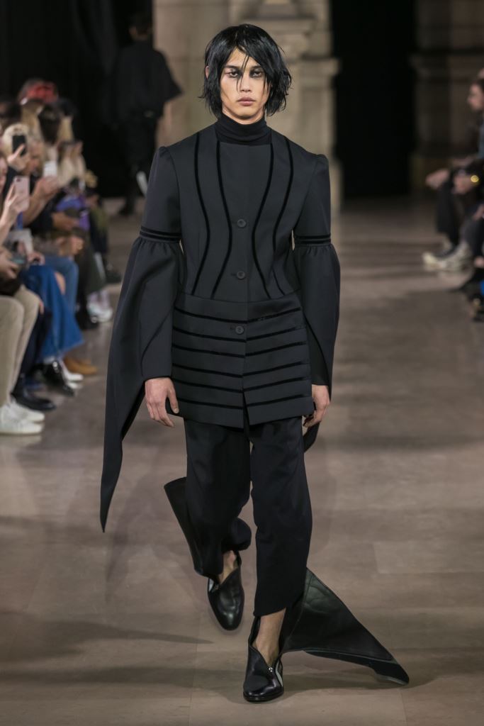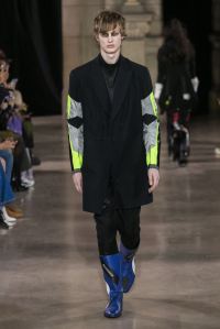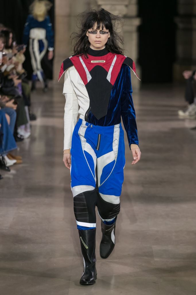 DEFILE MOOHONG A L’ECOLE DE MEDECINE: Pour cette nouvelle collection intitulée « Juxtaposition », le créateur coréen Kim Moo Hong nous invite à un voyage initiatique dans le temps et l’espace, combinant astucieusement des vêtements inspirés du 18ème siècle avec des tenues contemporaines style sportswear/tenue de motard. Les matières sont travaillées pour donner un aspect usé illustrant le passage du temps et discrètement teintées d’encre. La laine bouillie se combine au velours et aux matières synthétiques dans un patchwork de couleurs plutôt amusant et anachronique. Coupes déstructurées, épaules larges, manches ballons, bottes grandes ouvertes, collants troués: cette esthétique aux accents grunge, jouant sur les contrastes, dégage un romantisme noir qui n’est pas sans charme.