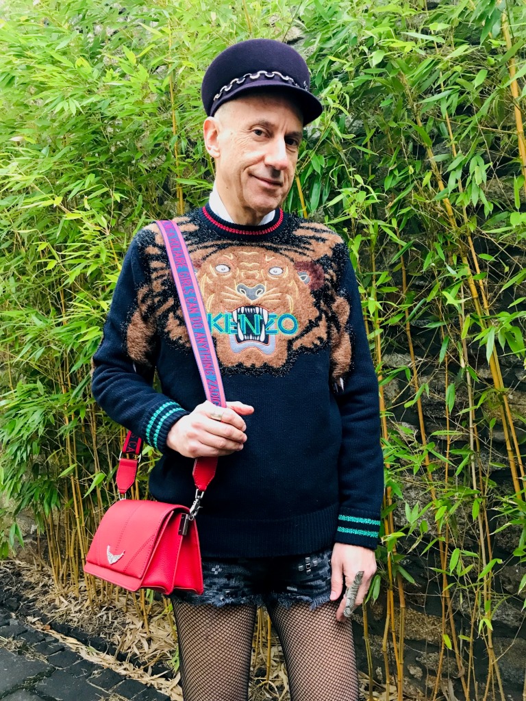L’hiver c’est toujours le plaisir de porter de jolis pulls bien chauds et très colorés. Et la marque Kenzo nous comble chaque année avec de magnifiques pulls revisitant son fameux logo Tigre avec une touche à la fois sauvage et toute en délicatesse. Pour finaliser ce look: casquette officier en feutre « Abby », avec chaîne en métal, Maison Michel (collection automne-hiver 2019/2020); mini-sac rouge en cuir à bandoulière Zadig&Voltaire; short en jean noir agrémenté de détails métalliques; bagues en métal argenté Clara Jasmine; collant résille; chaussettes épaisses en laine; boots en cuir Minelli.