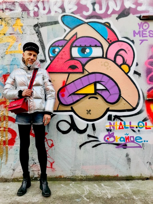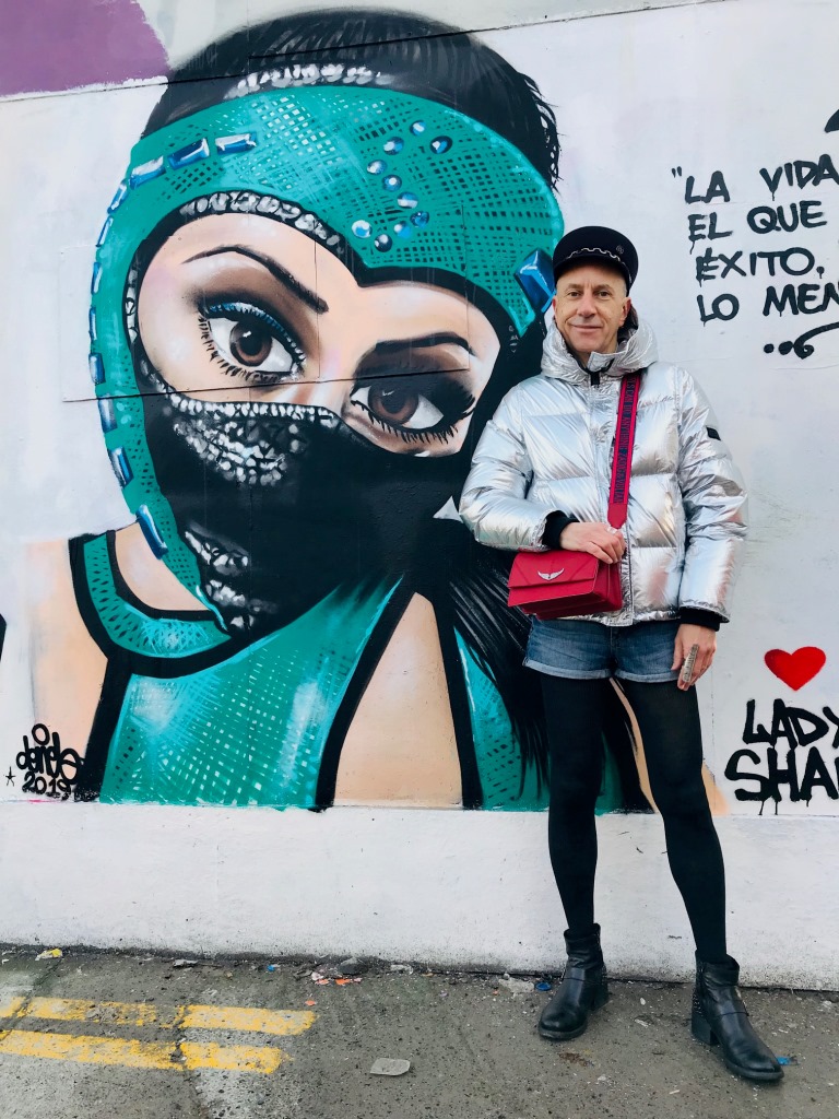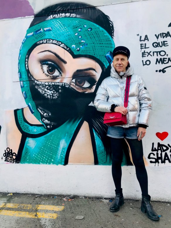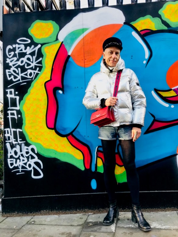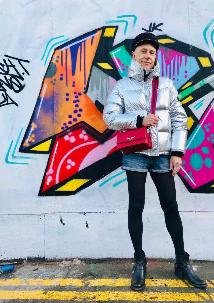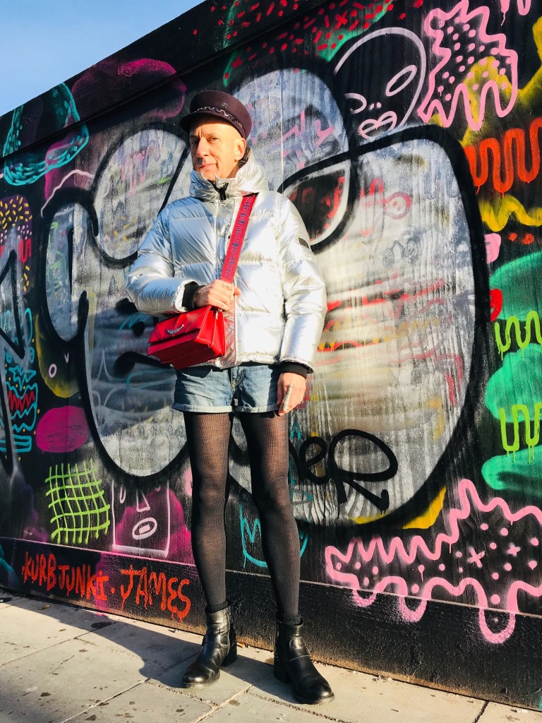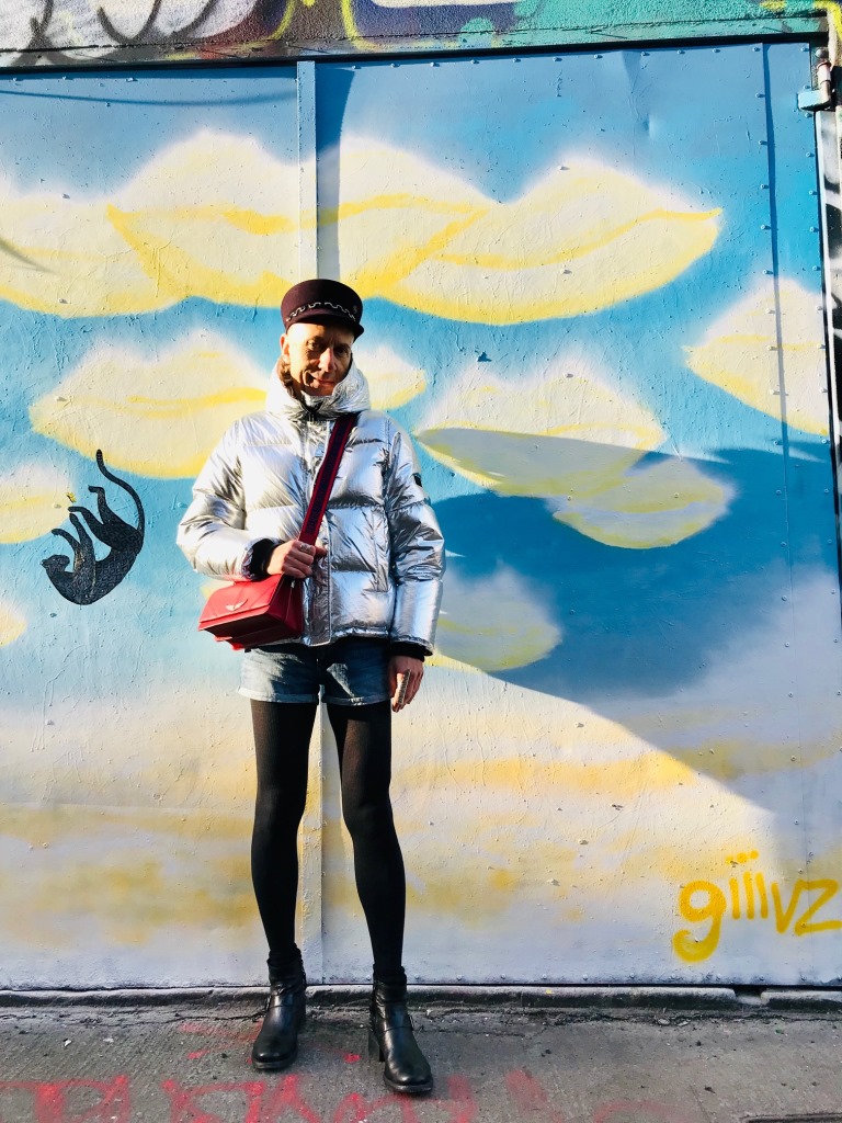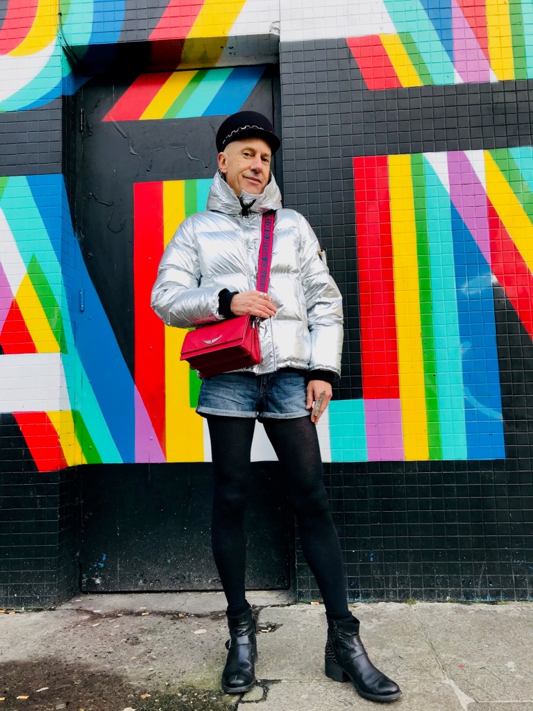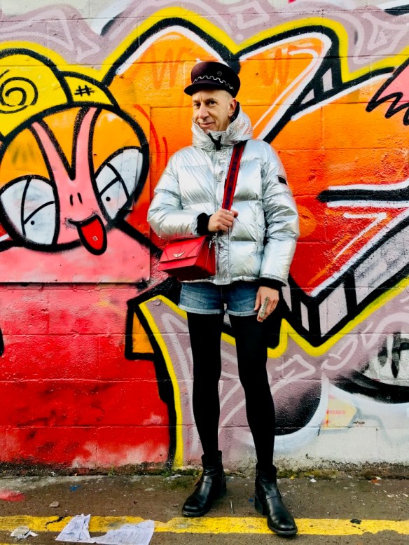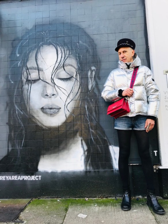Les tenues brillantes restent d’actualité cet hiver et cette magnifique doudoune Kenzo va vous permettre de rayonner tout en étant bien au chaud. Pour plus de fun les tenues argentées peuvent être élégamment associées avec des couleurs vives comme le bleu et le rouge, sans oublier le noir passe-partout. Casquette officier en feutre « Abby », avec chaîne en métal, Maison Michel (collection automne-hiver 2019/2020); mini-sac rouge en cuir à bandoulière Zadig&Voltaire; short en jean H&M; bagues en métal argenté Clara Jasmine; collant fin en laine; boots en cuir Minelli. Ces photos sont aussi l’occasion de vous montrer ce très beau street art de la ville de Dublin (Irlande) où j’ai passé comme l’an dernier un Noël fantastique.