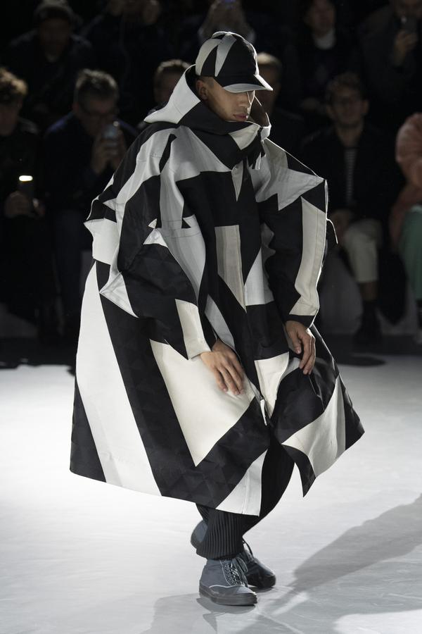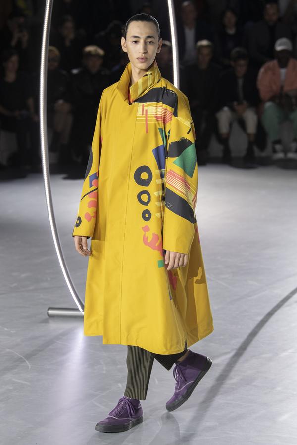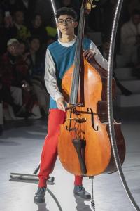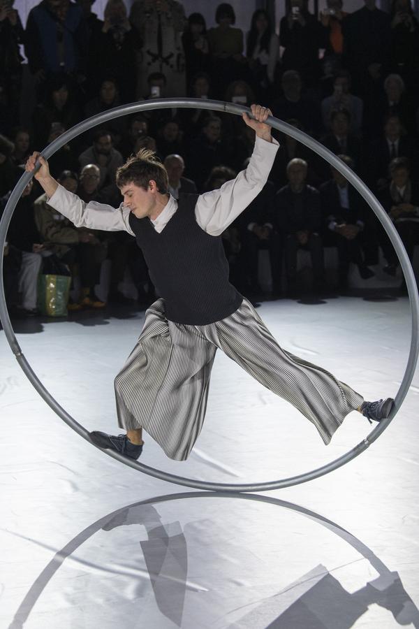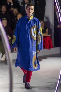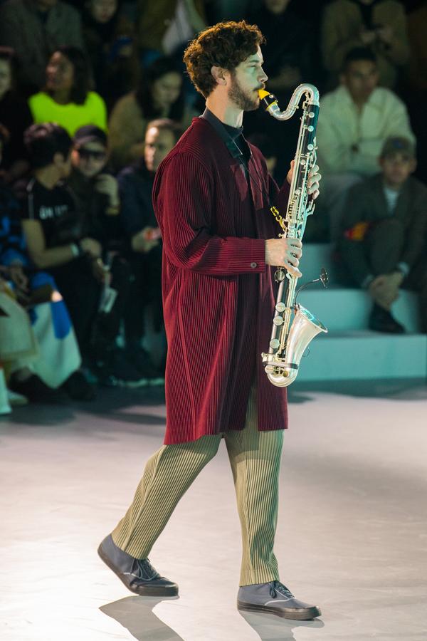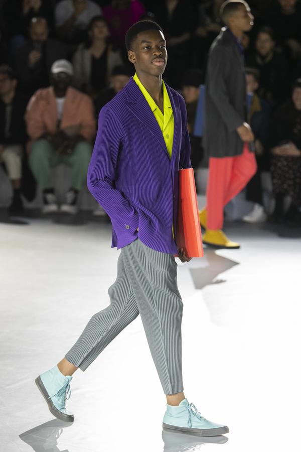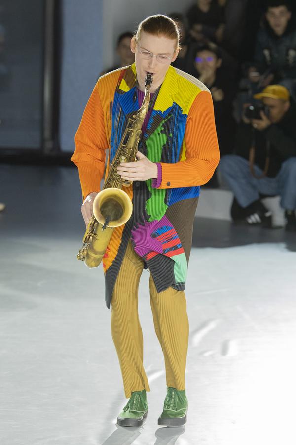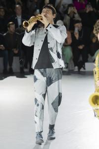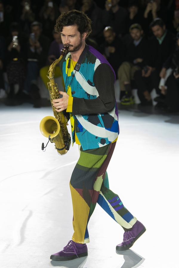 DEFILE « HOMME PLISSE ISSEY MIYAKE » AU CENTRE GEORGES POMPIDOU: Comme elle l’avait déjà fait en juin dernier, la marque a choisi de présenter pour son défilé masculin sa ligne « Homme Plissé Issey Miyake », une ligne très actuelle, décontractée et facile à porter au quotidien. Nous avons à nouveau assisté à une véritable performance artistique imaginée par le chorégraphe américain Daniel Ezralow, jouant sur le mouvement afin de montrer la légèreté et la fluidité des vêtements, et où les mannequins sont aussi musiciens, danseurs ou acrobates. Au programme de cette collection très colorée déclinée dans un large choix de formes: vestes et pantalons plissés très souples, ensembles aux imprimés colorés associés à des chaussures monochromes (jaunes, violettes, vertes, bleu ciel), parkas et imperméables volumineux garnis de motifs graphiques noirs et blancs, tenues en maille avec gilets larges sans manches, pantalons mosaïque, d’autres imperméables colorés (bleu roi, jaune d’or, vermeil, émeraude) décorés au dos d’instruments de musique, une allure japonaise évoquant le kimono dans les lignes des épaules. Pour le final, les mannequins en noeud papillon, chapeau de crooner, costumes et queue de pie taillés dans un tissu plissé ondulé se lancent dans un bal endiablé. Un superbe show, très émouvant et dégageant une grande sensation de liberté et d’énergie.