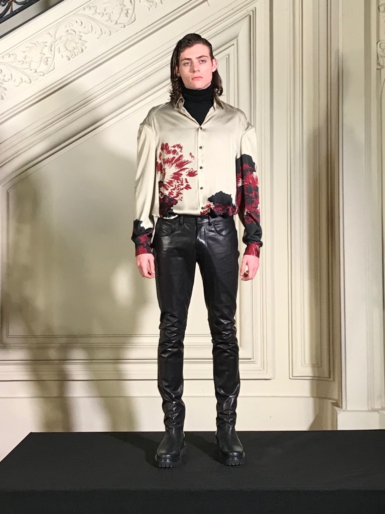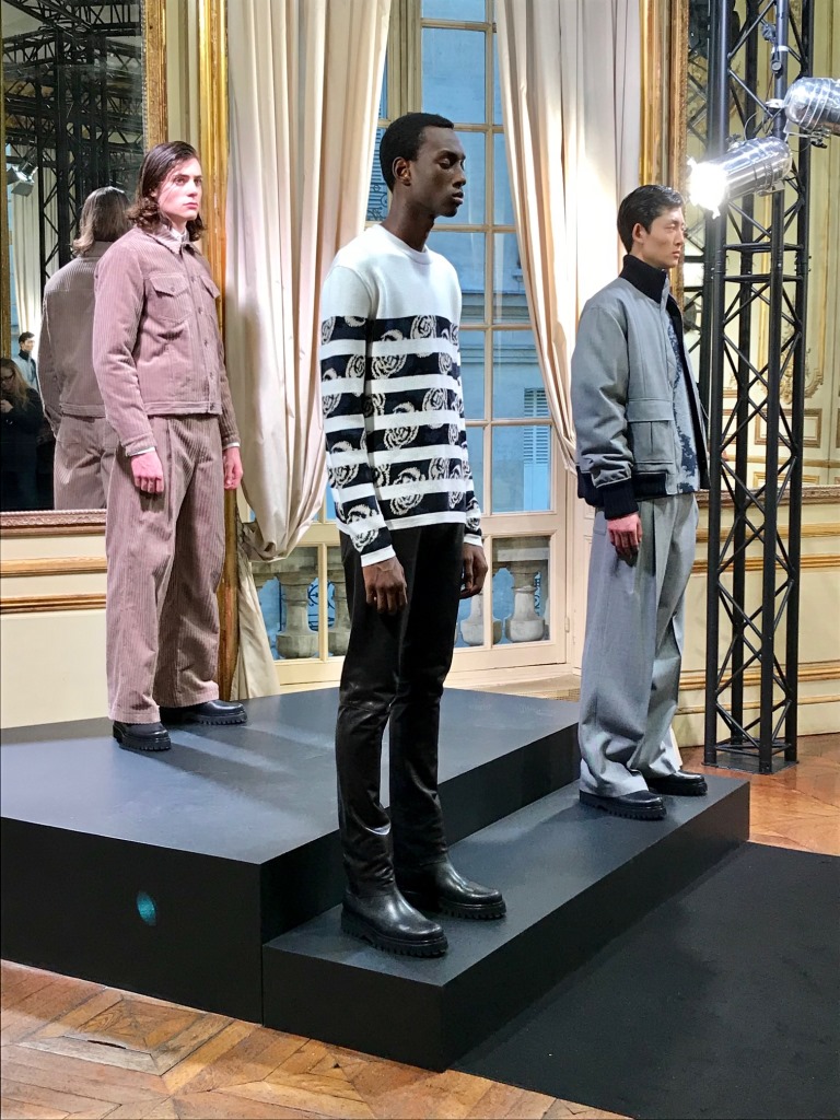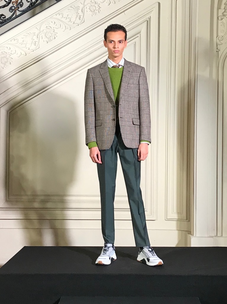 PRESENTATION SMALTO AU SIEGE DE LA MAISON: La Maison Smalto a présenté une nouvelle collection qu’elle a voulue davantage ancrée dans la modernité urbaine, conjuguant formel, casual et une touche sport. Outre les coupes ajustées impeccables et les finitions faites main caractéristiques de la maison, on pouvait ainsi remarquer des rayures tennis sur un pantalon cargo, une veste iconique alliée avec des matières plus sport, un gilet porté à même la peau se glissant sous une veste de smoking, une chemise imprimée associée à un pull col roulé. La palette de couleurs reste très chic avec des gris, blanc et noir dominants. Etaient également présentées certaines pièces issues d’une collaboration inédite avec le jeune designer parisien Louis Gabriel Nouchi, revisitant les proportions des pièces iconiques de Smalto et utilisant des matières recyclables et tissus de fins de stocks de grands fabricants, un créneau nouveau pour Smalto.