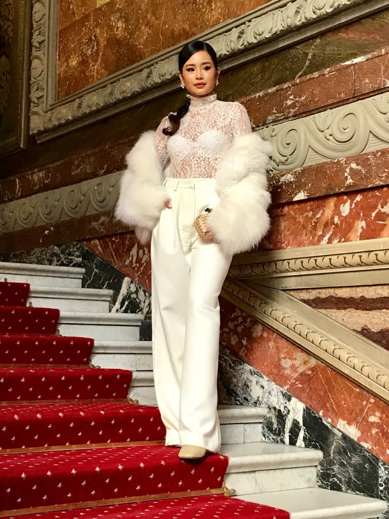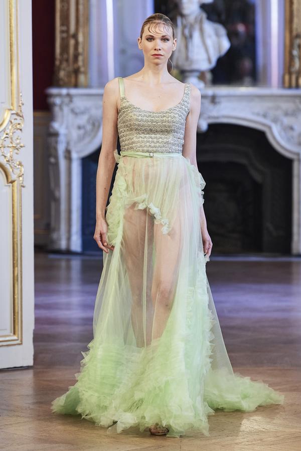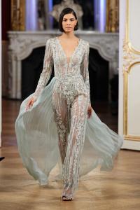 DEFILE LA METAMORPHOSE A L’HOTEL LE MAROIS-FRANCE AMERIQUES: Le duo de créatrices polonaises (Ewa Gawkowska et sa soeur Malgorzata Szczena) qui est à l’origine de la marque a présenté une nouvelle collection intitulée « Les couleurs de l’âme » dédiée à la femme en tant que muse, évanescente inspiration pour les poètes comme Sully Prudhomme. La transparence des tulles est sublimée par les mousselines, les soies, les satins et les taffetas, dans un tourbillon de couleurs fortes alternant avec de délicats pastels. Pour notre plus grand plaisir, Miss France 2019 (Vaimalama Chaves) qui est une grande fan de la marque a chanté un titre de son dernier album dans une tenue rouge spécialement créée pour l’occasion, pour clôturer le défilé, et Miss France 2020 (Clémence Botino) était également présente.