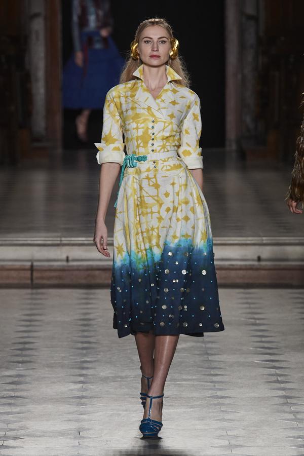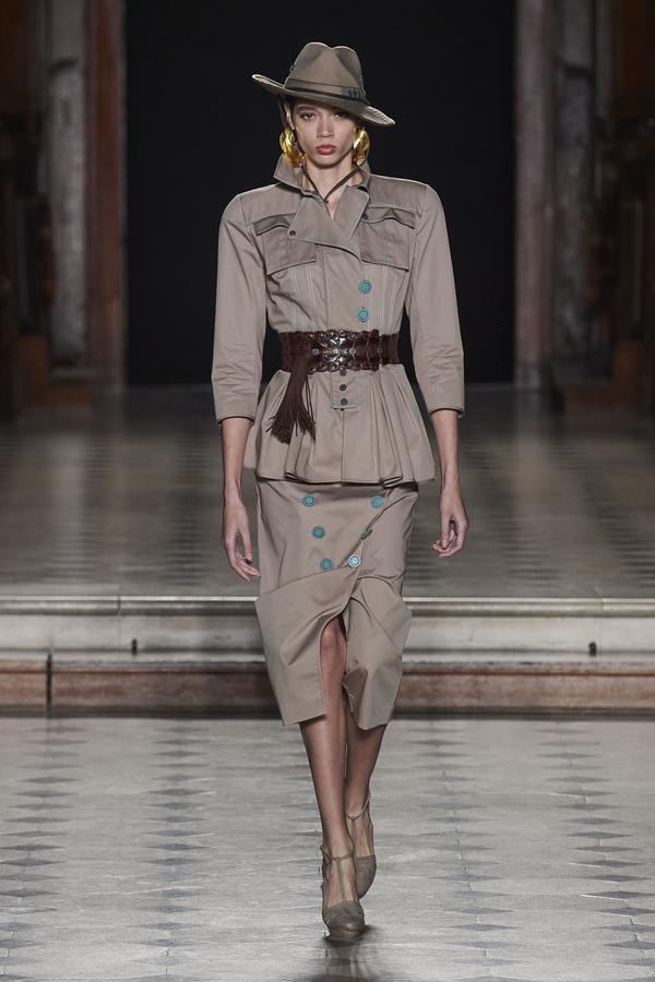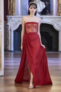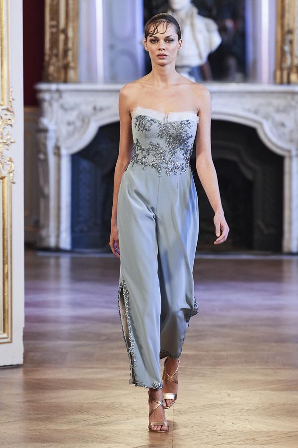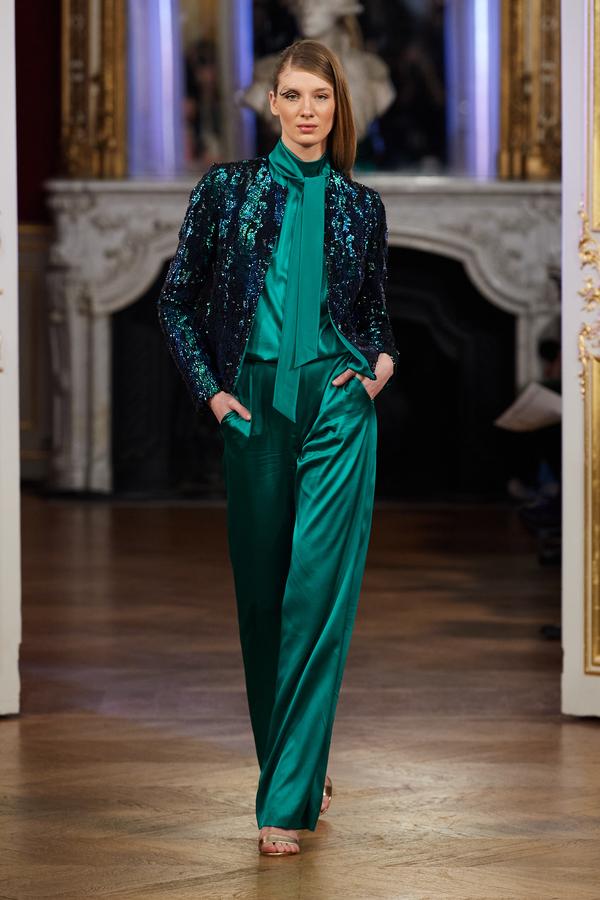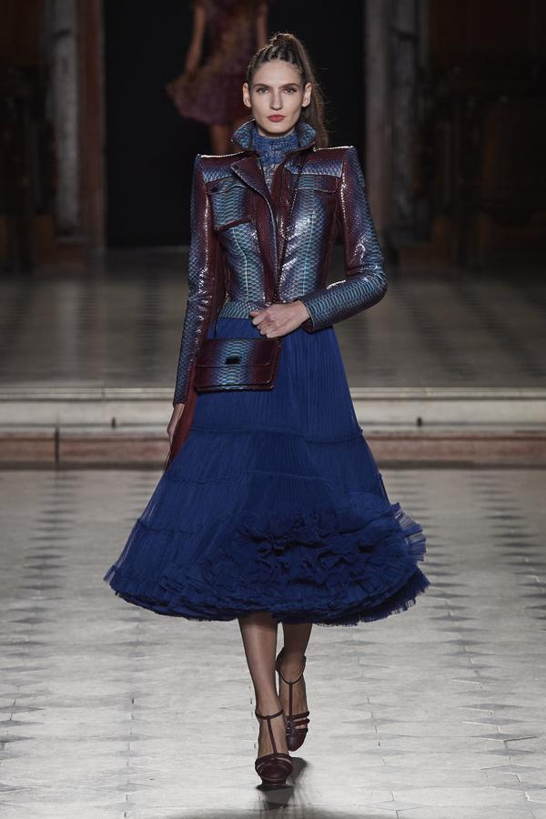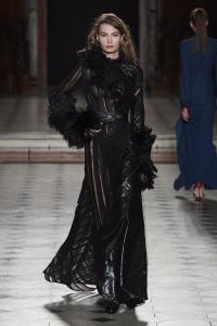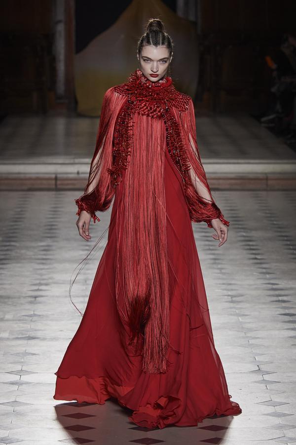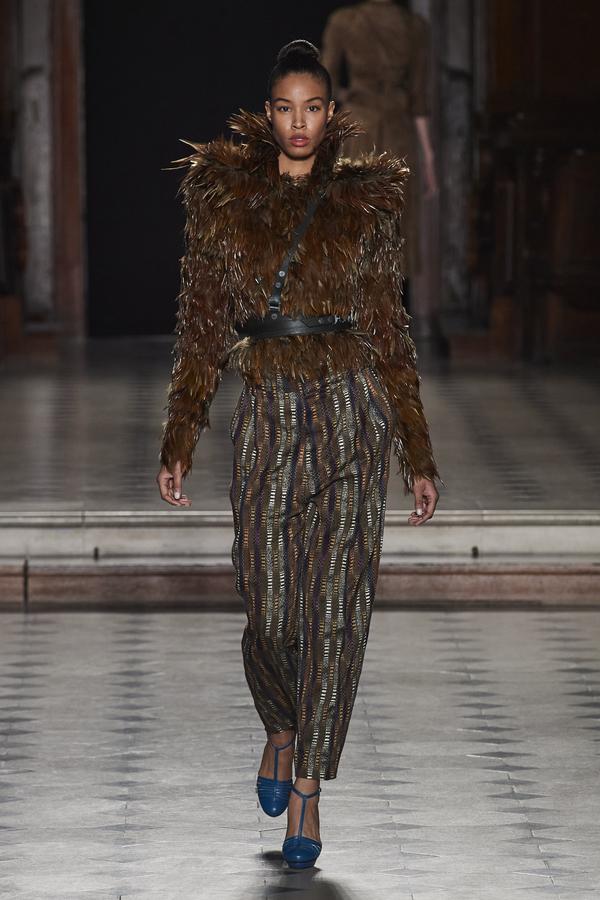 DEFILE JULIEN FOURNIE A L’ORATOIRE DU LOUVRE: Pour cette nouvelle collection intitulée « Premières Conquêtes » le couturier français met en scène des aventurières modernes, éprises de liberté et dont la soif de découvertes et de nouvelles rencontres est une source d’inspiration sans fin pour leurs tenues. Les silhouettes à la coupe parfaitement maîtrisée sont imposantes. Les vêtements, moins corsetés que d’habitude, se parent de broderies-talismans ou de gris-gris qu’on imagine avoir été recueillis au gré de ces pérégrinations. L’allure est structurée au moyen de ceintures à multiples lanières. Sacs, cartouchières et passementeries complètent l’équipement de ces aventurières intrépides et indépendantes.