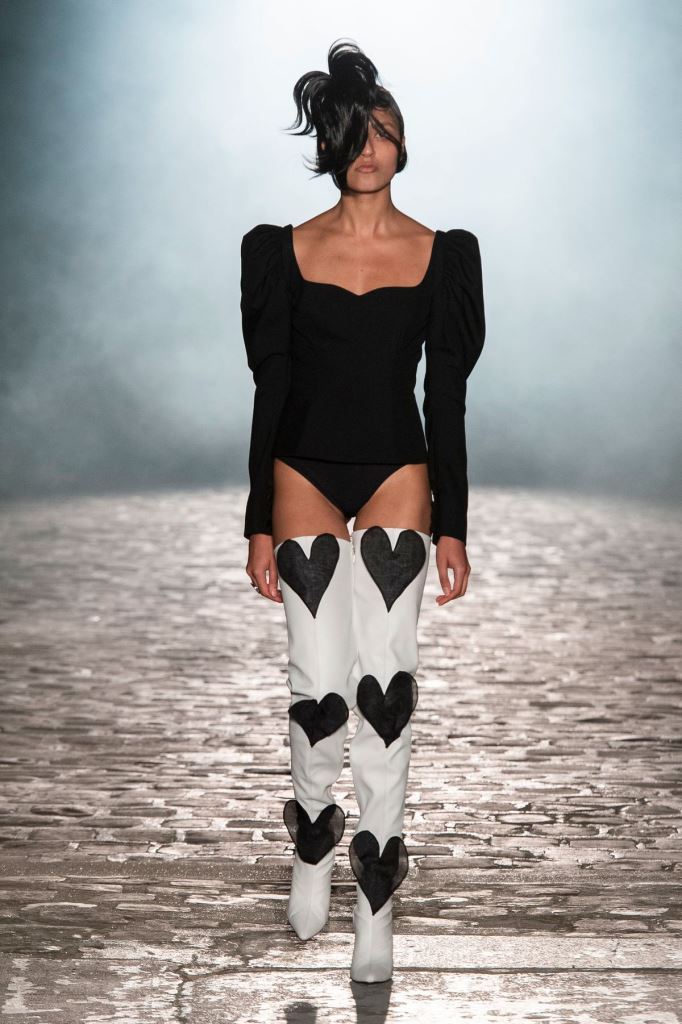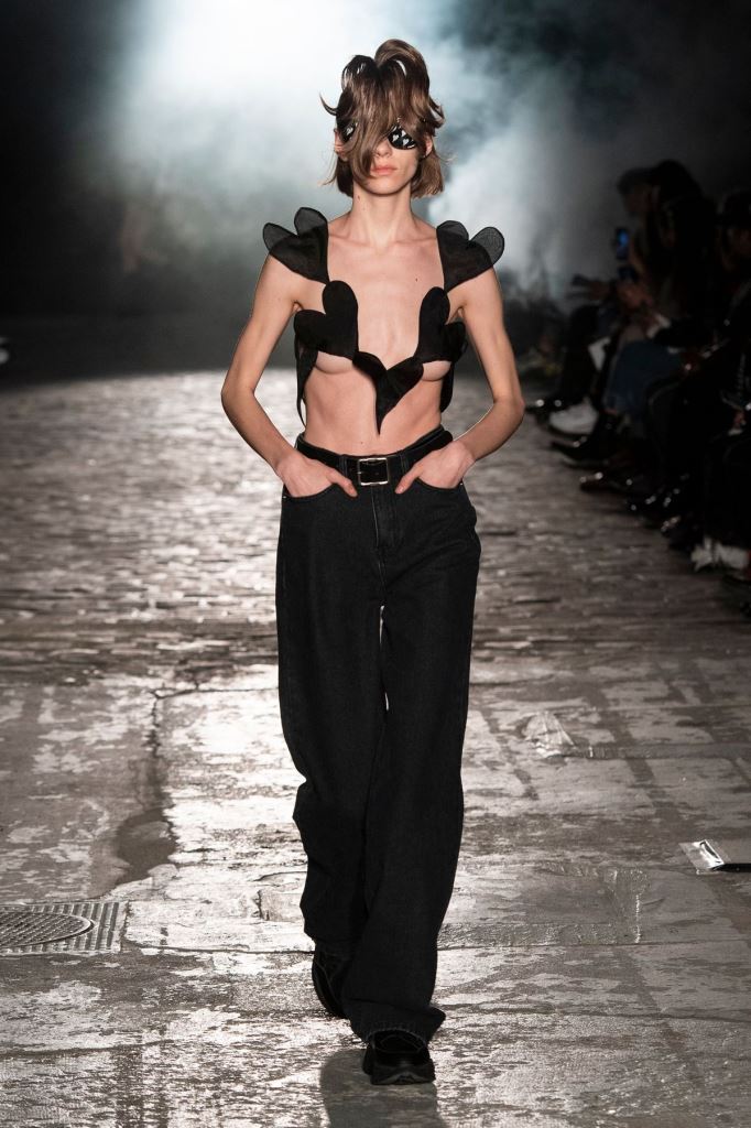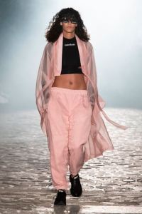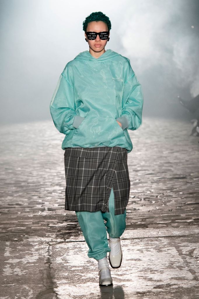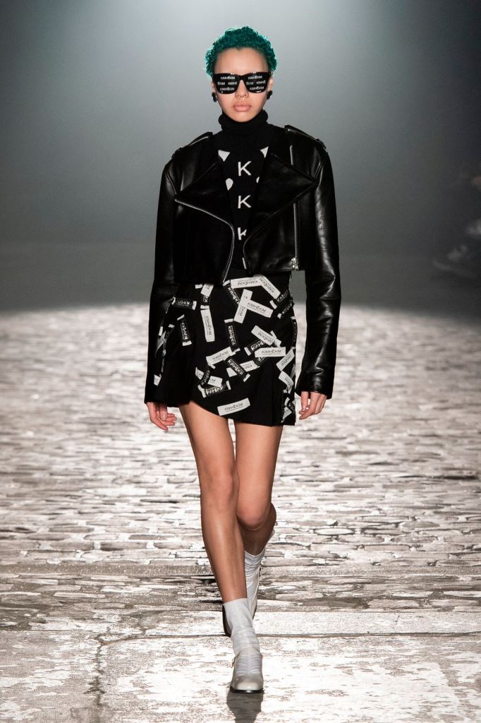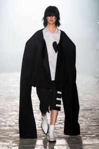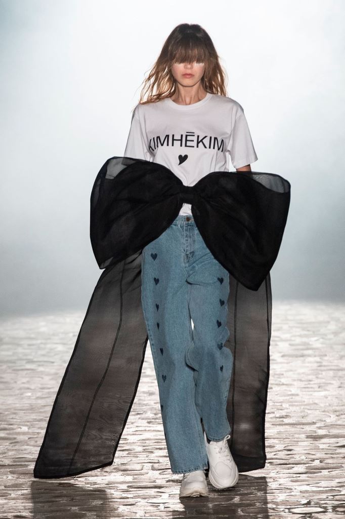 DEFILE KIMHEKIM AU GARAGE LÜBECK: Le jeune créateur sud-coréen Kiminte Kimhékim a présenté une nouvelle déclinaison de ses thèmes favoris, combinant les esthétiques asiatique et européenne, réinterprétant les vêtements traditionnels coréens à sa façon en les mixant avec des pièces sportswear très actuelles. Les jupes, vestes et manteaux traditionnels coréens se combinent ainsi de façon très désirable avec les jogging, capuches, body, brassières et autres cuissardes. Allure sexy et silhouettes asymétriques très contemporaines, sans oublier les grands noeuds chers au créateur.