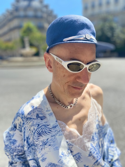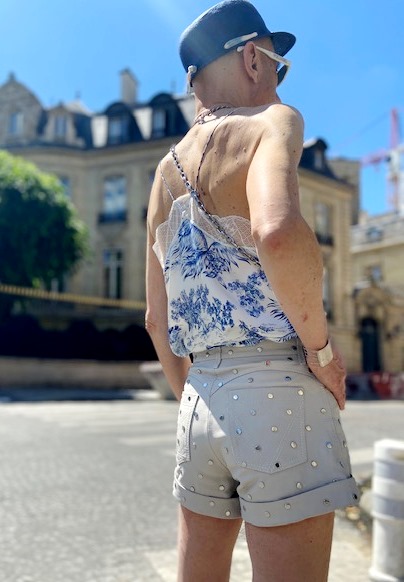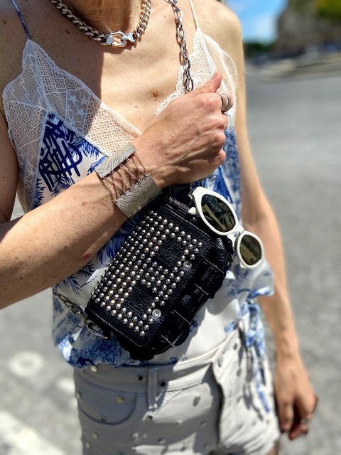 Inspiration bleu toile de Jouy pour ce premier look été 2020. Le côté bucolique de ce motif raffiné nous plonge directement et délicieusement dans l’été. Il est décliné ici sur une robe chemise et un caraco en soie de la collection été 2020 de Zadig&Voltaire, ces superbes pièces étant le fruit d’une collaboration exclusive avec l’artiste vénézuélienne Jormi Graterol (robe « Rais print bleue », caraco « Chris print bleu »). Je les ai assorties avec d’autres pièces remarquables de la collection été 2020 de Zadig&Voltaire comme ce short en cuir agrémenté de clous (short « Scott cuir ») et ces sneakers rose fluo à grosses semelles (modèle « Future »). Et pour finaliser le look: lunettes stylées et petit sac en cuir avec clous et chaîne argentée Zadig&Voltaire (collections antérieures), casquette Maison Michel (collection antérieure), collier en argent Clio Blue, manchettes et bagues en métal argenté Clara Jasmine, soquettes American Apparel (qu’on ne trouve plus en France).