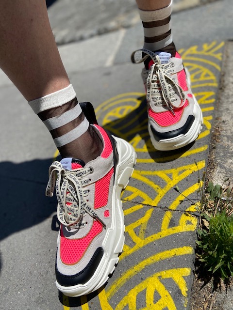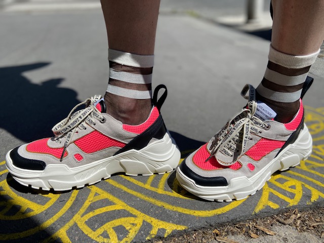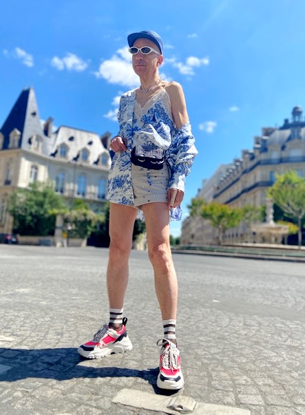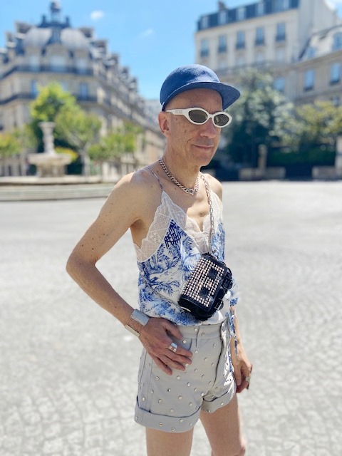 Inspiration bleu toile de Jouy pour ce premier look été 2020. Le côté bucolique de ce motif raffiné nous plonge directement et délicieusement dans l’été. Il est décliné ici sur une robe chemise et un caraco en soie de la collection été 2020 de Zadig&Voltaire, ces superbes pièces étant le fruit d’une collaboration exclusive avec l’artiste vénézuélienne Jormi Graterol (robe « Rais print bleue », caraco « Chris print bleu »). Je les ai assorties avec d’autres pièces remarquables de la collection été 2020 de Zadig&Voltaire comme ce short en cuir agrémenté de clous (short « Scott cuir ») et ces sneakers rose fluo à grosses semelles (modèle « Future »). Et pour finaliser le look: lunettes stylées et petit sac en cuir avec clous et chaîne argentée Zadig&Voltaire (collections antérieures), casquette Maison Michel (collection antérieure), collier en argent Clio Blue, manchettes et bagues en métal argenté Clara Jasmine, soquettes American Apparel (qu’on ne trouve plus en France).