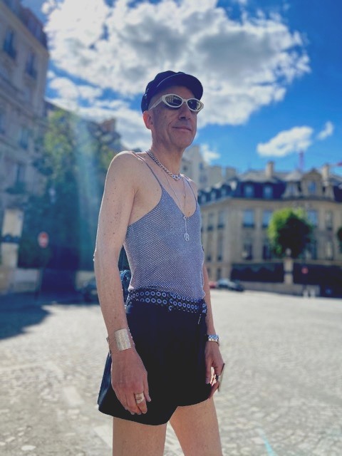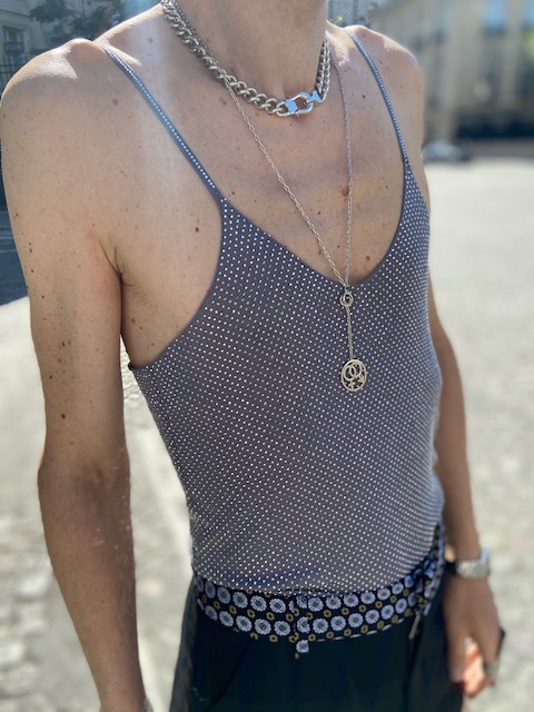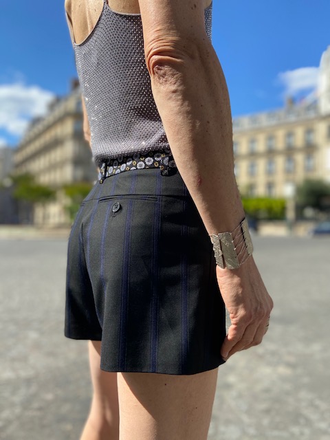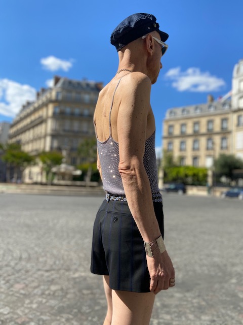 Quand le gris devient sexy…, avec ce superbe caraco recouvert de strass! Cet été, laissez libre cours à votre créativité avec ces très jolies pièces de la collection Zadig&Voltaire été 2020: caraco gris « Marga Strass », short noir à la coupe parfaite avec fines rayures bleues et garni d’imprimés jacquard « Pink », bottes en cuir style western avec surpiqûres colorées (rouge/doré) « Rockland suede ». Pour les accessoires: casquette en jean « Navy » et lunettes blanches Zadig&Voltaire (collections antérieures), collier ras-du-cou et sautoir en argent Clio Blue, manchette et bagues en métal argenté Clara Jasmine.