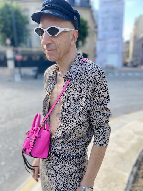 Une combinaison est toujours une bonne idée de tenue pour l’été, surtout dans une matière très légère et avec de jolis imprimés, en l’accompagnant d’une fine ceinture pour marquer la taille avantageusement. Combinaison Print Leo imprimé léopard, petit sac Candide Nano Zip en cuir rose fluo: Zadig&Voltaire collection été 2020. Ceinture fine en cuir clouté, casquette en jean « Navy », lunettes blanches, chaussures à talons dorés et lanières en cuir rose avec clous (dorés): Zadig&Voltaire collections antérieures. Collier ras-du-cou et sautoir en argent Clio Blue. Manchette et bagues en métal argenté Clara Jasmine