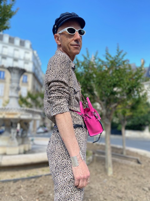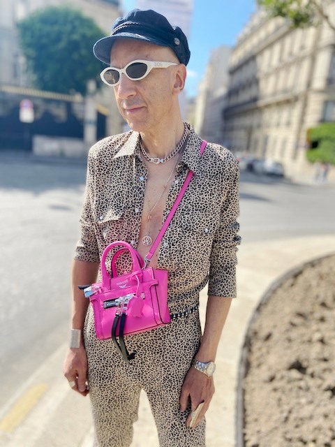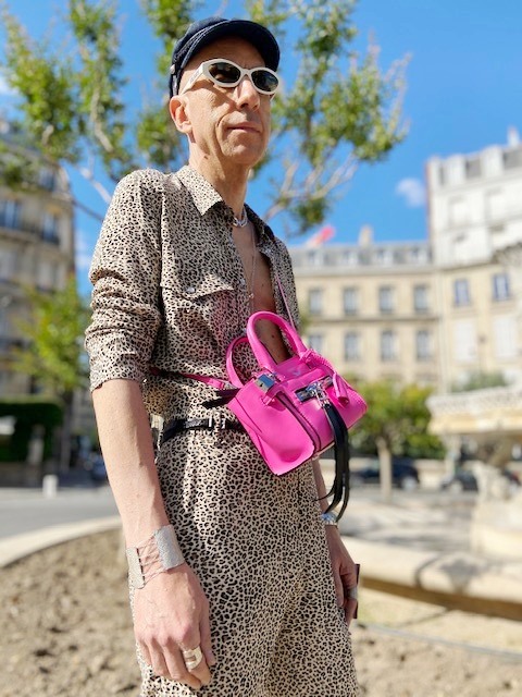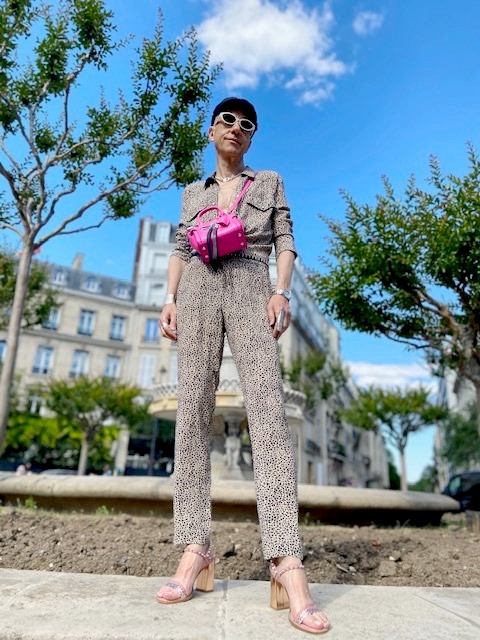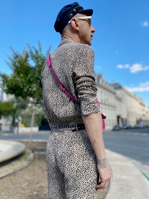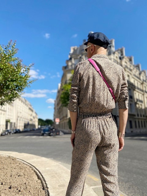Une combinaison est toujours une bonne idée de tenue pour l’été, surtout dans une matière très légère et avec de jolis imprimés, en l’accompagnant d’une fine ceinture pour marquer la taille avantageusement. Combinaison Print Leo imprimé léopard, petit sac Candide Nano Zip en cuir rose fluo: Zadig&Voltaire collection été 2020. Ceinture fine en cuir clouté, casquette en jean « Navy », lunettes blanches, chaussures à talons dorés et lanières en cuir rose avec clous (dorés): Zadig&Voltaire collections antérieures. Collier ras-du-cou et sautoir en argent Clio Blue. Manchette et bagues en métal argenté Clara Jasmine