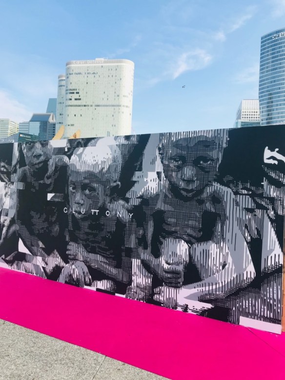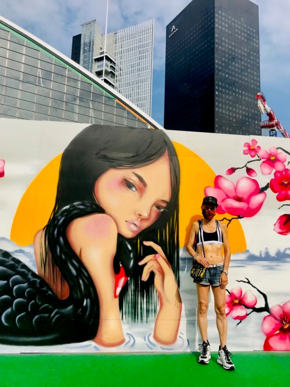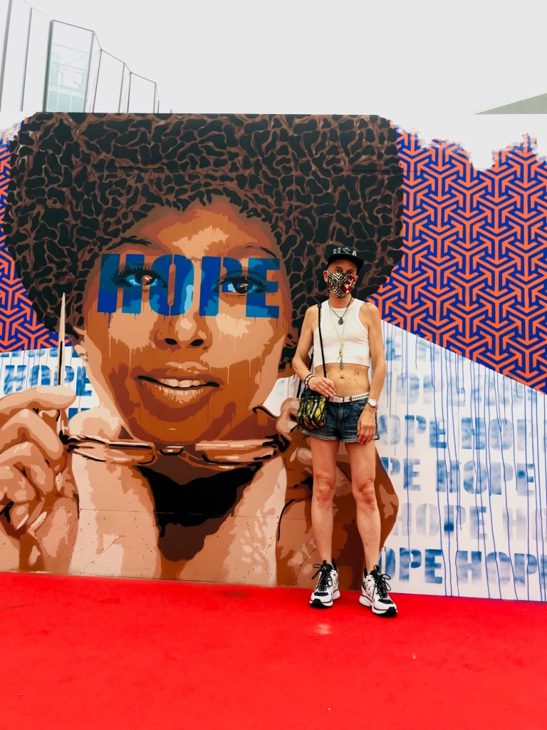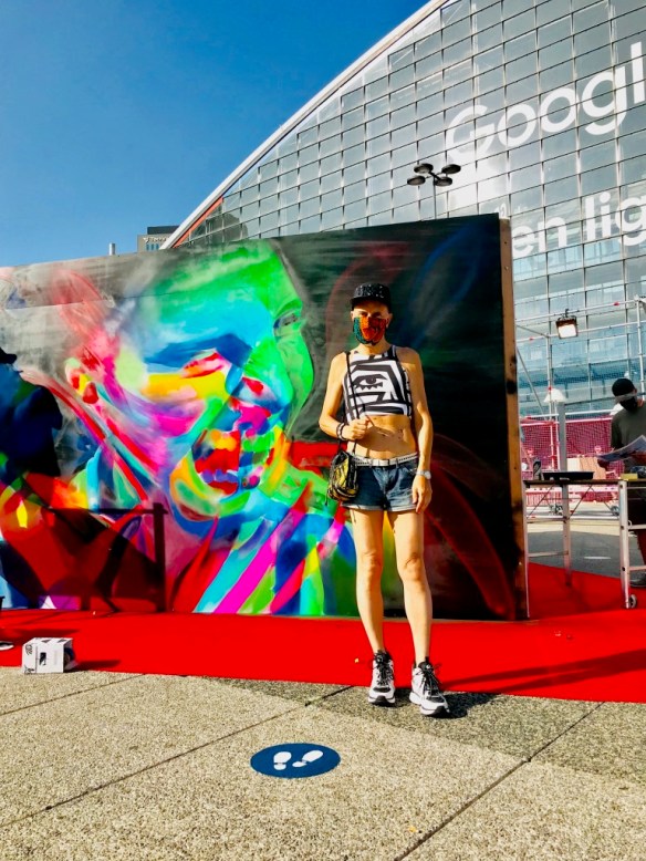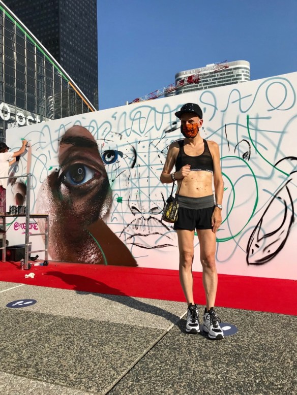 Bien évidemment je n’ai pas résisté au plaisir de me faire photographier devant les oeuvres avec ma tenue de chaque jour, une ode au crop top, bien nécessaire par les temps qui courent! Les masques sont de la marque AzaCh, qui exposait parmi les jeunes créateurs de mode invités.