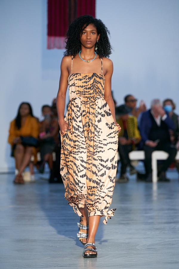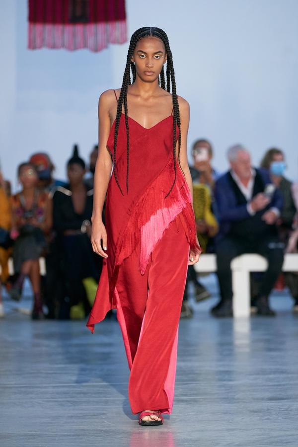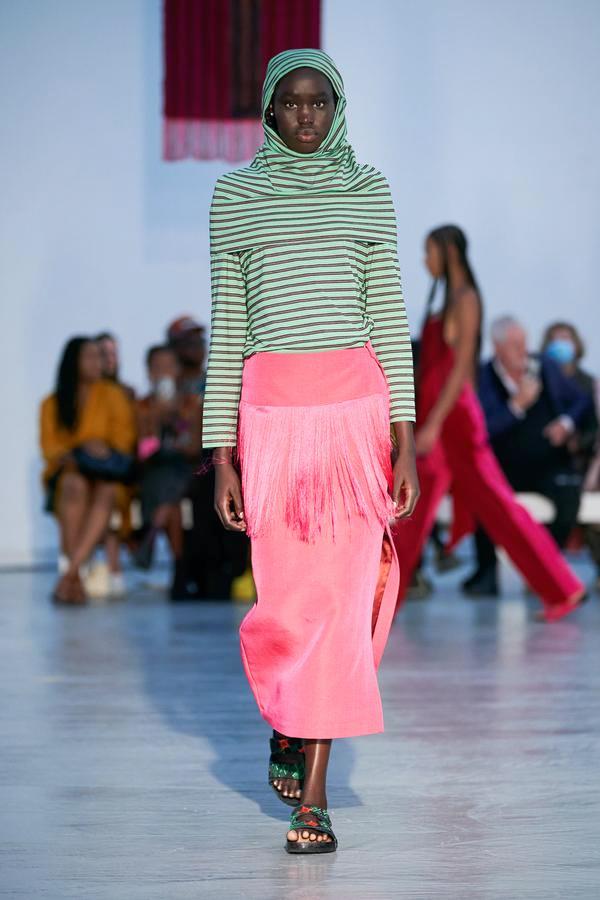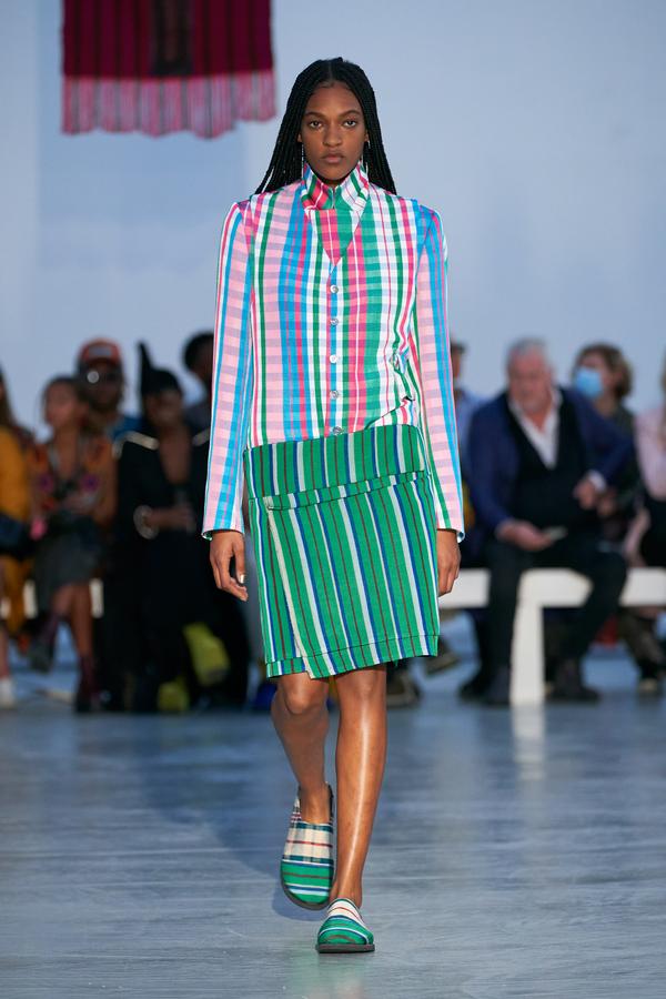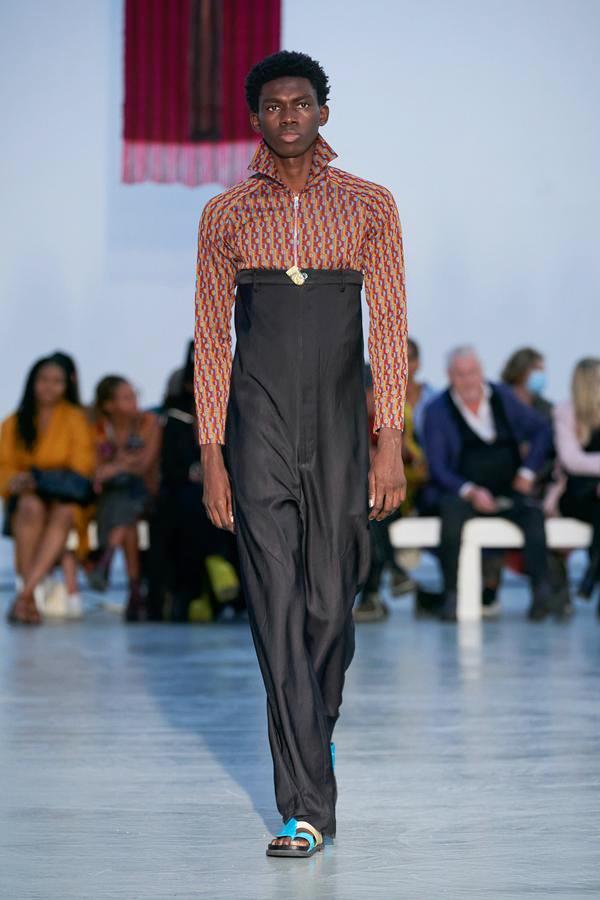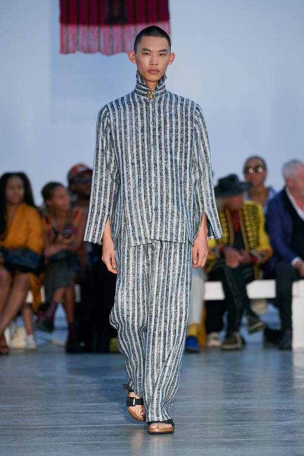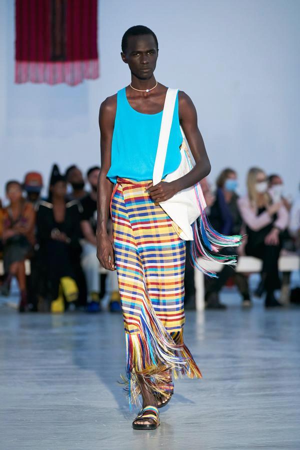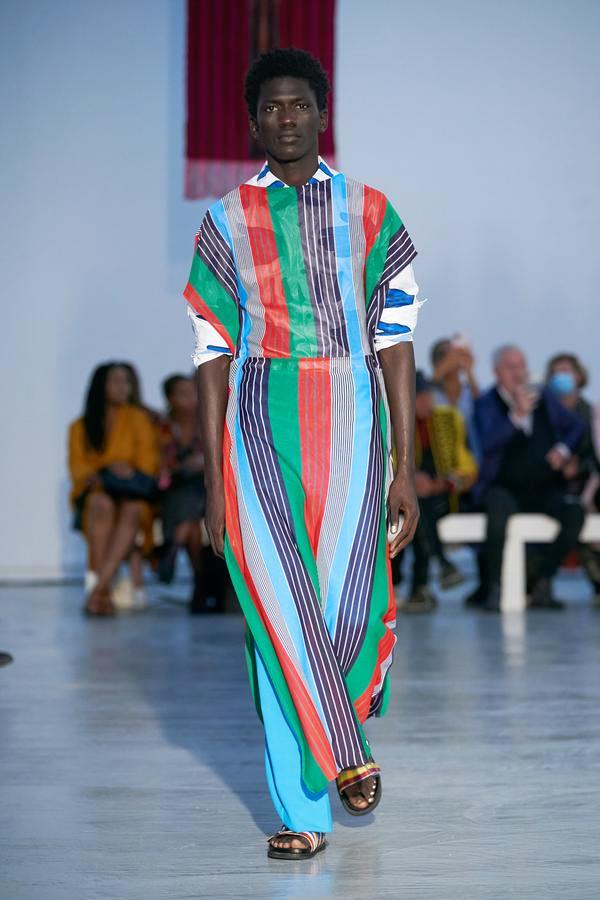 DEFILE KENNETH IZE AU PALAIS DE TOKYO: Le jeune créateur nigérian qui a été élevé en Autriche a ouvert la Fashion Week parisienne avec une collection émouvante s’appuyant sur des matériaux traditionnels africains revisités dans un esprit contemporain. Il met ainsi en lumière l’artisanat nigérian à travers des tissus « aso oke », une étoffe tissée à la main par le peuple yoruba pour confectionner des vêtements traditionnels pour les grandes occasions. La collection mixte se déploie dans une palette de couleurs vives pleine d’énergie et dans une explosion de rayures, lignes graphiques et géométriques qui se superposent sans retenue. Au niveau des coupes on retiendra tout particulièrement les robes à franges, les jupes pour les deux sexes juste attachées par un bouton, de superbes chemises d’homme agrémentées de cols montants remarquables, un pantalon original à taille très haute qui remonte jusqu’au torse et les sandales colorées assorties aux tenues. Chic et décontracté à la fois, un talent très prometteur!