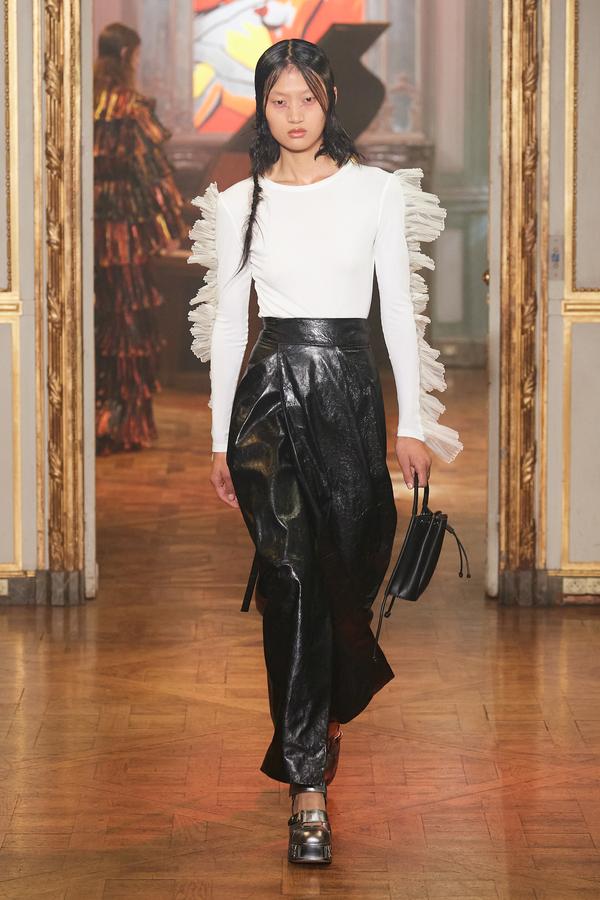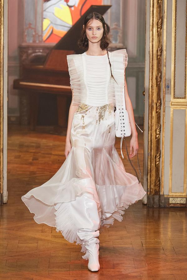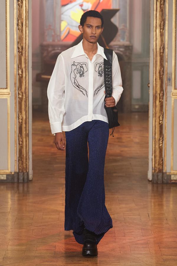 DEFILE ROCHAS A L’HOTEL (PARTICULIER) MONA BISMARCK: C’était l’un des événements les plus attendus de cette Fashion Week parisienne: les débuts du jeune créateur de 24 ans Charles de Vilmorin en tant que directeur artistique de la vénérable maison Rochas fondée à Paris en 1925. Et il n’a pas déçu. Son regard saisissant de nouveauté, tout en juxtapositions, s’est déployé dans une collection mixte flamboyante mettant en scène ses imprimés fétiches, des dessins naïfs colorés ou en noir et blanc représentant des fleurs ou des coeurs, déclinés sur de longues robes vaporeuses, des ensembles pantalons pour le soir ornés d’empiècements dorés, des robes-chemises aux manches finement travaillées ou de grands jupons aériens. Des éléments en tulle bien raide sont fixés sur toutes sortes de manches, épaules et ourlets, comme des ailerons de poisson. Des chemises masculines ornées de ses croquis fantasmagoriques en guise de finition répondent aux robes tente en popeline blanche. Les bottes architecturées et colorées sont tout simplement remarquables. Bravo!