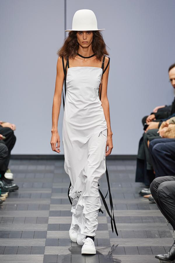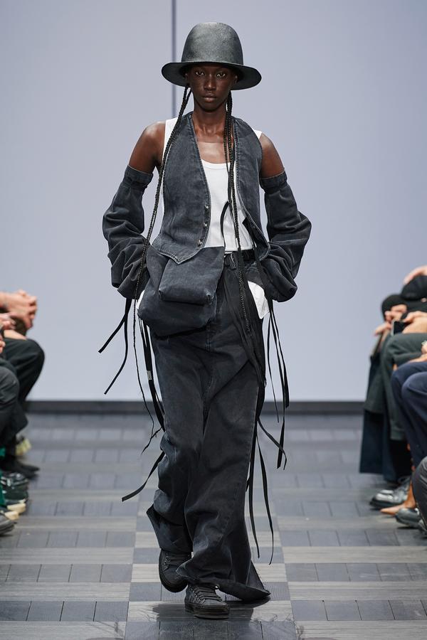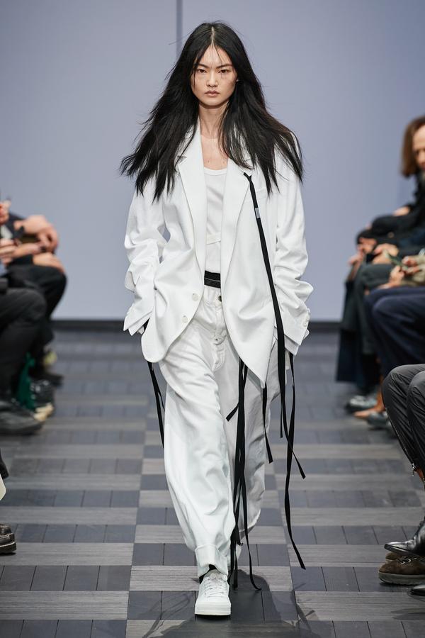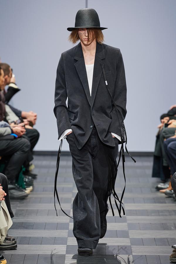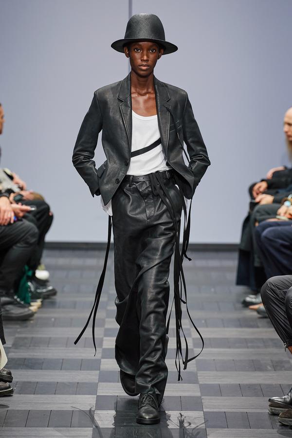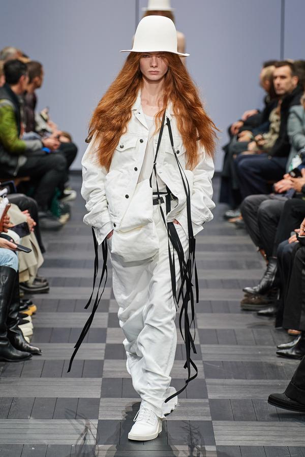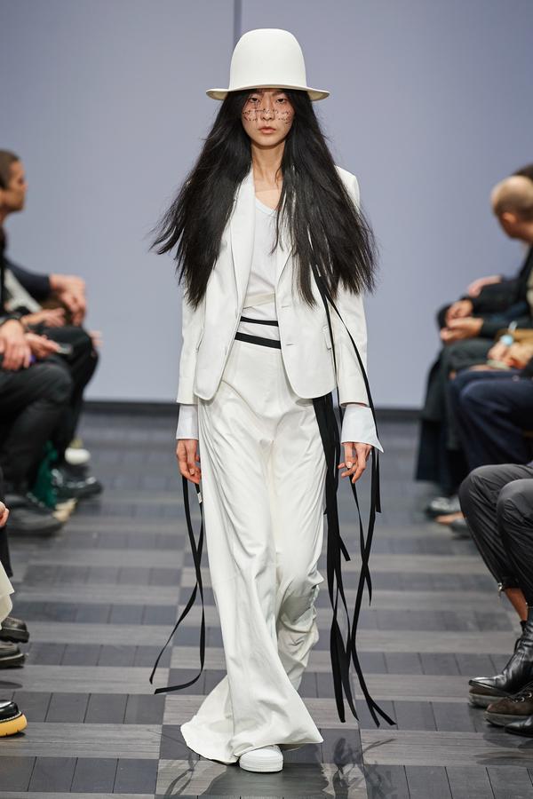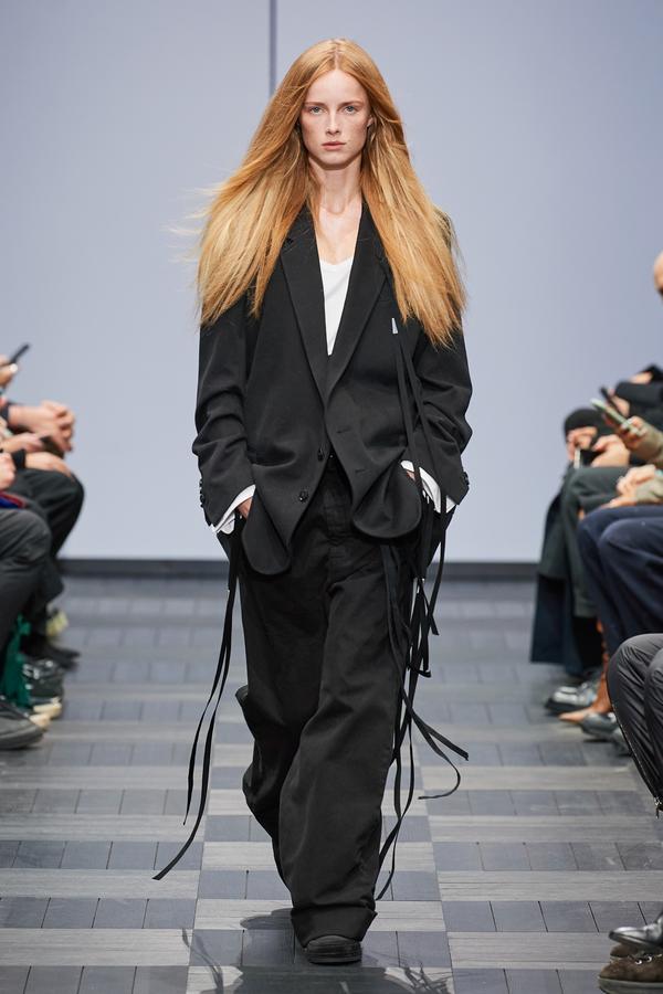 DEFILE ANN DEMEULEMEESTER AU LYCEE CARNOT: La marque est dans une période de transition après le départ de son directeur de création Sébastien Meunier l’an dernier et son rachat par le détaillant italien Claudio Antonioli, co-fondateur du New Guards Group, qui a notamment propulsé Off-White sur la scène internationale. Cette collection mixte conçue par une équipe artistique interne, entièrement en noir et blanc avec quelques nuances de gris, est un véritable hommage à la fondatrice de la marque. On y retrouve de nombreux éléments signature de la maison: cordons multiples, oeillets placés à des endroits improbables, ceintures qui traînent et expressions décalées inscrites sur des T-shirts. La plupart des mannequins portent des chapeaux de caractère: hauts de forme de planteur ou melons de playboy des colonies, aux minces rebords garnis de satin. Les silhouettes sont amples et décontractées: vestes oversize, pantalons bouffants à larges revers pour les hommes comme pour les femmes. Les coupes sont enveloppantes et flatteuses. Les vestes croisées à revers infinis, les manteaux de style édouardien portés avec des fourreaux en maille étirée et les super-manteaux de rockeur en cuir mat confèrent à l’ensemble une élégance nonchalante caractéristique du style néo-romantique qui a fait la notoriété de la marque.