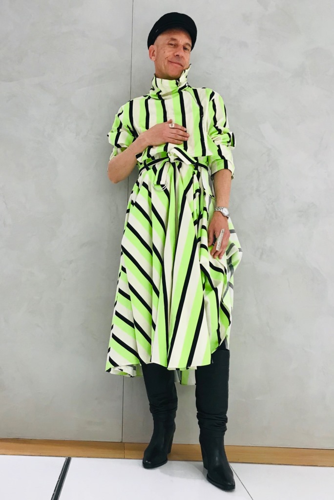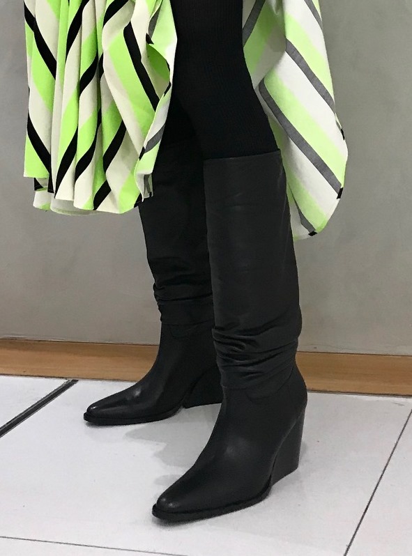 Un très joli look pour les fêtes, particulièrement original, avec cette magnifique robe Kenzo très stylée grâce à son col montant zippé qui se ferme par un bouton-pression et ses rayures sublimées par cette superbe tonalité vert absinthe très flashy. Un vent de fraîcheur et de liberté pour cet hiver! Le look se complète à merveille avec ces bottes en cuir plissé souple dont l’effet drapé au-dessus de la cheville est remarquable; talon à la forme originale très confortable pour marcher; bout pointu (également collection Kenzo automne-hiver 2021/2022). Accessoires: casquette Galeries Lafayette, bagues en métal argenté Clara Jasmine.