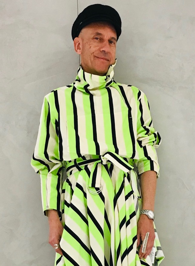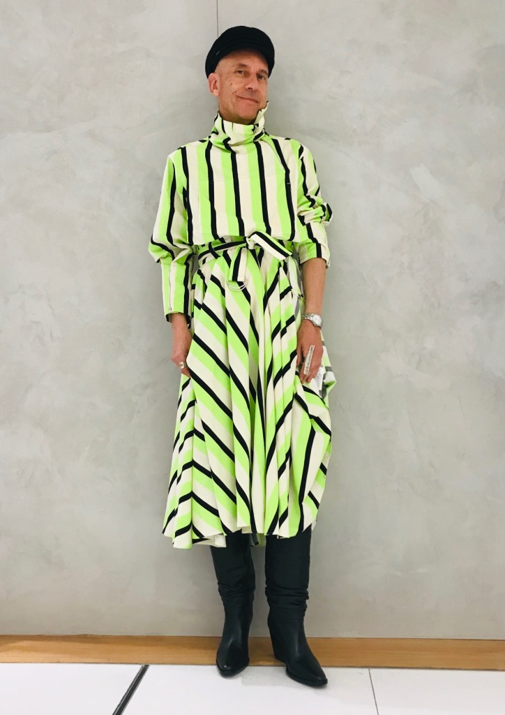 Un très joli look pour les fêtes, particulièrement original, avec cette magnifique robe Kenzo très stylée grâce à son col montant zippé qui se ferme par un bouton-pression et ses rayures sublimées par cette superbe tonalité vert absinthe très flashy. Un vent de fraîcheur et de liberté pour cet hiver! Le look se complète à merveille avec ces bottes en cuir plissé souple dont l’effet drapé au-dessus de la cheville est remarquable; talon à la forme originale très confortable pour marcher; bout pointu (également collection Kenzo automne-hiver 2021/2022). Accessoires: casquette Galeries Lafayette, bagues en métal argenté Clara Jasmine.
