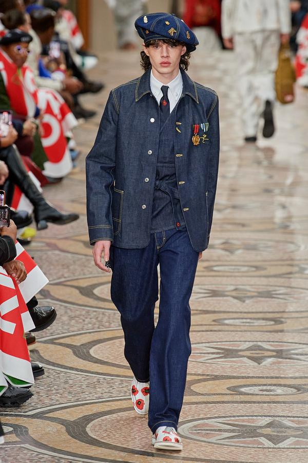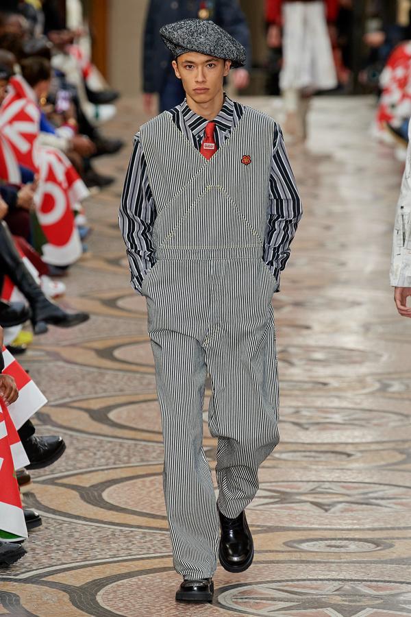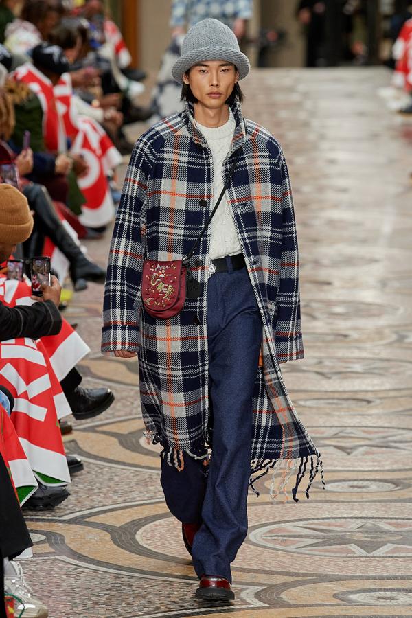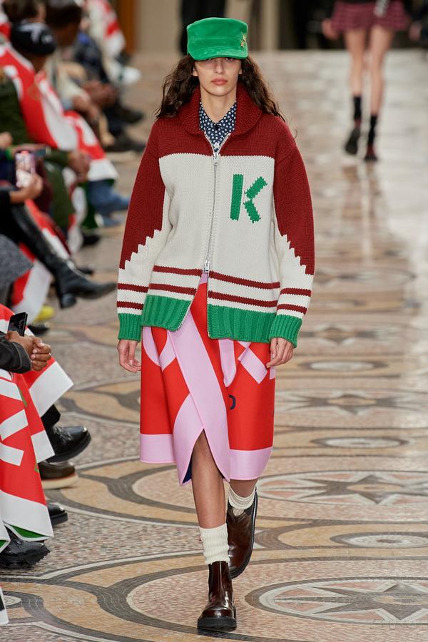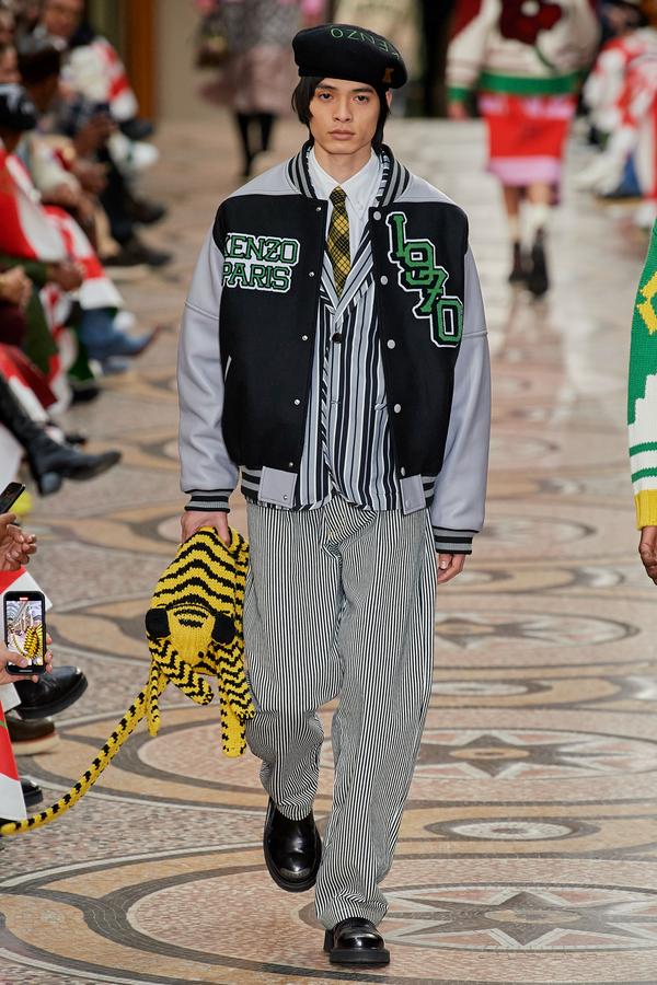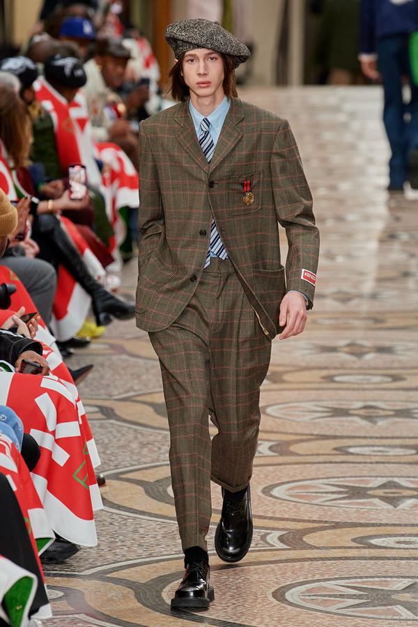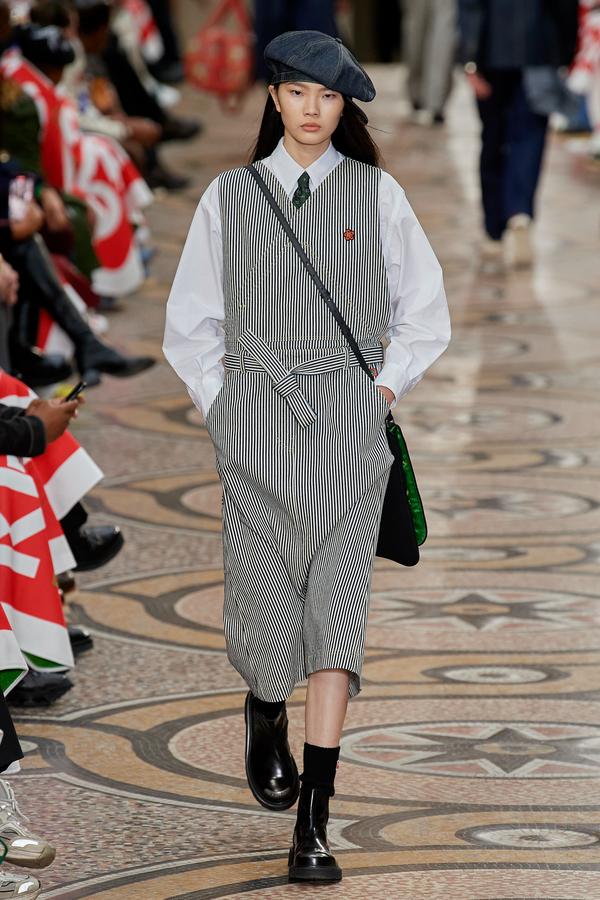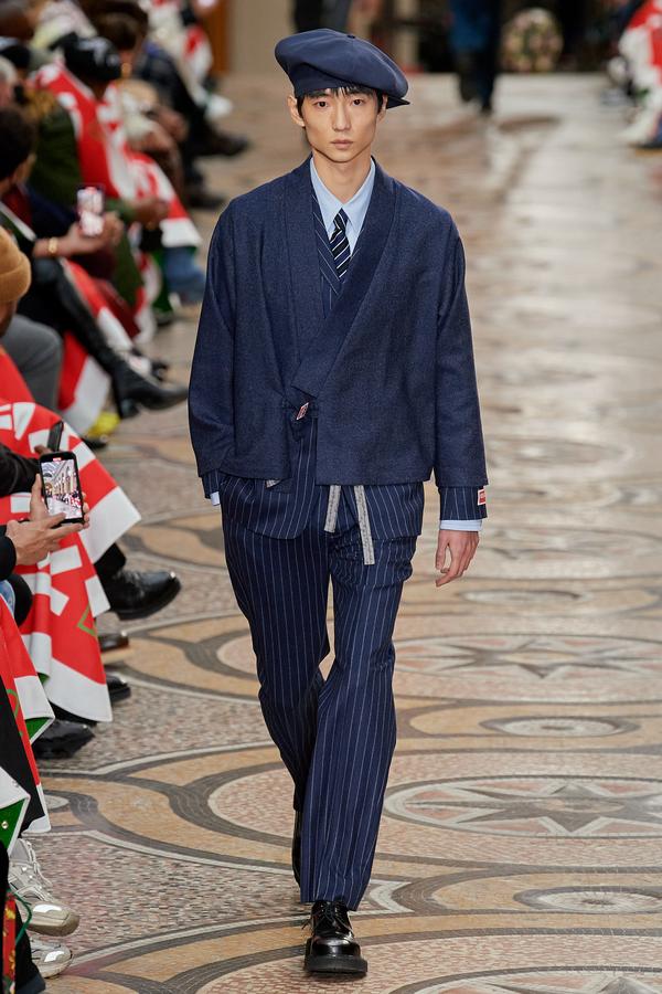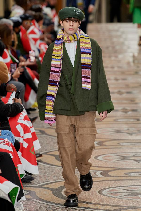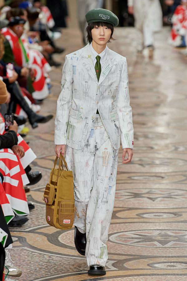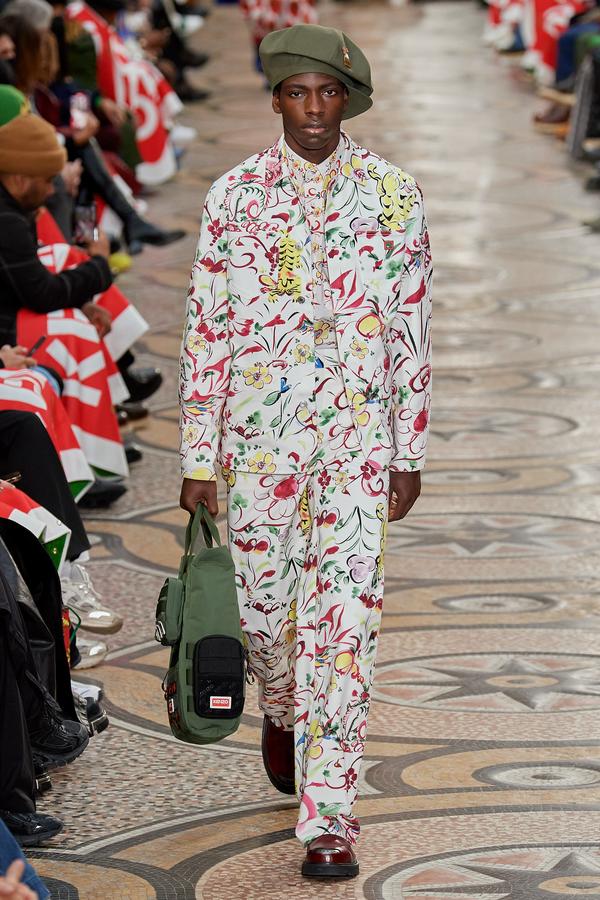 DEFILE KENZO A LA GALERIE VIVIENNE: Ce défilé était très attendu, car c’était la première collection présentée par Nigo, nouveau directeur artistique de la marque, premier designer japonais à diriger la maison depuis Kenzo Takada et grande figure du streetwear au Japon. Le choix de la Galerie Vivienne était un hommage au fondateur, car c’est là que Kenzo Takada avait présenté son premier défilé parisien en 1970. Nigo a repris avec talent l’ADN de la marque tout en y greffant sa propre touche. On trouve ainsi dans cette collection mixte très colorée une foison d’imprimés floraux (comme le fameux imprimé Poppy de coquelicots ou des compositions florales peintes à l’aquarelle et imprimées sur les vêtements), des rayures fines ou effet tigre, du prince de Galles et du tartan revisité. Les coupes sont plus preppy que streetwear, avec de nombreuses chemises et robes-chemises midi, cravates et costumes trois pièces à pantalons amples ou ajustés, des bérets et autres couvre-chefs d’inspiration très parisienne. Mais on y trouve également du denim japonais, l’association de teddys et autres pulls en maille colorés aux robes et pantalons droits, des vestes bicolores avec de forts contrastes entre couleurs vives. Un début très prometteur!