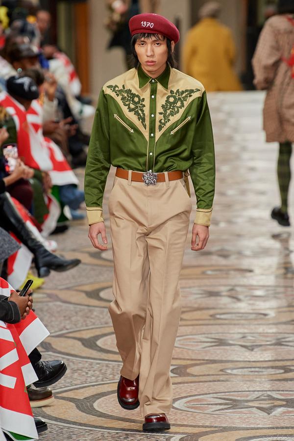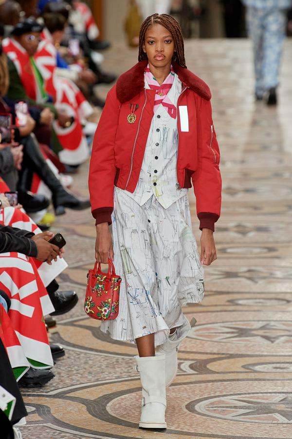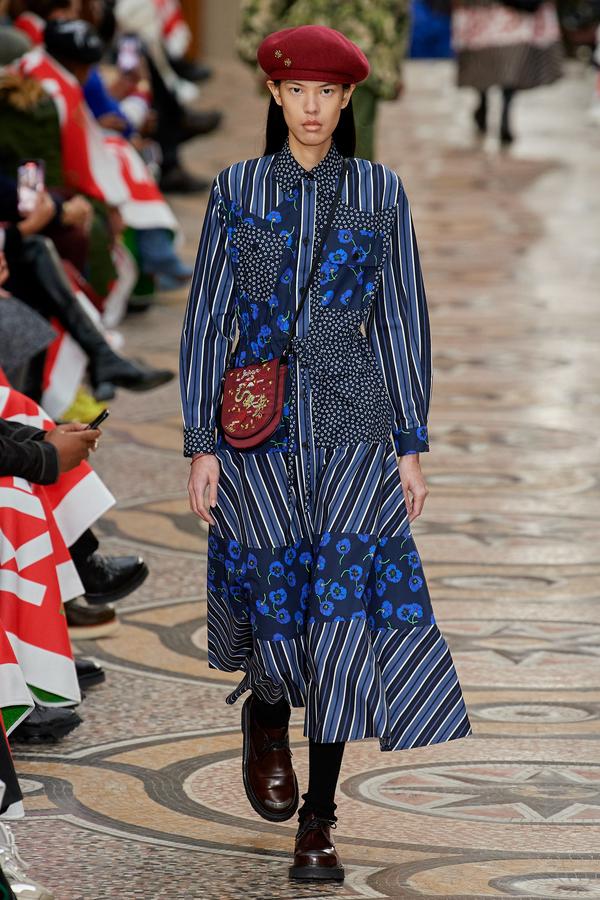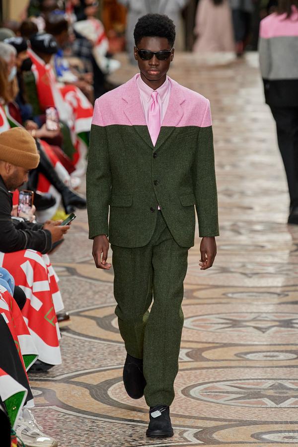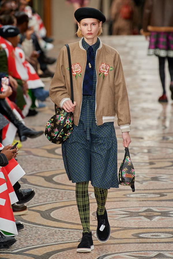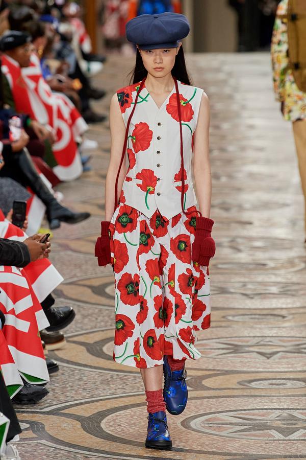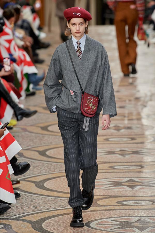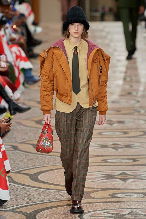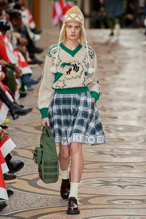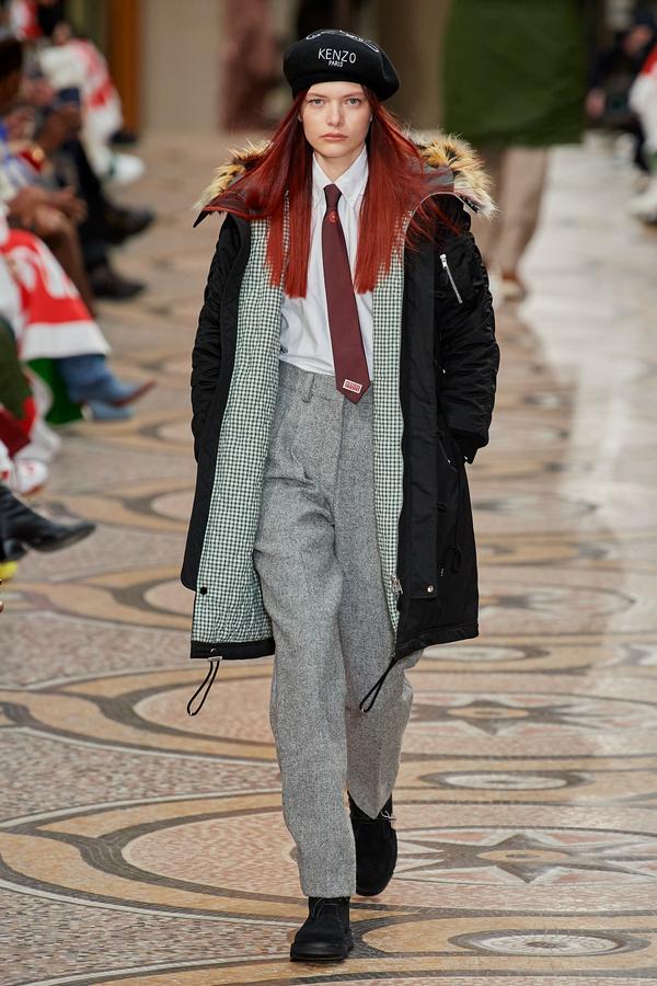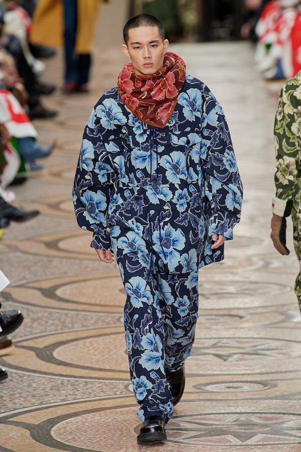 DEFILE KENZO A LA GALERIE VIVIENNE: Ce défilé était très attendu, car c’était la première collection présentée par Nigo, nouveau directeur artistique de la marque, premier designer japonais à diriger la maison depuis Kenzo Takada et grande figure du streetwear au Japon. Le choix de la Galerie Vivienne était un hommage au fondateur, car c’est là que Kenzo Takada avait présenté son premier défilé parisien en 1970. Nigo a repris avec talent l’ADN de la marque tout en y greffant sa propre touche. On trouve ainsi dans cette collection mixte très colorée une foison d’imprimés floraux (comme le fameux imprimé Poppy de coquelicots ou des compositions florales peintes à l’aquarelle et imprimées sur les vêtements), des rayures fines ou effet tigre, du prince de Galles et du tartan revisité. Les coupes sont plus preppy que streetwear, avec de nombreuses chemises et robes-chemises midi, cravates et costumes trois pièces à pantalons amples ou ajustés, des bérets et autres couvre-chefs d’inspiration très parisienne. Mais on y trouve également du denim japonais, l’association de teddys et autres pulls en maille colorés aux robes et pantalons droits, des vestes bicolores avec de forts contrastes entre couleurs vives. Un début très prometteur!