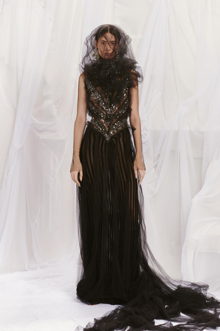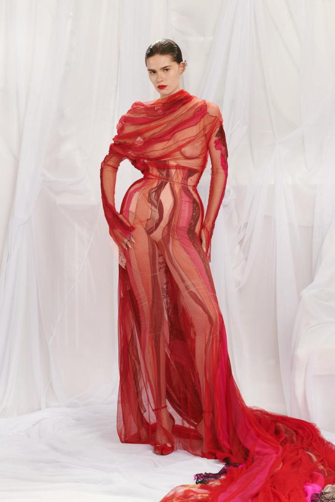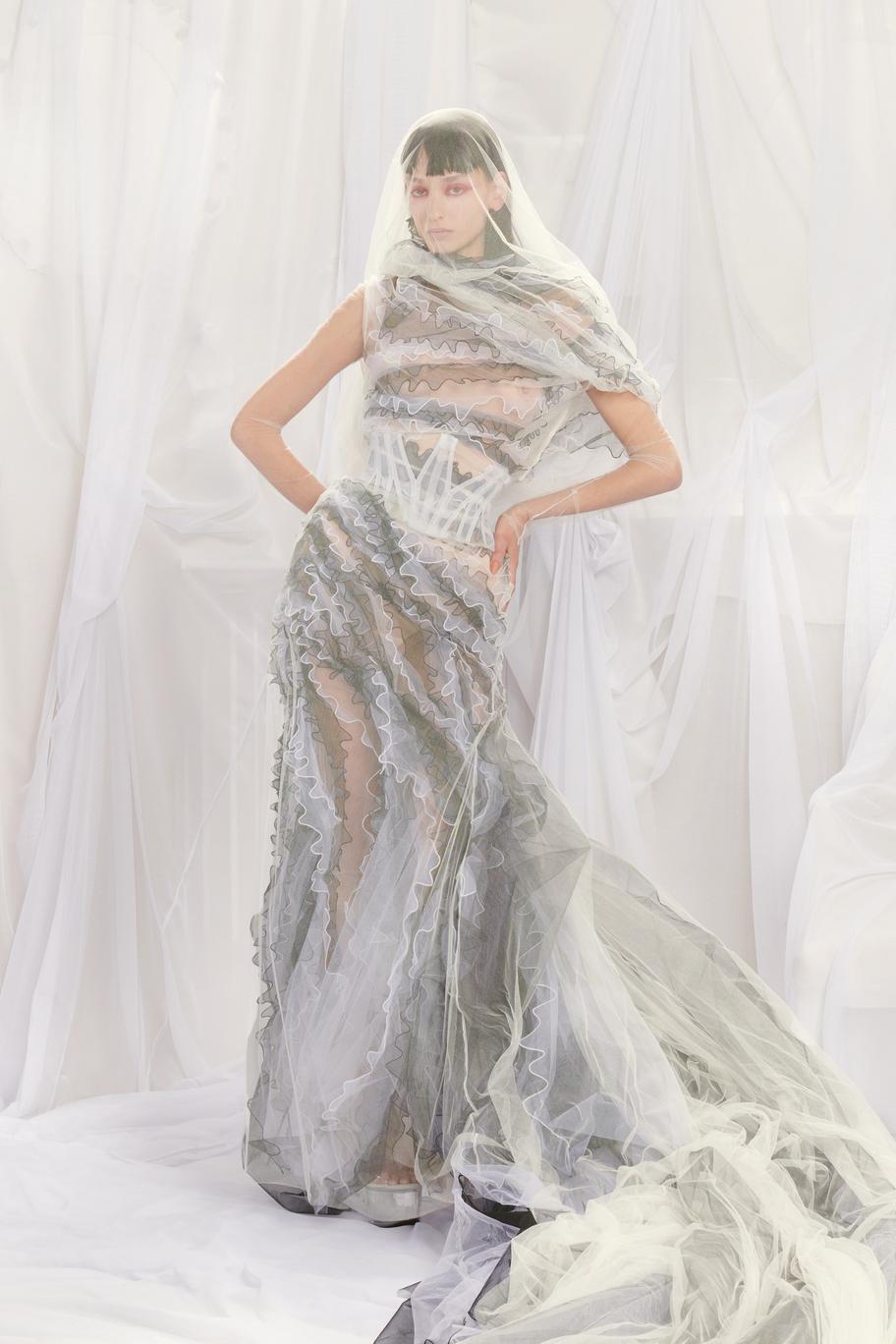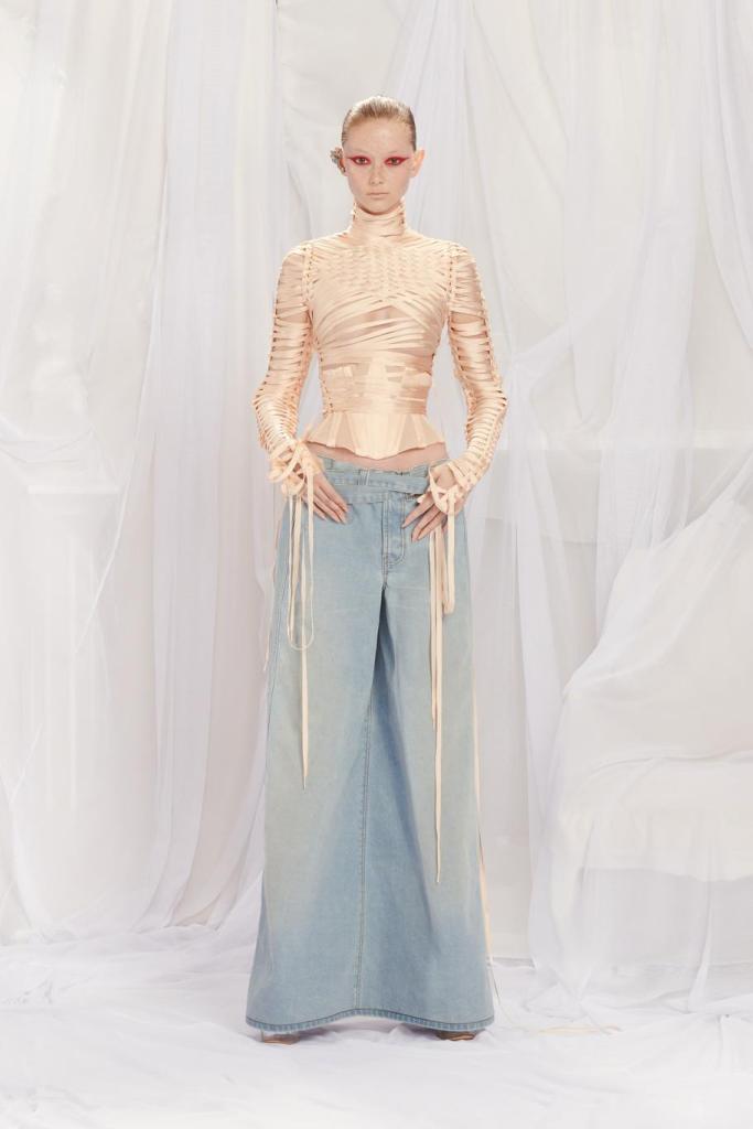 DEFILE JEAN PAUL GAULTIER x GLENN MARTENS AU SIEGE DE JPG: Depuis que Jean Paul Gaultier s’est retiré de la maison qui porte son nom en janvier 2020, les collections haute couture sont conçues en collaboration avec un designer extérieur qui change chaque saison. Après Chitose Abe (créatrice de Sacai) en juillet dernier, c’est au tour de Glenn Martens, le designer belge de Y/Project, de proposer sa vision de la couture Gaultier, chez qui il avait fait un passage en 2008. C’est ainsi qu’il a polarisé son attention sur le fameux corset, sous-vêtement captivant et élément consubstantiel à toute la carrière de Jean Paul Gaultier. Toutes les silhouettes sont corsetées et de nombreuses robes ont une longue traîne évoquant les sirènes ou les vagues. Le thème marin se trouve également décliné dans une robe fourreau entièrement brodée de coraux. De grosses mailles sculptent la silhouette comme cette robe en laine écru, dos nu avec une fente en arrière. L’emblématique marinière est déchiquetée ou décomposée en fils de fer sur une robe chair. On retrouve l’esprit Y/Project dans les constructions/déconstructions très impressionnantes et dans la touche de gothique flamboyant qui infuse les robes de madones moyenâgeuses.