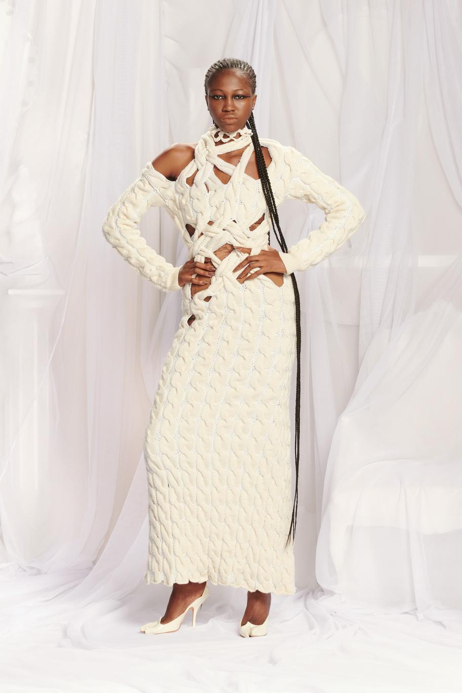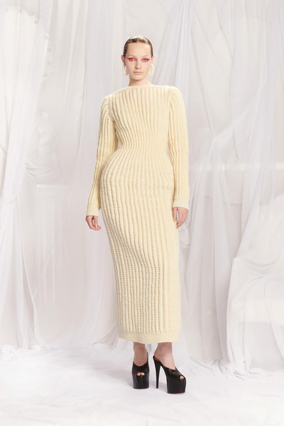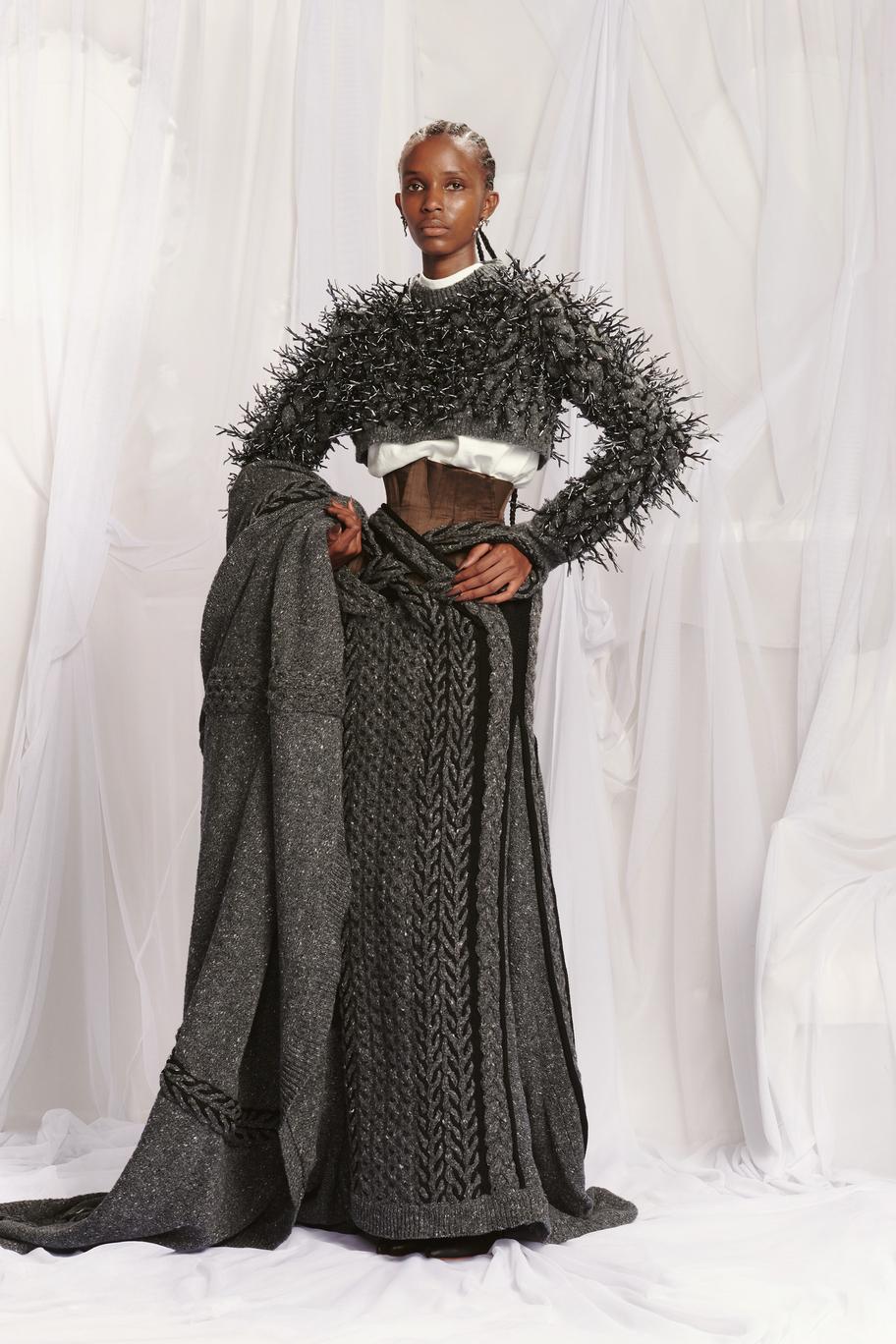 DEFILE JEAN PAUL GAULTIER x GLENN MARTENS AU SIEGE DE JPG: Depuis que Jean Paul Gaultier s’est retiré de la maison qui porte son nom en janvier 2020, les collections haute couture sont conçues en collaboration avec un designer extérieur qui change chaque saison. Après Chitose Abe (créatrice de Sacai) en juillet dernier, c’est au tour de Glenn Martens, le designer belge de Y/Project, de proposer sa vision de la couture Gaultier, chez qui il avait fait un passage en 2008. C’est ainsi qu’il a polarisé son attention sur le fameux corset, sous-vêtement captivant et élément consubstantiel à toute la carrière de Jean Paul Gaultier. Toutes les silhouettes sont corsetées et de nombreuses robes ont une longue traîne évoquant les sirènes ou les vagues. Le thème marin se trouve également décliné dans une robe fourreau entièrement brodée de coraux. De grosses mailles sculptent la silhouette comme cette robe en laine écru, dos nu avec une fente en arrière. L’emblématique marinière est déchiquetée ou décomposée en fils de fer sur une robe chair. On retrouve l’esprit Y/Project dans les constructions/déconstructions très impressionnantes et dans la touche de gothique flamboyant qui infuse les robes de madones moyenâgeuses.