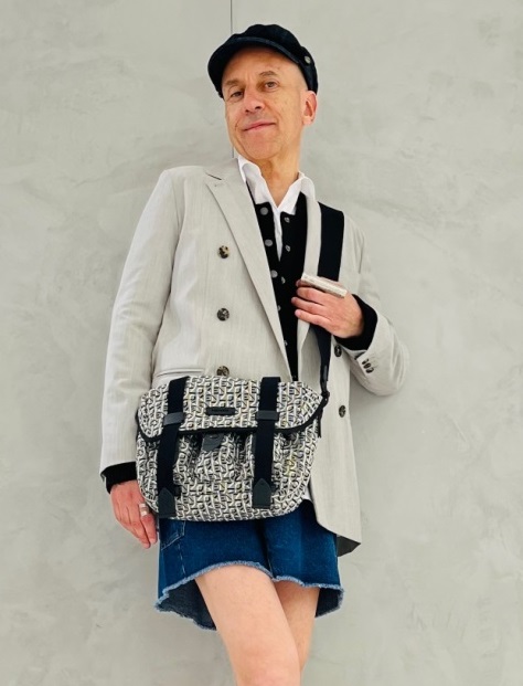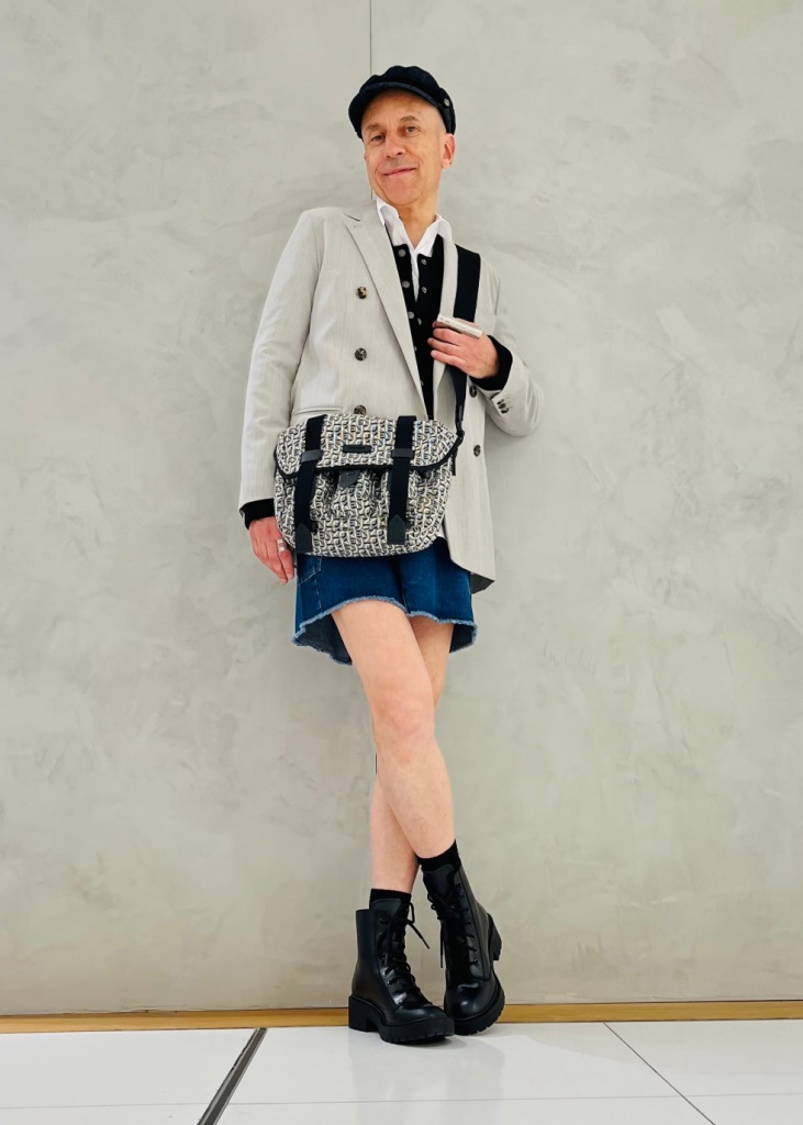 Du chic avant tout avec ce look élégant composé d’un ensemble de pièces provenant de la collection Kenzo printemps-été 2022. Ce blazer léger à double boutonnage au rendu original en est la pièce phare. Je l’ai combiné avec une jolie chemise blanche, un Teddy réversible en laine (garni d’un motif tigre tissé avec la technique jacquard au dos) et une jupe courte en denim bleu marine. Côté accessoires, de très confortables bottines à lacets Pike en cuir (avec semelle crantée et fermeture zippée discrète sur le talon qui permet de les enfiler et les ajuster facilement), un petit sac « messenger courier » en jacquard avec empiècements en cuir, très élégant et très pratique avec sa bandoulière et ses nombreuses poches. Je les ai complétés par une casquette en jean « Navy » de Zadig&Voltaire (collection antérieure) et mes bagues en métal argenté préférées de la jeune créatrice parisienne Clara Jasmine.