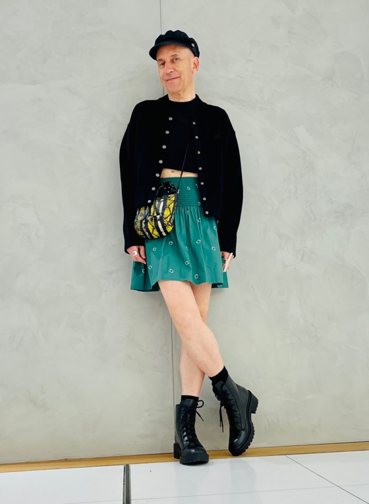 Le vert, couleur de l’été 2022? En tout cas il se marie à merveille avec une touche de jaune et du noir. Cette jolie jupe courte issue de la collection Kenzo printemps-été 2022 reprend l’imprimé « Bandana », un imprimé iconique de la maison des années 90. Pour une allure très chic je l’ai combinée avec un T-shirt court « Tiger Crest » noir en coton organique et un Teddy réversible en laine, tous deux provenant également de la collection Kenzo printemps-été 2022. Côté accessoires, des bottines à lacets en cuir Kenzo SS22, casquette en jean « Navy » et petit sac bandoulière en cuir Zadig&Voltaire (collections antérieures), bagues en métal argenté Clara Jasmine.