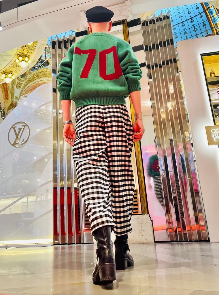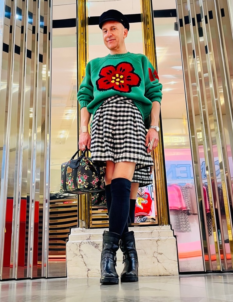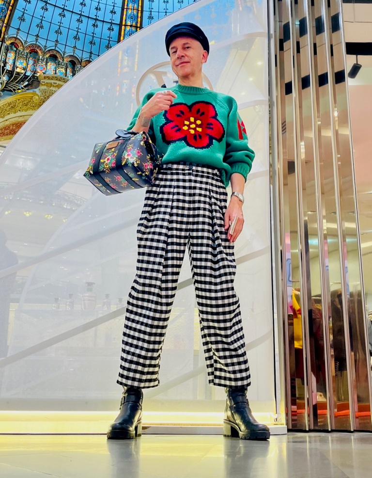 Un look festif pour les fêtes! Je vous propose ce look aux couleurs détonantes qui rebooste assurément le moral, avec deux variantes: pantalon ou short. Toutes les pièces de cette tenue proviennent de la fantastique collection Kenzo automne-hiver 2022/2023: pull « Varsity » en laine mérinos, matière douce, chaude et agréable à porter, avec une coupe décontractée et des motifs qui en font toute l’originalité; pantalon croppé vichy en laine et lin mélangés, qui revisite le motif à carreaux vichy intemporel et offre une silhouette élégante et élancée grâce à sa coupe courte, sa taille haute et ses plis; le short taille haute de même composition a une allure moderne et délicieusement féminine; sac « Courier Pop Bouquet » avec son motif floral original qui se porte à la main comme à l’épaule grâce à une bandoulière réglable et amovible. Côté accessoires: casquette en laine Galeries Lafayette, bagues et manchette en métal argenté Clara Jasmine, bottines en cuir de la marque espagnole Manas, chaussettes montantes en laine Falke pour un effet cuissardes.